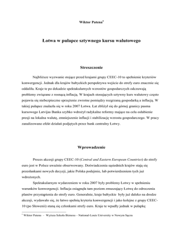 Wiktor Patena∗ Łotwa w pułapce sztywnego kursu walutowego Streszczenie NajbliŜsze wyzwanie stojące przed krajami grupy CEEC-10 to spełnienie kryteriów konwergencji. Jednak dla krajów bałtyckich perspektywa wejście do strefy euro znacznie się oddaliła. Kraje te po dekadzie spektakularnych wzrostów gospodarczych odczuwają problemy związane z rosnącą inflacją. W krajach stosujących sztywny kurs walutowy często pojawia się niebezpieczne sprzęŜenie zwrotne pomiędzy rozgrzaną gospodarką a inflacją. W takiej pułapce znalazła się w roku 2007 Łotwa. Łat zbliŜył się do górnej granicy pasma kursowego Latvijas Banka szybko wdroŜył radykalne reformy mające na celu osłabienie presji na lokalna walutę, zmniejszenie inflacji i stabilizację wzrostu gospodarczego. W pracy zanalizowano efekt działań podjętych przez bank centralny Łotwy. Wprowadzenie Proces akcesji grupy CEEC-10 (Central and Eastern European Countries) do strefy euro jest w Polsce uwaŜnie obserwowany. Doświadczenia sąsiednich krajów stają się przesłankami nowych decyzji, jakie Polska podejmie, lub potwierdzeniem tych juŜ wdroŜonych. Spektakularnym wydarzeniem w roku 2007 były problemy Łotwy w spełnieniu warunków konwergencji. Inflacja osiągnęła tam poziom zmuszający Łotwę do odroczenia planów przystąpienia do strefy euro. Generalnie, kraje bałtyckie były juŜ daleko na drodze akcesji, wydawało się, Ŝe łatwo spełnią kryteria konwergencji i jako kolejne z grupy CEEC10 (po Słowenii) staną się członkami strefy euro. Kraje te wpadły jednak w pułapkę ∗ Wiktor Patena – WyŜsza Szkoła Biznesu – National-Louis University w Nowym Sączu sztywnego kursu walutowego, który na początku przyniósł spadek inflacji i spektakularne wzrosty gospodarcze, ale na dłuŜszą metę nie pozwala prowadzić własnej polityki monetarnej. Typowym przypadkiem takiej pułapki jest Łotwa. Wcześniej sporo teŜ pisano o Litwie i Estonii, gdzie źródłem kłopotów jest system izby walutowej (Sławiński 2007). Estonia pierwotnie planowała przyjąć euro 1 stycznia 2007, w kwietniu 2006 r. rząd zmienił jednak datę docelową na 1 stycznia 2008 r.(Tabela 1). Plany Litwy takŜe zmieniły się z pierwotnej daty 1 stycznia 2007 r. W obliczu problemów ze spełnieniem kryterium inflacyjnego oba docelowe terminy są nieaktualne. Postępy poszczególnych krajów oceniane są w Raportach o Konwergencji przygotowywanych zgodnie z artykułem 122 (2) Traktatu z Maastricht. Raporty publikowane są co dwa lata (ostatni pochodzi z października 2006)1. Ponadto raporty przygotowywane są na prośbę rządów poszczególnych państw (takie raporty opublikowano na prośbę Litwy2 i Słowenii w maju 2006 r.). Tabela 1 przedstawia stopień spełniania kryteriów z Maastricht w krajach grupy CEEC-10. Tabela 1. Warunki konwergencji w krajach CEEC-10 (wytłuszczony druk oznacza spełnienie kryterium w październiku 2006 r.) Kryterium Wartość referencyjna Stopa inflacji (HICP) (%) 2004 2006 Długoterminowe stopy procentowe (%) 2004 2006 Deficyt publiczny (% PKB) 2004 2006 ZadłuŜenie publiczne (% PKB) 2004 2006 Stabilność kursu <2,4% <2,8% <6,4% <6,2% <3% <3% <60% <60% ERM II 2 lata Republika Czeska Estonia Cypr Łotwa Węgry Malta Polska Słowacja 2,6 3,0 1,9 6,2 6,8 2,7 3,6 7,5 2,2 4,75 4,39 5,8 4,86 3,8 4,1 4,1 3,9 3,0 3,7 4,1 0,9 3,6 2,3 2,3 1,9 30,4 4,5 69,2 12,1 od 28.06.2004 od 02.05.2005 od 02.05.2005 8,19 4,69 6,9 5,03 7,1 4,3 5,2 4,3 5,4 5,1 3,9 3,1 7,8 3,2 4,2 3,4 36,8 5,5 72,0 14,7 57,4 75,9 43,6 42,5 Litwa 1,2 4,3 2,3 6,7 3,5 2,8 1,2 4,3 2,7 (03.2006) 4,5 3,7 1,4 0,6 19,6 18,9 od 28.06.2004 Słowenia 3,6 2,6 4,68 3,8 2,1 1,9 29,8 29,9 spełniony 61,7 74,2 47,3 34,5 od 02.05.2005 od 28.10.2005 śródło: Convergence Report December 2006, ECB, Brussels. 1 Convergence Report December 2006, ECB, Brussels. Litwa w maju 2006 minimalnie nie spełniała warunku inflacyjnego (wartość referencyjna w marcu 2006 wynosiła 2,6%) i jej uczestnictwo w strefie euro zostało odroczone. 2 2 Wspólnym problemem gospodarek Estonii, Litwy i Łotwy jest niespełnienie jednego tylko kryterium dotyczącego stopy inflacji (Tabela 1). Najostrzej problem ten występuje w przypadku Łotwy. Odległość kilku punktów procentowych do wartości referencyjnej jest symptomem powaŜnych problemów. Łotwa utrzymuje system sztywnego kursu walutowego, który uniemoŜliwia prowadzenie aktywnej polityki monetarnej, prowadzi do importu wysokości stóp procentowych ze strefy euro, a w przypadku wystąpienia wysokiej inflacji, do utrzymywania się ujemnej realnej stopy procentowej. Na Łotwie dwa ostatnie zjawiska juŜ wystąpiły. NaleŜy zadać pytanie, czy, jak, i w jakim tempie Łotwa moŜe sobie poradzić z nadchodzącym kryzysem. I. Łotwa: spektakularny wzrost gospodarczy Łotwa to niewielki kraj (2,5 miliona mieszkańców), który z sukcesem pozbył się brzemienia bycia satelitą Rosji, zachował jednak związki ekonomiczne z sąsiadem i jednocześnie rozwinął dynamicznie handel z krajami zachodnimi (udział UE w eksporcie Łotwy to prawie 60%). W roku 2006 Łotwa była liderem wzrostu gospodarczego w Europie: z tempem wzrostu PKB na poziomie 11,9% wyraźnie wyprzedzała inne kraje bałtyckie (Estonia 11,4%, Litwa 7,5%), Polskę (5,4%), średnią europejską (2,3%) i marudera Portugalię (0%). W istocie rzeczy, Łotwa to od kilku lat najszybciej rozwijająca się gospodarka w Europie. Wykres 1: Tempo wzrostu PKB Łotwy w roku 2006 14.0% 12.0% PKB 10.0% 8.0% 6.0% 4.0% 2.0% 0.0% Portugalia EU 25 Polska Litwa Estonia Łotwa Źródło: PKPP Lewiatan 3 PKB Łotwy dynamicznie rośnie, przykładowo od 5% w roku 2002 do 11,9% w 2006 roku. Podstawy do szybkiego wzrostu dały stabilna waluta, stabilność cen jako główny cel działania banku centralnego i restrykcyjna polityka monetarna (Repse 2000). Równowaga makroekonomiczna zachęcała inwestorów, spadało bezrobocie (z 11,3% w roku 2001 do 6,5% w 2006). WaŜny