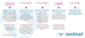 Preselekcja CV Testy umiejętności Ocena kompetencji Pracownik na zastępstwo Kupon rabatowy Odpowiednia analiza dokumentów przysyłanych przez kandydatów to przepis na sukces w rekrutacji! Dzięki preselekcji Randstad dostrzeże najlepszego kandydata na dane stanowisko spośród dziesiątek czy setek nadesłanych aplikacji. Rekomendacja kandydata dokonana będzie po analizie potrzeb Twojej firmy, zgodnie z metodologią Randstad. Umiejętności deklarowane przez aplikujących do pracy kandydatów mogą wymagać potwierdzenia w praktyce. Specjalistyczne testy przeprowadzane przez konsultantów Randstad pozwolą zweryfikować ich deklaracje i potwierdzić przydatność do pracy w Twojej firmie. Ocena dopasowania kandydata do stanowiska pracy jest kluczowa w procesie rekrutacji. Pogłębione wywiady kompetencyjne prowadzone są przez doświadczonych konsultantów podczas spotkań z wybranymi przez Ciebie kandydatami. Dzięki ocenie kompetencji otrzymasz raport zawierający rekomendacje konsultanta Randstad. Nagła nieobecność pracownika? Zwiększony zakres prac biurowych, które muszą być terminowo zrealizowane? Pracownik tymczasowy Randstad zastąpi nieobecnego pracownika lub będzie dodatkowym wsparciem w zaplanowanych przez Ciebie pracach administracyjno-biurowych. Za każde 1000 zł wydane na przeprowadzenie pierwszej rekrutacji stałej lub realizację pierwszej usługi pracy tymczasowej Twoja firma otrzyma 100 zł rabatu. Szczegóły realizacji nagrody: • preselekcja CV do 100 sztuk nadesłanych aplikacji • preselekcja dotyczyć będzie CV będących odpowiedzią na jedno stanowisko pracy Szczegóły realizacji nagrody: • testy dla grupy do 10 kandydatów oraz szczegółowy raport • testy językowe (angielski, niemiecki, francuski, włoski, hiszpański, rosyjski), dotyczące programów Word i Excel, sprawdzające sprawność psychoruchową, zdolności manualne czy rozpoznawanie kolorów Szczegóły realizacji nagrody: • ocena kompetencji do 5 kandydatów, spotkania oraz przygotowanie raportów dotyczących 3 wybranych kompetencji Szczegóły realizacji nagrody: • jednodniowe zastępstwo przez pracownika tymczasowego • szczegóły zastępstwa do ustalenia z przedstawicielem Randstad ze wstępnym wywiadem telefonicznym www.randstad.pl/pracodawca