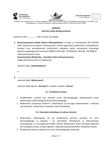 Zadanie jest realizowane w ramach projektu POPT.03.01.00-00-0001/15 współfinansowanego ze środków Unii Europejskiej, w ramach Programu Operacyjnego Pomoc Techniczna 2014-2020 UMOWA zlecenia stałej obsługi prawnej zawarta w dniu ……………. roku w Łodzi, pomiędzy: 1. Stowarzyszeniem Łódzki Obszar Metropolitalny w Łodzi, ul. Piotrkowska 104, 90-926 Łódź, wpisanym do rejestru stowarzyszeń, innych organizacji społecznych i zawodowych, fundacji oraz samodzielnych publicznych zakładów opieki zdrowotnej Krajowego Rejestru Sądowego pod numerem 0000511578, NIP: 7252076621, REGON: 101788872, reprezentowanym przez: Panią Karolinę Włodarską – Dyrektora Biura Stowarzyszenia, /odpis pełnomocnictwa w załączeniu/ zwanym dalej „Zamawiającym”, a 2. …………………………………………………………………………………………………………………….., zwanym dalej „Wykonawcą”, zwanymi dalej łącznie „Stronami”, a każda z osobna „Stroną”. § 1. Przedmiot umowy 1. Przedmiotem umowy jest zlecenie przez Zamawiającego wykonywania przez Wykonawcę stałej obsługi prawnej Zamawiającego. 2. Wykonawca przyjmuje zlecenie i zobowiązuje się do jego wykonywania z należytą starannością, rzetelnością i zasadami etyki zawodowej. § 2. Czynności wchodzące w zakres zlecenia 1. Wykonawca zobowiązuje się do świadczenia pomocy prawnej na rzecz Zamawiającego w zakresie i na warunkach określonych w dokumentacji przetargowej, a w szczególności SIWZ i ofercie Wykonawcy, które stanowią załącznik do niniejszej umowy, a także zgodnie z dalszymi postanowieniami niniejszej umowy. 2. Świadczenie pomocy prawnej na rzecz Zamawiającego obejmuje: Strona 1 z 7 a. udzielanie porad prawnych w zakresie prawa unijnego, prawa polityki regionalnej UE, realizacji Zintegrowanych Inwestycji Terytorialnych, b. sporządzanie projektów pism związanych z realizacją i wdrażaniem Strategii Rozwoju Łódzkiego Obszaru Metropolitalnego 2020+, w zakresie wymagającym wiedzy z zakresu prawa, c. reprezentowanie w postępowaniach rejestrowych, d. przygotowanie lub opiniowanie projektów umów, e. udział w negocjacjach wymagających wiedzy z zakresu prawa, f. udział w spotkaniach, naradach i posiedzeniach Zamawiającego celem czuwania nad ich zgodnością z przepisami prawa oraz w celu udzielania bieżących porad prawnych, g. wykonywania innych zadań określonych przez Zarząd lub Dyrektora Biura Stowarzyszenia w zakresie wymagającym wiedzy z zakresu prawa, h. zastępstwo procesowe Zamawiającego przed sądami, urzędami oraz innymi organami i. wykonywanie innych czynności radcowskich, według potrzeb Zamawiającego, związanych z obsługą prawną Zamawiającego. § 3. Miejsce wykonywania zlecenia 1. Pomoc prawna będzie świadczona w następujący sposób: a. przynajmniej 1 (jeden) radca prawny bądź adwokat będzie świadczyć obsługę prawną w wymiarze 5 (pięć) godzin dziennie, co najmniej 2 (dwa) dni robocze w tygodniu – w siedzibie Zamawiającego; b. przynajmniej 1 (jeden) radca prawny bądź adwokat będzie dostępny w pozostałe dni robocze tygodnia poza siedzibą Zamawiającego, celem udzielania konsultacji, stosowanie do potrzeb Zamawiającego. 2. Szczegółowe godziny dyżurów zostaną uzgodnione pomiędzy Stronami po zawarciu niniejszej umowy. § 4. Poufność 1. W ramach niniejszej umowy zlecenia Wykonawca zobowiązuje się do traktowania wszelkich informacji udzielanych mu przez Zamawiającego jako poufnych. 2. Wykonawca zobowiązuje się do nieujawniania poufnych informacji osobom trzecim oraz do nieużywania takich informacji lub ich części, chyba że będzie to konieczne w związku ze świadczeniem usług na rzecz Zamawiającego albo będzie dopuszczone prawem (z uwzględnieniem przepisów o tajemnicy adwokackiej i tajemnicy radcy prawnego) i zarazem wymagane na podstawie powszechnie obowiązujących przepisów prawa na skutek rozstrzygnięcia organu prowadzącego postępowanie sądowe, przygotowawcze albo administracyjne – zależnie od przypadku. Strona 2 z 7 3. Wykonawca zobowiązuje się do ograniczenia liczby pracowników mających dostęp do informacji poufnych do pracowników, dla których korzystanie z informacji poufnych jest niezbędne do realizacji niniejszej umowy. 4. Wykonawca zobowiązuje się dołożyć należytej staranności w celu zapewnienia zachowania poufności powyższych informacji przez jego pracowników. 5. Wykonawca nie będzie wykonywał ani nie zezwoli na wykonywanie kopii, odpisów, wyciągów z jakichkolwiek dokumentów, chyba, że będzie to niezbędne do realizacji niniejszej umowy. 6. Wykonawca zapewni do obsługi Zamawiającego bezpieczny system komputerowy, obejmujący urządzenia kontroli antywirusowej, system backupowy na wypadek uszkodzenia pamięci serwera oraz bezpieczną pocztę elektroniczną. 7. Po wykonaniu usług, lub w każdym czasie na żądanie Zamawiającego, Wykonawca zwróci wszelkie informacje, dokumenty, kopie związane ze świadczoną usługą. 1. 2. 3. 4. 5. 6. 7. 8. § 5. Warunki wykonywania zlecenia Strony ustalają, że czynności wskazane w § 2 umowy będą przez Wykonawcę wykonywane w języku polskim lub angielskim, zależnie od okoliczności i potrzeb Zamawiającego. Zamawiający zobowiązuje się przez czas trwania umowy do niezwłocznego bieżącego informowania Wykonawcy o wszelkich nowych okolicznościach mających związek ze świadczoną pomocą prawną. Zamawiający będzie w terminach wskazanych przez sąd regulował żądane przez sąd płatności. Zamawiający będzie dokonywał, na wezwanie Wykonawcy, płatności z tytułu kosztów sądowych. Koszty łączności Wykonawcy związane z wykonywaniem niniejszej umowy obciążają Wykonawcę. Koszty Wykonawcy związane z wykonywaniem niniejszej umowy, a obejmujące koszty przejazdów poza teren granic administracyjnych m. Łodzi, z wyłączeniem kosztów przejazdów do siedziby Zamawiającego, kos