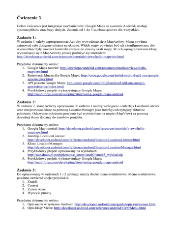 Ćwiczenie 3 Celem ćwiczenia jest integracja mechanizmów: Google Maps na systemie Android, obsługi systemu plików oraz bazy danych. Zadania od 1 do 5 są obowiązkowe dla wszystkich. Zadanie 1: W zadaniu 1 należy zaprogramować Activity wywodzące się z MapActivty. Mapa powinna zajmować całe dostępne miejsce na ekranie. Widok mapy powinien być tak skonfigurowany, aby wyświetlane były również kontrolki służące do zmiany skali mapy. W celu oprogramowania klasy wywodzącej się z MapActivity proszę posłużyć się tutorialem: http://developer.android.com/resources/tutorials/views/hello-mapview.html Przydatne dokumenty online: 1. Google Maps tutorial: http://developer.android.com/resources/tutorials/views/hellomapview.html 2. Rejestracja klucza dla Google Maps: http://code.google.com/intl/pl/android/add-ons/googleapis/mapkey.html 3. API pakietu Google Maps: http://code.google.com/intl/pl/android/add-ons/googleapis/reference/index.html 4. Przykładowy projekt wykorzystujący Google Maps: http://mobiforge.com/developing/story/using-google-maps-android Zadanie 2: W zadaniu 2, klasę Activity opracowaną w zadaniu 1 należy wzbogacić o interfejs LocationListener oraz zarejestrować klasę za pomocą LocationManager jako interfejs odczytujący aktualne położenie. Odczytane położenie powinno być wyświetlone na mapie (MapView) za pomocą dowolnej ikony dodanej do zasobów projektu. Przydatne dokumenty online: 1. Google Map tutorial: http://developer.android.com/resources/tutorials/views/hellomapview.html 2. Interfejs LocationListener: http://developer.android.com/reference/android/location/LocationListener.html 3. Klasa LocationManager: http://developer.android.com/reference/android/location/LocationManager.html 4. Przykładowy projekt opracowany na wykładach: http://neo.dmcs.pl/podyplomowe_smtm/smob3/smob3_wyklad.zip 5. Przykładowy projekt wykorzystujący Google Maps: http://mobiforge.com/developing/story/using-google-maps-android Zadanie 3: Do opracowanej w zadaniach 1 i 2 aplikacji należy dodać menu kontekstowe. Menu kontekstowe powinno zawierać opcje (przyciski): 1. Znajdź 2. Centruj 3. Zmień ikonę 4. Wyczyść punkty Przydatne dokumenty online: 1. Opis menu w systemie Android: http://developer.android.com/guide/topics/ui/menus.html 2. Opis klasy Menu: http://developer.android.com/reference/android/view/Menu.html Zadanie 4, opcja „Znajdź”: Po wybraniu z menu kontekstowego opcji „Znajdź” powinno być uruchomione nowe Activity zawierające jedno pole edycyjne (TextEdit) i jeden przycisk (Button) „Znajdź”. Po wpisaniu w polu edycyjnym szukanego adresu i wciśnięciu przycisku „Znajdź” aplikacja powinna wykonać następujące akcje: 1. Wpisany w pole edycyjne adres przesłać jako zapytanie HTTP GET do serwisu Google realizującego usługę geocoding 2. Odczytać odpowiedź w formacie JSON i wydobyć informacje o fizycznej lokalizacji adresu (pole "location" i pola "lat" oraz "lng" w otrzymanej odpowiedzi JSON) 3. Otrzymane współrzędne zwrócić jako obiekt Bundle w wiadomości Intent do głównego Activity aplikacji, wywodzącego się z MapActivity 4. W głównym Activity aplikacji należy za pomocą ikony oznaczyć szukany punkt na mapie. Nie należy przy tym usuwać wcześniej dodanych punktów oraz własnej lokalizacji Przydatne dokumenty online: 1. Opis i API usługi Google Geocoding: http://code.google.com/intl/pl/apis/maps/documentation/geocoding/ 2. Opis pakietu org.json: http://developer.android.com/reference/org/json/packagesummary.html 3. Przykład parsowania struktury JSON: http://www.androidcompetencycenter.com/2009/10/json-parsing-in-android/ Zadanie 5, opcja „Centruj”: Po wybraniu opcji centruj widok mapy powinien być zmniejszony do skali w której wszystkie punkty dodane do mapy będą widoczne jednocześnie na ekranie. Należy do tego wykorzystać wbudowane w API Google Maps funkcje. Zadanie 6, opcja „Zmień ikonę”: Po wybraniu opcji „Zmień ikonę” z menu kontekstowego powinno pokazać się nowe Activity z możliwością wybrania pliku graficznego (ikony), który będzie wykorzystywany do zaznaczania wybranych punktów na mapie. Ponieważ Android nie ma wbudowanego dialogu obsługującego wybieranie plików z systemu plików to w ramach projektu należy wykorzystać aplikację Android File Dialog. Po wybraniu nowej ikony wszystkie punkty na mapie muszą być odrysowane przy użyciu tej ikony. Ikona ta staje się domyślną i nowe punkty, dodawane przez użytkownika później również mają być wyświetlane za pomocą wybranej ikony. Przydatne dokumenty online: 1. Aplikacja Android File Dialog wraz z opisem API: http://code.google.com/p/android-filedialog/ Zadanie 7, opcja „Wyczyść punkty”: Po wybraniu opcji „Wyczyść punkty”, wszystkie punkty na mapie poza aktualna pozycją mają być usunięte. Zadanie 8: Opracowaną aplikację należy wzbogacić o możliwość zapisywania aktualnie wyświetlonych punktów do bazy danych SQLite. Celem zadania 8 jest opracowanie mechanizmu, który przy ponownym uruchomieniu aplikacji wyświetli wszystkie punkty na mapie, które zostały do tej pory dodane. Uwaga: wybranie opcji „Wyczyść punkty” powinno również usuwać punkty z bazy danych.