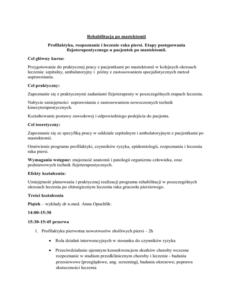 Rehabilitacja po mastektomii Profilaktyka, rozpoznanie i leczenie raka piersi. Etapy postępowania fizjoterapeutycznego u pacjentek po mastektomii. Cel główny kursu: Przygotowanie do praktycznej pracy z pacjentkami po mastektomii w kolejnych okresach leczenia: szpitalny, ambulatoryjny i późny z zastosowaniem specjalistycznych metod usprawniania. Cel praktyczny: Zapoznanie się z praktycznymi zadaniami fizjoterapeuty w poszczególnych etapach leczenia. Nabycie umiejętności usprawniania z zastosowaniem nowoczesnych technik kinezyterapeutycznych. Kształtowanie postawy zawodowej i odpowiedniego podejścia do pacjenta. Cel teoretyczny: Zapoznanie się ze specyfiką pracy w oddziale szpitalnym i ambulatoryjnym z pacjentkami po mastektomii. Omówienie programu profilaktyki, czynników ryzyka, epidemiologii, rozpoznania i leczenia raka piersi. Wymagania wstępne: znajomość anatomii i patologii organizmu człowieka, oraz podstawowych technik fizjoterapeutycznych. Efekty kształcenia: Umiejętność planowania i praktycznej realizacji programu rehabilitacji w poszczególnych okresach leczenia po chirurgicznym leczeniu raka gruczołu piersiowego. Treści kształcenia Piątek – wykłady dr n.med. Anna Opuchlik: 14:00-15:30 15:30-15:45 przerwa 1. Profilaktyka pierwotna nowotworów złośliwych piersi – 2h Rola działań interwencyjnych w stosunku do czynników ryzyka Przeciwdziałanie ujemnym konsekwencjom skutków choroby wczesne rozpoznanie w stadium przedklinicznym choroby i leczenie - badania przesiewowe (przeglądowe, ang. screening), badania okresowe; poprawa skuteczności leczenia Przeciwdziałanie nasilaniu się inwalidztwa lub zejściu śmiertelnemu chorych, którzy nie mogą być wyleczeni; działania rehabilitacyjne zmniejszające stopień inwalidztwa; zapobieganie niepomyślnej ewolucji procesu choroboweg 15:45-17:15 17:15-17:30 przerwa 2. Epidemiologia, etiologia i czynniki ryzyka raka piersi – 2h Dane epidemiologiczne z Polski i świata Czynniki ryzyka zachorowań: płeć, geograficzne, genetyczne, wiek, styl życia i inne 3. Objawy kliniczne i patomorfologia - 1h Podział kliniczny i histopatologiczny raka piersi Łagodne i złośliwe zmiany gruczołu piersiowego 17:30-21:15 4. Rozpoznanie raka sutka- 2h Badanie podmiotowe i przedmiotowe Badanie przesiewowe Badania obrazowe (mammografia, ultrasonografia i inne) Badania mikroskopowe (biopsja aspiracyjna) 5. Kompleksowe postępowanie w przypadku obrzęku limfatycznego kończyny górnej po stronie operowanej -2h Definicja obrzęku limfatycznego, rozpoznanie, postacie niewydolności układu limfatycznego i podział obrzęków chłonnych Metodyka Kompleksowej Fizycznej Terapii Udrażniającej oraz innych zabiegów fizjoterapeutycznych wspomagających terapię 6. Przeciwwskazania do zabiegów fizykoterapeutycznych-1h Sobota – wykłady dr n.med. Anna Włoch: 9:00-12:00 1. Zapoznanie się metodami leczenia chirurgicznego i rodzajami zabiegów odtwórczych piersi2h ● operacje oszczędzające ● operacje radykalne ● zabiegi paliatywne ● techniki zabiegów odtwórczych 2. Leczenie miejscowe i systemowe po zabiegu chirurgicznym-2h ● radioterapia ● chemioterapia ● hormonoterapia 12:00-12:30 przerwa 12:30-14:45 3. Szczegółowe omówienie programu rehabilitacji obejmującego fizjoterapię w następujących okresach leczenia-6h ● szpitalny( przed i pooperacyjny) ● ambulatoryjny 14:45-15:00 przerwa 15:00-17:15 ● późny( zajęcia ogólno usprawniające w klubie amazonek) Niedziela – ćwiczenia dr n.med. Anna Włoch: 9:00-10:30 10:30-10:45 przerwa 1. Zapoznanie się z praktycznymi zadaniami fizjoterapeuty w poszczególnych okresach leczenia pacjentek po mastektomii-2h 10:45-13:00 13:00-13:30 przerwa 13:30-17:15 2. Przedstawienie modelu postępowania fizjoterapeutycznego w zastosowaniu specjalistycznych metod usprawniania-8h. ● PIR mobilizacje i masaż blizny ● elementy metody PNF ● elementy aplikacji metody KINESIOLOGY TAPING ● elementy terapii manualnej Literatura podstawowa 1.Bachynĕ M.: Obrzęk limfatyczny i sposoby jego leczenia, Fizjoterapia, 2001, 9, 4, 3-10 2. Földi M., Strößenreuther R.: Podstawy manualnego drenażu limfatycznego, Wyd. Med. Urban & Partner, Wrocław, 2005 3. Górnaś M.: Rak piersi – współczesna diagnostyka i leczenie, 40 Kongres Amerykańskiego Towarzystwa Onkologii Klinicznej, Współ. Onk., 2004, 8, 8, 398402 4. Góźdź S., Siudowska U., Lis K.: Epidemiologia nowotworów złośliwych w województwie świętokrzyskim w latach 1988-2002, Ś.C.O., Kielce 2005, 5. Jeziorski A.: Rak piersi, Onkologia podręcznik dla studentów i lekarzy, red. Kordek R., Wyd. Medical Press, Gdańsk, 2003, 167-169 6. Kułakowski A., Towpik E.: Zasady rozpoznawania i leczenia nowotworów zalecane przez Centrum Onkologii w Warszawie, Wyd. Pol. Fund. Europ. Szkoł. Onkol., Warszawa, 1997 7. Nelson M.: Rozpoznawanie raka sutka. Badania przesiewowe i ocena, Med. Po Dypl., 2001,10,6,141-148 8. Mika K. Po odjęciu piersi PZWL Warszawa 2005 Literatura uzupełniająca 1. Pawlicki M.: Rak piersi – nowe nadzieje i możliwości leczenia , Wyd. α – Medica Press, Bielsko-Biała, 2002 2. Pieńkowski T.: Rak piersi, Onkologia Kliniczna, red. Krzakowski M., Wyd. Medyczne Borgis, Warszawa 2001 3. Levit K. Terapia Manualna Wyd. Zdrowie, Kielce 1999. 4. Woźniewski M. Usprawnianie kończyny w przebiegu leczenia raka sutku u kobiet . Wrocław 1999 Metody dydaktyczne: wykłady - prezentacje, ćwiczenia w pracowni fizjoterapii z zajęciami praktycznymi, warsztaty w podgrupach. Forma zaliczenia: zaliczenie z oceną Metody oceny pracy: wykłady – egzamin pisemny, ćwiczenia – ocena umiejętności, kompetencji w trakcie doboru metod fizjoterapii u pacjentek po mastektomii