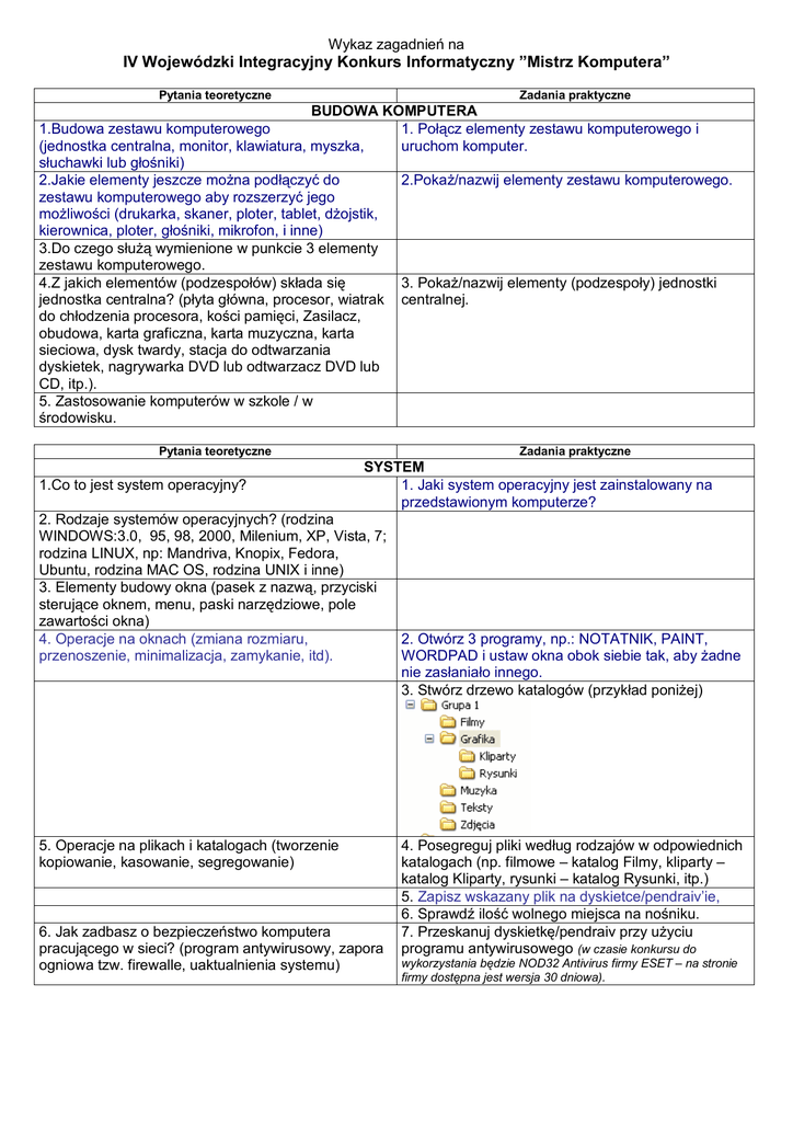 Wykaz zagadnień na IV Wojewódzki Integracyjny Konkurs Informatyczny ”Mistrz Komputera” Pytania teoretyczne Zadania praktyczne BUDOWA KOMPUTERA 1.Budowa zestawu komputerowego 1. Połącz elementy zestawu komputerowego i (jednostka centralna, monitor, klawiatura, myszka, uruchom komputer. słuchawki lub głośniki) 2.Jakie elementy jeszcze można podłączyć do 2.Pokaż/nazwij elementy zestawu komputerowego. zestawu komputerowego aby rozszerzyć jego możliwości (drukarka, skaner, ploter, tablet, dżojstik, kierownica, ploter, głośniki, mikrofon, i inne) 3.Do czego służą wymienione w punkcie 3 elementy zestawu komputerowego. 4.Z jakich elementów (podzespołów) składa się 3. Pokaż/nazwij elementy (podzespoły) jednostki jednostka centralna? (płyta główna, procesor, wiatrak centralnej. do chłodzenia procesora, kości pamięci, Zasilacz, obudowa, karta graficzna, karta muzyczna, karta sieciowa, dysk twardy, stacja do odtwarzania dyskietek, nagrywarka DVD lub odtwarzacz DVD lub CD, itp.). 5. Zastosowanie komputerów w szkole / w środowisku. Pytania teoretyczne 1.Co to jest system operacyjny? Zadania praktyczne SYSTEM 1. Jaki system operacyjny jest zainstalowany na przedstawionym komputerze? 2. Rodzaje systemów operacyjnych? (rodzina WINDOWS:3.0, 95, 98, 2000, Milenium, XP, Vista, 7; rodzina LINUX, np: Mandriva, Knopix, Fedora, Ubuntu, rodzina MAC OS, rodzina UNIX i inne) 3. Elementy budowy okna (pasek z nazwą, przyciski sterujące oknem, menu, paski narzędziowe, pole zawartości okna) 4. Operacje na oknach (zmiana rozmiaru, 2. Otwórz 3 programy, np.: NOTATNIK, PAINT, przenoszenie, minimalizacja, zamykanie, itd). WORDPAD i ustaw okna obok siebie tak, aby żadne nie zasłaniało innego. 3. Stwórz drzewo katalogów (przykład poniżej) 5. Operacje na plikach i katalogach (tworzenie kopiowanie, kasowanie, segregowanie) 6. Jak zadbasz o bezpieczeństwo komputera pracującego w sieci? (program antywirusowy, zapora ogniowa tzw. firewalle, uaktualnienia systemu) 4. Posegreguj pliki według rodzajów w odpowiednich katalogach (np. filmowe – katalog Filmy, kliparty – katalog Kliparty, rysunki – katalog Rysunki, itp.) 5. Zapisz wskazany plik na dyskietce/pendraiv’ie, 6. Sprawdź ilość wolnego miejsca na nośniku. 7. Przeskanuj dyskietkę/pendraiv przy użyciu programu antywirusowego (w czasie konkursu do wykorzystania będzie NOD32 Antivirus firmy ESET – na stronie firmy dostępna jest wersja 30 dniowa). Pytania teoretyczne Zadania praktyczne RYSOWANIE 1.Jakie znasz edytory grafiki? (np.: Paint, Gimp, 1. Narysuj w Paint’cie 4 figury, np. niebieski kwadrat, Photoshop) zółty trójkąt, zielony prostokąt i czerwone koło (uwaga! Nie owal!). 2. Rodzaje plików/formatów graficznych? (bmp, gif, 2. Zapisz rysunek w podanym (bmp, gif, jpg) formacie jpg) graficznym? 3. Określ zalety i wady podanych w pkt. 2 formatów 3. Narysuj podobizny osób Twojego zespołu. graficznych. 4. Narysuj element graficzny i poprzez kopiowanie i wklejanie oraz powiększanie i pomniejszanie stwórz kompozycję składającą się z 5 takich elementów. 5. Narysuj motyla wykorzystując odbicie lustrzane, poprzez kopiowanie wykonaj 4 kopii, które przez modyfikację (obrót, pochylenie, powiększenie i pomniejszenie) za każdym razem będą inne. Pytania teoretyczne Zadania praktyczne PISANIE 1. Jakie znasz edytory tekstu? (np.: Notatnik, 1. Napisz swoje imię i nazwisko 10 razy za każdym WordPad, Word, Works, Writer z pakietu Open Office) razem używając innej wielkości liter, czcionki, stylu i koloru liter. 2. Rodzaje plików/formatów tekstowych? (txt, doc, rtf, 2. Przepisz tekst z zastosowaniem zasad tworzenia docx, wps) dokumentów tekstowych (duże i małe litery, polskie znaki, znaki interpunkcyjne, odstępy) i zapisz plik na pulpicie – praca na czas! (2 osoby: dyktująca i pisząca). 3. Sformatuj podany tekst ogłoszenia, dodaj elementy graficzne pobrane z internetu i wydrukuj pracę wybierając odpowiednią drukarkę! 3. Co to jest? 4. Stwórz jednostronicowy dokument tekstowy - akapit, (życiorys) z fotografiami o wybranym sławnym - justowanie, Polaku. Dane pobierz z internetu. - kursywa, - w jakich jednostkach podajemy wielkość czcionki? - podaj przykładowe nazwy czcionek, - jak możemy wyrównać tekst? - jak uzyskać polskie znaki diakrytyczne (np. ą, ż, ź, ł), - jak uzyskać duże litery, - ile stawiamy odstępów pomiędzy wyrazami? Pytania teoretyczne Zadania praktyczne INTERNET 1. Co to jest internet? (sieć komputerowa, gdzie 1. Wyszukiwanie grafiki w internecie i zapis na dysku niektóre komputery udostępniają pewne zasoby – komputera. serwery, a inne przeglądają te zasoby) 2. Co to jest wyszukiwarka internetowa? Jakie znasz 2. Wyszukiwanie danych tekstowych w internecie i wyszukiwarki? ( Google, Szukacz, itd.) zapis na dysku komputera. 3. Niebezpieczeństwa związane z komputerem i 3. Logowanie się na podane konto pocztowe (na technologią komputerową (grooming, cyberprzemoc, O2.PL) i sprawdzanie poczty oraz wysyłanie poczty spam, phishihg). wraz z załącznikami. Zadania: - przesłanie wiadomości grupie, - przesłanie pracy jako załącznika na podany adres mailowy, 4. Sprawdzić pogodę dla podanego miasta na dzisiaj. 5. Sprawdzić kursy walut. 6. Wyszukiwanie najniższej ceny określonego produktu konsumpcyjnego (np. pralki, telewizora, aparatu fotograficznego, itp.) Pytania teoretyczne Zadania praktyczne PREZENTACJE 1. Stwórz ciekawą pięcioslajdową prezentację z wykorzystaniem rysunków z Paint’a. Wskazane wykorzystanie animacji. Pytania teoretyczne Zadania praktyczne ARKUSZ KALKULACYJNY 1. Co to jest adres komórki. Podaj przykłady adresów. 1. Stwórz wzory na obliczanie podstawowych działań matematycznych (dodawanie, odejmowanie, mnożenie i dzielenie) i wykonaj obliczenia podanych przykładów. 2. Jak nazywają się kolumny, a jak wiersze w arkuszu 2. Na podstawie podanych ocen stwórz wzór na kalkulacyjnym. obliczanie średniej i