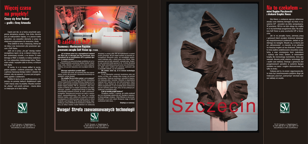 Wi´cej czasu na projekty! Na to czeka∏em – mówi Bogdan Pieczkowski Cieszy si´ Artur Bodnar – grafik z firmy Artmedia Gdy klienci, a zw∏aszcza agencje reklamowe zacz´∏y coraz dobitniej domagaç si´ druku w sysytemie CtP - poczu∏em si´ lekko zaniepokojony. W promieniu 100 km nie by∏o nikogo kto móg∏by mi w tej technologii przygotowaç p∏yty. Na szcz´Êcie Soft Vision w por´ uruchomi∏o CtP w Szczecinie. Jak to na poczàtku bywa, pierwszà prac´ z gotowych blach zaczà∏em drukowaç obawiajàc si´ niespodziewanych problemów. Jednak nic podobnego nie nastàpi∏o. Okaza∏o si´, ˝e blacha jest ju˝ „zaktywowana“, co znaczy∏o, ˝e po za∏oêeniu na maszyn´ mog∏em od razu drukowaç. Zaskoczy∏o mnie szybkie ustabilizowanie stosunków wodafarba, a wi´c zmniejszenie iloÊci makulatury i szybszy czas druku. Dodam, ˝e drukowa∏em ksià˝k´ dla niemieckiego kontrahenta, który jako warunek zlecenia poda∏ w∏aÊnie technologi´ CtP i szybki czas realizacji. Drukujàc z gotowych p∏yt przygotowanych uprzednio w systemie Apogee zyska∏em na czasie i mog∏em skoncentrowaç si´ tylko na druku. Ciekawe jest to, ˝e umyta i zagumowana p∏yta mo˝e byç przechowywana podobnie d∏ugo jak tradycyjna, poza tym „wytrzymuje“ ona du˝o wy˝sze nak∏ady ni˝ zwyk∏a. Cz´sto jest tak, ˝e w koƒcu przychodzi upragniona akceptacja projektu. Czas druku zlecenia jest ju˝ maksymalnie napi´ty, a tu jeszcze trzeba sprawdziç, czy wszystkie elementy w pracy sà w∏aÊciwie przygotowane do Êwiecenia i druku. Teraz zadanie to wraz z impozycjà, (której tak nie lubi´,) oraz Êwieceniem p∏yt powierzam specom z Soft Vision. JeÊli coÊ w pracy „nie gra“ dostaj´ mailem szczegó∏owy raport, ˝e np. w danym miejscu u˝y∏em systemowej czcionki, a na stronie 15 mam bitmap´ w RGB i w dodatku w niskiej rozdzielczoÊci i nie rozbarwi∏em dodatkowego koloru. Poprawiam wtedy i wysy∏am tylko te strony, w których by∏y b∏´dy. W sumie, to o co musz´ zadbaç to wyciàgni´cie spadów i zrobienie postscriptu. Plik PDF z gotowà impozycjà dostaj´ mailem i odsy∏am do drukarni, aby si´ upewniç, ˝e praca jest przygotowana zgodnie z ustaleniami. Podoba mi si´ to, ˝e za weryfikacj´ pracy i impozycj´ nie ponosz´ ˝adnych dodatkowych op∏at i mam wi´cej czasu na projekty. Wysoko oceniam te˝ „sherpy“ czyli proofy cyfrowe – równie dobre co tradycyjne za to du˝o taƒsze. z drukarni Graphic House O zaletach CtP Rozmowa z Mariuszem Rajskim prezesem zarzàdu Soft Vision sp. z o.o. Ju˝ od dawna mówi si´ o niewàtpliwych zaletach CtP. Skoro tak, to dlaczego jest Pan pierwszym, ktory zdecydowa∏ si´ na uruchomienie CtP w systemie Apogee, w naszym mieÊcie? O przejÊciu na nowà technologi´ myÊleliÊmy ju˝ od roku. PrzeprowadziliÊmy gruntownà analiz´ kosztów eksploatacji, rynku, klientów i ich potrzeb a˝ w koƒcu zadecydowaliÊmy, ˝e to ju˝ jest najwy˝szy czas na podj´cie takiej decyzji. Dlaczego wybraliÊcie produkt Agfy? Powodów by∏o wiele, ale wymieni´ tylko dwa najwa˝niejsze: prosta, ale precyzyjna i niezawodna konstrukcja naÊwietlarki i system Apogee. Czy móg∏by Pan po krótce opisaç, co to oznacza? Oznacza to, ˝e prace naszych klientów naÊwietlamy cyfrowo bezpoÊrednio na p∏yt´ offsetowà. Apogee jest systemem, który pozwala prowadziç i kontrolowaç zlecenie na ka˝dym etapie produkcji. Plik do „Êwiecenia“, który otrzymujemy od klienta jest na wst´pie sprawdzany pod kàtem: obecnoÊci „spadów“, wyst´powania bitmap w trybie RGB, prawid∏owego osadzenia czcionek, itp. wielu „pressowych“ szczegó∏ów. Automatycznie tworzony jest raport o ewentualnych nieprawid∏owoÊciach, który mo˝e byç wys∏any klientowi mailem. JeÊli z plikiem jest wszystko w porzàdku przyst´pujemy do elektronicznego monta˝u pracy w arkusz drukarski, czyli impozycji. W ten sposób eliminujemy, niepotrzebnà ju˝, prac´ sk∏adacza lub monta˝ysty w drukarni. Gotowy ju˝ arkusz mo˝emy wys∏aç klientowi do ostatecznej akceptacji w postaci pliku PDF lub wydrukowaç w postaci proofa cyfrowego. Na tym etapie mo˝liwe sà poprawki poszczególnych elementów pracy, nie wymagajàce generowania kolejnego pliku z ca∏oÊci pracy przez klienta. Dalej, pozostaje nam ju˝ tylko naÊwietliç i wywo∏aç p∏yty. Dodam, ˝e czas wykonania takiej operacji to ok. 3 minuty dla jednej p∏yty. Ka˝da naÊwietlona praca jest przez nas archiwizowana, dzi´ki czemu mo˝liwe jest ponowne wykonanie p∏yt w przypadku dodruku, czy ich uszkodzenia. Ale jednak, mówi si´, ˝e ta nowsza technologia jest dro˝sza... To mit! Nominalnie centymetr kwadratowy p∏yty jest dro˝szy od filmu, ale z samego filmu niczego si´ przecie˝ nie wydrukuje. Trzeba go zmontowaç, naÊwietliç w kopioramie tradycyjne p∏yty i wywo∏aç. Wszystko to niepotrzebnie anga˝uje ludzi i zajmuje czas i jest ma∏o precyzyjne. Cz´sto dopiero w druku okazuje si´, ˝e nie zawsze p∏yta zosta∏a dobrze przygotowana. U nas na ka˝dej p∏ycie umieszczony jest tzw. kontrolny pasek Fogra, który od razu pokazuje prawid∏owoÊç naÊwietlenia p∏yty. A jak t´ nowink´ przyj´li drukarze? Poczàtkowo nieufnie i z rezerwà, ale szybko przekonali si´, ˝e to technologia w∏aÊnie dla nich. Zacytuj´ tu autentyczne s∏owa jednego z drukarzy: „Panie Mariuszu, ja si´ nie spodziewa∏em, ˝e na moim starym Romayorze mog´ w kolorze wydrukowaç takie rzeczy ...“. Dzi´kuj´ za rozmow´. Uwaga! Strefa zaawansowanych technologii 70-101 Szczecin, ul. Madaliƒskiego 9 tel. (091) 485 48 73 • fax (091) 483 77 41 www.softvision.pl; e-mail: [email protected] 70-101 Szczecin, ul. Madaliƒskiego 9 tel. (091) 485 48 73 • fax (091) 483 77 41 www.softvision.pl; e-mail: [email protected] 70-101 Szczecin, ul. Madaliƒskiego 9 tel. (091) 485 48 73 • fax (091) 483 77 41 www.softvision.pl; e-mail: [email protected]
