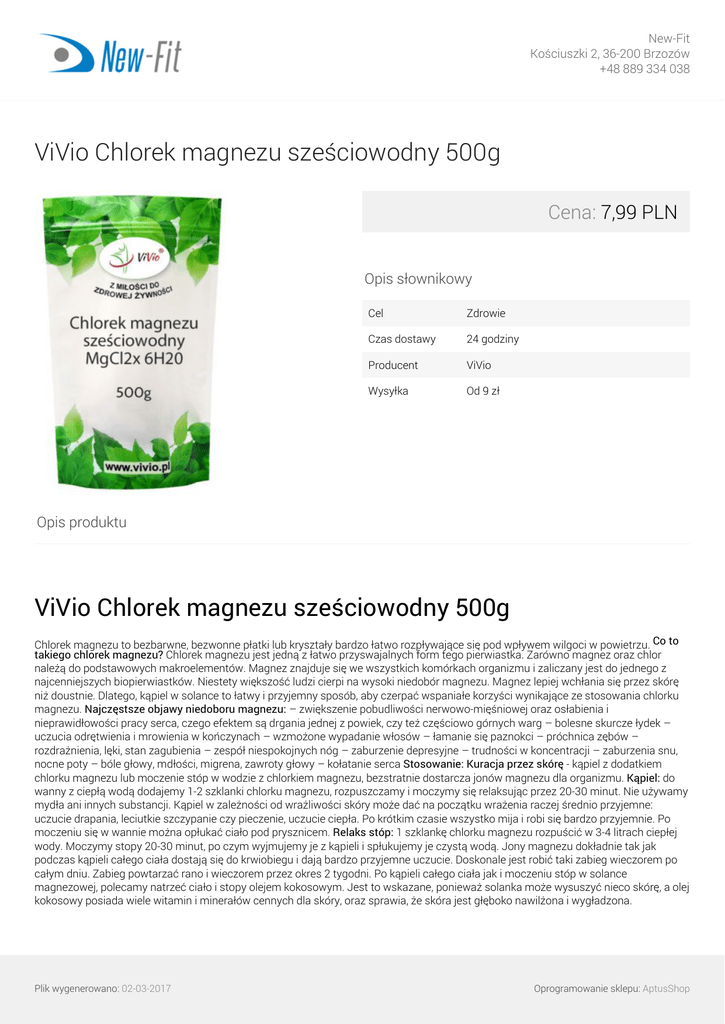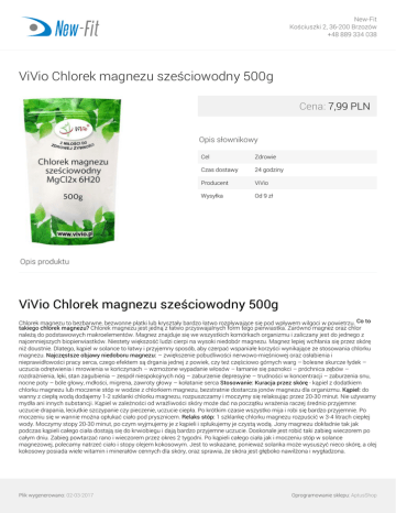 New-Fit Kościuszki 2, 36-200 Brzozów +48 889 334 038 ViVio Chlorek magnezu sześciowodny 500g Cena: 7,99 PLN Opis słownikowy Cel Zdrowie Czas dostawy 24 godziny Producent ViVio Wysyłka Od 9 zł Opis produktu ViVio Chlorek magnezu sześciowodny 500g Chlorek magnezu to bezbarwne, bezwonne płatki lub kryształy bardzo łatwo rozpływające się pod wpływem wilgoci w powietrzu. Co to takiego chlorek magnezu? Chlorek magnezu jest jedną z łatwo przyswajalnych form tego pierwiastka. Zarówno magnez oraz chlor należą do podstawowych makroelementów. Magnez znajduje się we wszystkich komórkach organizmu i zaliczany jest do jednego z najcenniejszych biopierwiastków. Niestety większość ludzi cierpi na wysoki niedobór magnezu. Magnez lepiej wchłania się przez skórę niż doustnie. Dlatego, kąpiel w solance to łatwy i przyjemny sposób, aby czerpać wspaniałe korzyści wynikające ze stosowania chlorku magnezu. Najczęstsze objawy niedoboru magnezu: – zwiększenie pobudliwości nerwowo-mięśniowej oraz osłabienia i nieprawidłowości pracy serca, czego efektem są drgania jednej z powiek, czy też częściowo górnych warg – bolesne skurcze łydek – uczucia odrętwienia i mrowienia w kończynach – wzmożone wypadanie włosów – łamanie się paznokci – próchnica zębów – rozdrażnienia, lęki, stan zagubienia – zespół niespokojnych nóg – zaburzenie depresyjne – trudności w koncentracji – zaburzenia snu, nocne poty – bóle głowy, mdłości, migrena, zawroty głowy – kołatanie serca Stosowanie: Kuracja przez skórę - kąpiel z dodatkiem chlorku magnezu lub moczenie stóp w wodzie z chlorkiem magnezu, bezstratnie dostarcza jonów magnezu dla organizmu. Kąpiel: do wanny z ciepłą wodą dodajemy 1-2 szklanki chlorku magnezu, rozpuszczamy i moczymy się relaksując przez 20-30 minut. Nie używamy mydła ani innych substancji. Kąpiel w zależności od wrażliwości skóry może dać na początku wrażenia raczej średnio przyjemne: uczucie drapania, leciutkie szczypanie czy pieczenie, uczucie ciepła. Po krótkim czasie wszystko mija i robi się bardzo przyjemnie. Po moczeniu się w wannie można opłukać ciało pod prysznicem. Relaks stóp: 1 szklankę chlorku magnezu rozpuścić w 3-4 litrach ciepłej wody. Moczymy stopy 20-30 minut, po czym wyjmujemy je z kąpieli i spłukujemy je czystą wodą. Jony magnezu dokładnie tak jak podczas kąpieli całego ciała dostają się do krwiobiegu i dają bardzo przyjemne uczucie. Doskonale jest robić taki zabieg wieczorem po całym dniu. Zabieg powtarzać rano i wieczorem przez okres 2 tygodni. Po kąpieli całego ciała jak i moczeniu stóp w solance magnezowej, polecamy natrzeć ciało i stopy olejem kokosowym. Jest to wskazane, ponieważ solanka może wysuszyć nieco skórę, a olej kokosowy posiada wiele witamin i minerałów cennych dla skóry, oraz sprawia, że skóra jest głęboko nawilżona i wygładzona. Plik wygenerowano: 02-03-2017 Oprogramowanie sklepu: AptusShop New-Fit Kościuszki 2, 36-200 Brzozów +48 889 334 038 Przeciwskazania: hipermagnezamia, niewydolność nerek, stosowanie leków przeciwzakrzepowych, hipotonia. Plik wygenerowano: 02-03-2017 Powered by TCPDF (www.tcpdf.org) Oprogramowanie sklepu: AptusShop