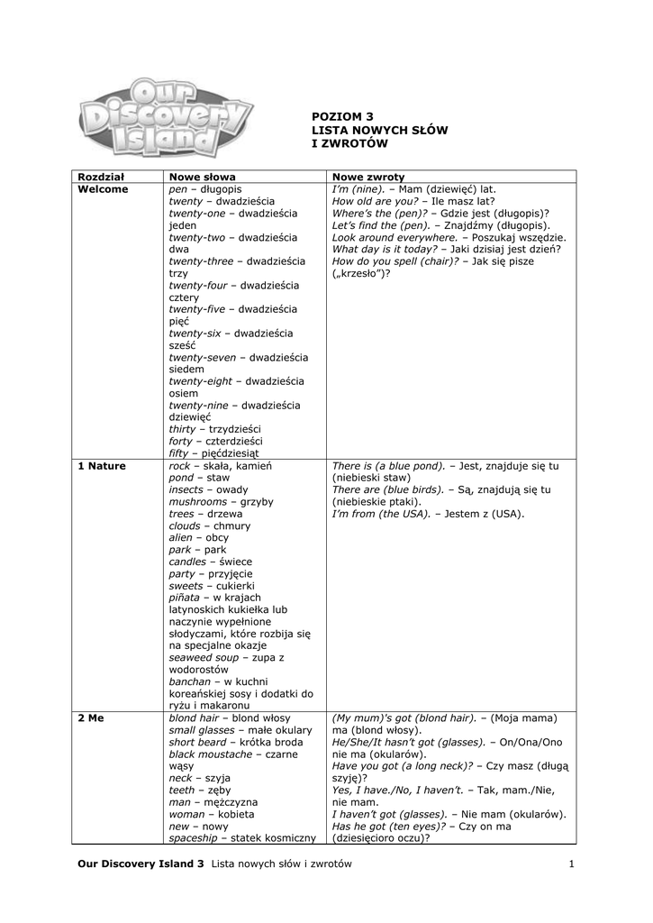 POZIOM 3 LISTA NOWYCH SŁÓW I ZWROTÓW Rozdział Welcome 1 Nature 2 Me Nowe słowa pen – długopis twenty – dwadzieścia twenty-one – dwadzieścia jeden twenty-two – dwadzieścia dwa twenty-three – dwadzieścia trzy twenty-four – dwadzieścia cztery twenty-five – dwadzieścia pięć twenty-six – dwadzieścia sześć twenty-seven – dwadzieścia siedem twenty-eight – dwadzieścia osiem twenty-nine – dwadzieścia dziewięć thirty – trzydzieści forty – czterdzieści fifty – pięćdziesiąt rock – skała, kamień pond – staw insects – owady mushrooms – grzyby trees – drzewa clouds – chmury alien – obcy park – park candles – świece party – przyjęcie sweets – cukierki piñata – w krajach latynoskich kukiełka lub naczynie wypełnione słodyczami, które rozbija się na specjalne okazje seaweed soup – zupa z wodorostów banchan – w kuchni koreańskiej sosy i dodatki do ryżu i makaronu blond hair – blond włosy small glasses – małe okulary short beard – krótka broda black moustache – czarne wąsy neck – szyja teeth – zęby man – mężczyzna woman – kobieta new – nowy spaceship – statek kosmiczny Nowe zwroty I’m (nine). – Mam (dziewięć) lat. How old are you? – Ile masz lat? Where’s the (pen)? – Gdzie jest (długopis)? Let’s find the (pen). – Znajdźmy (długopis). Look around everywhere. – Poszukaj wszędzie. What day is it today? – Jaki dzisiaj jest dzień? How do you spell (chair)? – Jak się pisze („krzesło”)? There is (a blue pond). – Jest, znajduje się tu (niebieski staw) There are (blue birds). – Są, znajdują się tu (niebieskie ptaki). I’m from (the USA). – Jestem z (USA). (My mum)'s got (blond hair). – (Moja mama) ma (blond włosy). He/She/It hasn’t got (glasses). – On/Ona/Ono nie ma (okularów). Have you got (a long neck)? – Czy masz (długą szyję)? Yes, I have./No, I haven’t. – Tak, mam./Nie, nie mam. I haven’t got (glasses). – Nie mam (okularów). Has he got (ten eyes)? – Czy on ma (dziesięcioro oczu)? Our Discovery Island 3 Lista nowych słów i zwrotów 1 3 Pets 4 Home 5 Clothes monster – potwór lovely – śliczny feathers – pióra tail – ogon emu – emu kangaroo – kangur pouch – torba (kangura) koala – koala fur – futro rabbit – królik snake – wąż pet – zwierzątko domowe tortoise – żółw ugly – brzydki hamster – chomik tarantula – tarantula rat – szczur caterpillars – gąsienice cocoons – kokony butterflies – motyle tadpoles – kijanki water – woda hamster wheel – kołowrotek dla chomika fruit – owoce iguana – legwan, gatunek jaszczurki spider – pająk TV – telewizor cooker – kuchenka cupboard – szafka kuchenna bed – łóżko shower – prysznic sofa – kanapa bath – wanna lamp – lampa on – na under – pod school – szkoła cool – chłodny, opanowany, świetny pool – basen mosaic – mozaika tiles – płytki, kafelki stones – kamienie glass – szkło trainers – buty sportowe jeans – dżinsy tracksuit – dresy sweatshirt – bluza shorts – szorty scarf – szalik pirate – pirat clown – klown lay the table – nakryć do stołu tidy the bedroom – posprzątać sypialnię make the bed – pościelić łóżko wash the dishes – pozmywać naczynia wash the car – umyć Has it got (four legs)? – Czy to [zwierzę] ma (cztery nogi)? Yes, it has./No, it hasn’t. – Tak, ma./ Nie, nie ma. Have they got (a cat)? – Czy mają (kota)? Yes, they have./No, they haven’t. – Tak, mają./Nie, nie mają. It hasn't got (a tail). – To [zwierzę] nie ma (ogona). first – najpierw then – potem finally – w końcu Is the (bed) in the (bedroom)? – Czy (łóżko) jest w (sypialni)? Yes, it is./No, it isn’t. – Tak, jest./Nie, nie jest. Where’s the (frog)? – Gdzie jest (żaba)? It’s (in the bath). – Jest w (wannie). What are you wearing? – Co masz na sobie? What’s he wearing? – Co on ma na sobie? Is he wearing (my scarf)? – Czy on ma na sobie mój (szalik)? Yes, he is./No, he isn’t. – Tak, ma./ Nie, nie ma. We’ve got/We haven’t got (uniforms). – Mamy (mundurki)./ Nie mamy (mundurków). Our Discovery Island 3 Lista nowych słów i zwrotów 2 6 Sports 7 Food samochód make a cake – zrobić ciasto school uniform – mundurek szkolny jacket – kurtka sandals – sandały run – biegać ride a bike – jeździć na rowerze play tennis – grać w tenisa play football – grać w piłkę nożną play basketball – grać w koszykówkę climb a tree – wspiąć się na drzewo catch a ball – złapać piłkę strong – silny dolphins – delfiny hoop – obręcz monkeys – małpy stretch your arms – wyciągnąć ramiona do góry bend your knees – zgiąć nogi w kolanach twist your body to the left/right – skręcić tułów w lewo/prawo peas – groszek beans – fasolka tomatoes – pomidory cucumbers – ogórki plums – śliwki strawberries – truskawki carrots – marchewki peaches – brzoskwinie potatoes – ziemniaki astronaut – astronauta space – kosmos healthy – zdrowy vegetables – warzywa fats – tłuszcze sugar – cukier dairy – nabiał protein – białka grains – ziarna asado – grillowane mięso, potrawa popularna w niektórych krajach Ameryki Południowej alfajores – rodzaj ciastek przypominających markizy popularnych w niektórych krajach Ameryki Południowej pastries – ciastka jerk chicken – kurczak pieczony lub grillowany ze specjalnymi przyprawami, potrawa popularna na Jamajce patty – pieczony pierożek z nadzieniem, potrawa popularna na Jamajce I can’t (swim) but I can (jump). – Umiem (pływać), ale nie umiem (skakać). He/She can (run). – On/Ona umie (biegać). He/She can’t (swim). – On/Ona umie (pływać). Can you (play basketball)? – Czy umiesz (grać w koszykówkę)? Yes, I can./ No, I can’t. – Tak, umiem./Nie, nie umiem. Can he/she (climb a tree)? – Czy on/o