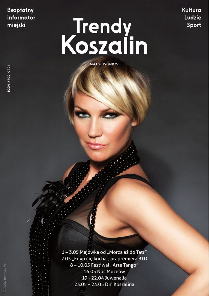 fot.: Mat. promocyjne MAJ 2015 (NR 27) 1 – 3.05 Majówka od „Morza aż do Tatr” 2.05 „Edyp cię kocha”, prapremiera BTD 8 – 10.05 Festiwal „Arte Tango” 16.05 Noc Muzeów 19 - 22.04 Juwenalia 23.05 – 24.05 Dni Koszalina Wstępniak Trendy Koszalin. Kultura, ludzie, sport. ISSN 2299 - 9221, bezpłatny informator miejski, nakład: 9 000 egz., Wydawca: Centrum Kultury 105 w Koszalinie. Zespół redakcyjny: Monika Modła – kierownik zespołu Emilia Wójcik - z-ca kierownika zespołu redakcyjnego Kuba Grabski – redaktor wydania Monika Frankowska – grafik Radosław Brzostek – redaktor, zdjęcia Adres redakcji: fot.: Archiwum Piotra Jedlińskiego redakcyjnego, z-ca dyrektora CK 105 Centrum Kultury 105 w Koszalinie ul. Zwycięstwa 105, 75-001 Koszalin www.ck105.koszalin.pl, 94 347 57 01 Kontakt email: [email protected] [email protected] [email protected] Druk: Przedsiębiorstwo Produkcyjno-Handlowe ZAPOL al. Piastów 42, 71-062 Szczecin Trendy dostępne na stronach: www.ck105.koszalin.pl www.koszalin.naszemiasto.pl Znajdziecie nas również w tygodniku Koniec maja to w Koszalinie tradycyjne spoglądanie w przeszłość miasta i jestem przekonany, że kiedy biskup kamieński Herman von Gleichen lokował na prawie lubeckim w 1266 roku nasze miasto, nie spodziewał się, że fakt ten w XXI wieku będzie nie dość, że pamiętany, to na dodatek jego wspomnienie doczeka się uroczystej oprawy. 23 maja 2016 roku minie dokładnie 750 lat od dnia, kiedy mówimy o narodzinach naszego miasta. Jest to wyjątkowa rocznica, dlatego uroczyste obchody Jubileuszu 750-lecia Miasta rozpoczęliśmy już rok temu i kontynuować będziemy podczas tegorocznych Dni Koszalina. Jestem przekonany, że bogaty program uroczystości pozwoli nam udanie spędzić czas. Urodziny Miasta są przecież świętem i okazją do zabawy każdego z nas. Chciałbym, aby maj był dla nas okazją do integracji i budowania wspólnoty lokalnej. Do uśmiechu i wspólnego tworzenia niezapomnianych wspomnień, przeżywania miłych chwil w rodzinnym gronie. „Nasze Miasto” Piotr Jedliński Prezydent Miasta Koszalina Polecamy kultura Polecamy kultura Przedostatnia w tym sezonie premiera naszego teatru to zarazem pierwsza w Polsce inscenizacja spektaklu dwóch irlandzkich autorów Simona Doyla i Gavina Quinna „Edyp Cię kocha”. Tekst powstał w 2005 roku i rok później został pokazany na deskach Kitel Alley Theatre w Dublinie. Reżyserem koszalińskiego spektaklu jest Cezary Iber, laureat nagrody publiczności za najlepszy spektakl 5.Koszalińskich Konfrontacji Młodych „m-teatr 2014”. Oddajmy głos twórcy: „Czy jesteśmy kowalami swego losu, czy tylko pionkami w rozgrywkach bogów? Wolna wola kontra przeznaczenie. Kto może wiedzieć o tym lepiej niż Edyp. Całe życie uciekał od okrutnej przepowiedni, tylko po to by na koniec bezlitośnie się z nią skonfrontować. Edyp i jego rodzina. W tym dramacie, przeniesieni we współczesne czasy. Jednak bez względu na okres i miejsce, relacje pozostają takie same. Rodzina, która jest skazana na zagładę, ale czy dlatego, że tak chcą bogowie i kosmiczne klątwy, czy dlatego, że zepsucie drąży ich od wewnątrz? Chore relacje, wiecznie niewyjaśnione, skrywane kłamstwa, frustracje i zależności. Igraszki bogów i igraszki ludzi. Kompleksy i depresje. Walka, grill z ociekającymi kiełbaskami i rodzinna terapia. fot.: Materiały promocyjne BTD Prapremiera w Bałtyckim Teatrze Dramatycznym Zatem jest to historia pewnej antycznej, a jednocześnie współczesnej rodziny. Sztuka o moralności, a raczej jej upadku, o seksualności, a raczej o wykorzystaniu i w końcu o przeznaczeniu i wolnej woli. Trzy Mojry snują nić życia. Jedna ją nawija na prządkę, druga nawleka na igłę, a trzecia przecina. Ot i cała historia”. Na koniec jeszcze obsada koszalińskiej prapremiery: Beata Niedziela – Jokasta, Katarzyna Pośpiech (gościnnie) – Antygona, Dominika Mrozowska – Chór, Olga Kunicka (gościnnie) – Chór, Katarzyna Stenzel (gościnnie) – Chór, Piotr Krótki – Terezjasz, Artur Paczesny – Edyp, Jacek Zdrojewski – Kreon. Materiał opracowany przez Bałtycki Teatr Dramatyczny w Koszalinie Polecamy kultura Noc w Muzeum fot.: Materiały promocyjne Muzeum 4-5 Tegoroczna Noc Muzeów rozpoczyna nowy cykl tematyczny. Każda kolejna majowa impreza związana będzie z jedną z muzealnych ekspozycji. Pierwsza z cyklu, nawiązuje do wystawy „Pradzieje Pomorza", a jej główną atrakcją – oprócz bezpłatnego zwiedzania ekspozycji i możliwości spotkania z autorami wystaw – będzie festyn archeologiczny, podczas którego Drużyna Grodu Trzygłowa zaprezentuje słowiańskie zwyczaje, obrzędy, stroje i uzbrojenie, a zespół Percival przypomni brzmienie rzadko dziś używanych instrumentów. Ci, którzy odwiedzą tej nocy muzealny dziedziniec, wysłuchają koncertu wczesnośredniowiecznej muzyki, poznają pracę bursztynnika i garncarza, a także posmakują dawnego jadła. Najmłodsi uczestnicy imprezy, ciekawi muzealnego warsztatu, sprawdzą na czym polega praca archeologa – przy pomocy wykrywacza metali poszukają „skarbów" i przygotują ich dokumentację. Będą mogli również wypleść krajki na krosnach, stworzyć własną biżuterię czy skamielinę, zagrać w dawne gry – hnefatafl i mancalę, spróbować zmielić zboże na kamiennych żarnach lub wykonać „zabytkowy" naszyjnik. Na wszystkich chętnych czekać będzie wielkoformatowa mozaika – z ceramicznych fragmentów postaramy się stworzyć brakującą połowę popielnicy twarzowej. Podobnie jak w poprzednich latach we wnętrzu muzeum odbędzie się prezentacja zbiorów kolekcjonerów oraz promocyjna sprzedaż wydawnictw, a przewodnicy PTTK oprowadzą po najciekawszych zabytkach Koszalina. Wraz z członkami Stowarzyszenia Roweria będzie można wybrać się na rowerowy rajd szlakiem muzeów i galerii, które wzięły udział w Nocy Muzeów. Program: Wnętrza muzeum 18.00