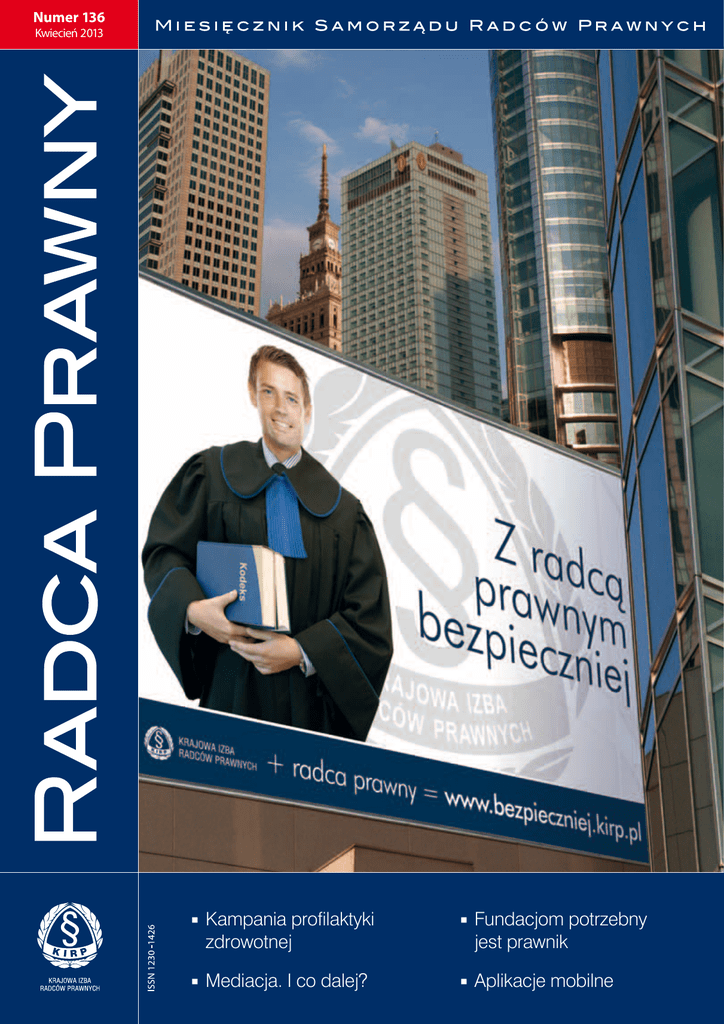 Numer 136 Kwiecień 2013 ▪ Kampania profilaktyki zdrowotnej ▪ Fundacjom potrzebny jest prawnik ▪ Mediacja. I co dalej? ▪ Aplikacje mobilne SUbsidio fundacja Radców Prawnych venire fundacja radców prawnych KRS 0000326684 Fundacja „Subsidio Venire” jest organizacją pożytku publicznego działającą od grudnia 2009 r. Zarząd fundacji apeluje do wszystkich o wsparcie i pomoc na szczytne cele, dla których nasza fundacja, została powołana. Przekaż 1% swojego podatku na działalność naszej organizacji. Cele fundacji to: wspomaganie inicjatyw zapewniających powszechny dostęp do pomocy prawnej i ochrony praw i wolności obywatelskich; działalność w zakresie pomocy społecznej i charytatywnej dla rodzin radców prawnych; pomoc sierotom – dzieciom zmarłych radców prawnych, szczególnie w zakresie materialnym, edukacyjnym, a także ich startu zawodowego; niesienie pomocy materialnej oraz wspieranie różnorodnych form opieki społecznej dla radców prawnych – seniorów niewykonujących zawodu. Aby przekazać swój 1% podatku należy – po wyliczeniu podatku, który Państwo zapłacą w tym roku – w ostatnich rubrykach zeznania podatkowego wpisać nazwę Fundacja Radców Prawnych „Subsidio Venire” i numer KRS 0000326684. Wpisujemy także kwotę stanowiącą wartość 1% podatku po zaokrągleniu dziesiątek groszy w dół. Wszystkim darczyńcom dziękujemy!!! Przeznacz swój 1% podatku fundacji radców prawnych Jeśli ktoś chciałby przekazać nam więcej niż 1% podatku, prosimy o wpłaty na konto: Fundacja Radców Prawnych „Subsidio Venire” Bank BPH O/Warszawa numer konta: 34 1060 0076 0000 3200 0135 4989 w numerze SPIS TREŚCI KIRP 4Zagrożenia i szanse – Dariusz Sałajewski 5 Radcy prawni bliżej obron w sprawach karnych – Bartosz Kopania 10 Kampania profilaktyki prozdrowotnej – Stefan Mucha PROMOCJA ZAWODU 8 Z radcą prawnym bezpieczniej – Bartosz Kopania PRAKTYKA 12 Osiem kolorów – niebieski – Olgierd Zbychorski 15 Jestem oszołomem – Henryk Leliwa 16 Jak wybierać i jak rozliczać kancelarię zewnętrzną – Grażyna J. Leśniak 20 Jeszcze raz o Koperniku – Leszek Lepczyński 21 Podatki od domowej kancelarii – Tomasz Zieliński 32 Co się kryje pod togą? – Jerzy Mosoń WYWIAD 22 Świat równoległy – z Agnieszką Lisak rozmawia Krzysztof Mering 36 Fundacjom potrzeby jest prawnik – z Jaśkiem Melą rozmawia Agnieszka Niewińska MEDIACJE 24 Mediacja. I co dalej? – Grzegorz Furgał 27 O mediacji raz jeszcze – Jacek Kosuniak 30 Wszyscy wygrywają – Marcin Zawiśliński FORUM 34 Per absurdum... – (mer) 35 W pociągu do Warszawy – Tomasz Działyński OD REDAKTORA NOWE TECHNOLOGIE 37 Bezpieczeństwo kancelarii w dobie cyfrowych centrów danych – Beata Marek 39 Aplikacje mobilne – Grzegorz Furgał Z ZAGRANICY 42 Wynagradzanie prawników w Niemczech – Rafał Ciesielski NA WOKANDZIE EUROPEJSKIEJ 44 Europejski nakaz zapłaty a wymogi k.p.c. – Maciej Taborowski NA WOKANDZIE 46 O poziom dziennikarstwa troszcz się z umiarem – Wojciech Tumidalski 48 Bohaterowie medialnej wyobraźni – WT 50 AKTUALNOŚCI PRAWNICZY HUMOR 52 Anegdoty prawnicze – zebrał Krzysztof Bodio FELIETON 54 Dlaczego robimy to, co robnimy? – Maciej Bobrowicz 19 marca 2013 r. zmarł nasz Przyjaciel Bolek Chylak, wieloletni członek KRRP, reprezentujący izbę koszalińską. Przewodniczący Krajowego Zespołu Wizytatorów, członek Komisji Egzaminacyjnej II stopnia przy Ministrze Sprawiedliwości do rozpoznania odwołań od uchwał o wynikach egzaminu radcowskiego. Bolek zmagał się z ciężką chorobą, która spadła na Niego nagle. Wierzył, że ją pokona. Ja też w to wierzyłam i sekundowałam Mu w tej trudnej walce. W najnowszym numerze „Radcy Prawnego” piszemy o pracach sejmowej podkomisji, dotyczących nadania radcom prawnym uprawnień w obronach karnych. Rozpoczynamy także kampanię promocji zawodu radcy prawnego. Jest to pierwsza tak szeroko zaplanowana kampania realizowana przez nasz samorząd. Jednym z jej elementów jest promocja logo KIRP jako znaku najwyższej jakości świadczonych usług. Na wzór samorządów prawniczych z wielu krajów przygotowane zostało przesłanie, które ma w pewnej perspektywie wytworzyć u klientów pozytywne skojarzenie pomiędzy logo KIRP (obraz graficzny) a zawodem radcy prawnego. Do tego numeru „Radcy Prawnego” dołączyliśmy naklejki z logo KIRP, które mogą Państwo wykorzystać w swej aktywności zawodowej. Rozpoczynamy także kampanię profilaktyki prozdrowotnej skierowaną do radców prawnych. Zasadza się ona na przeprowadzeniu badań genetycznych, które pozwolą na stwierdzenie lub wykluczenie zwiększonych predyspozycji do występowania chorób nowotworowych. Piszemy także o mediacji, sposobach rozliczania kancelarii zewnętrznych i ich bezpieczeństwie w dobie cyfrowych centrów danych, a także o mobilnych aplikacjach i sposobach wynagradzania prawników w Niemczech. Krzysztof Mering, redaktor naczelny W ostatniej rozmowie powiedział mi, że lekarze obiecali, iż w maju będzie mógł pospacerować po Kołobrzegu, gdzie mieszkał. Tej walki nie wygrał, choć zawsze był odważny i bezkompromisowy, gdy sytuacja tego wymagała. Kompetentny, rzeczowy, ale życzliwy i empatyczny. Lubił ludzi. Otwarty na sprawy drugiego człowieka. Miałam okazję te cechy docenić podczas wspólnej pracy w Komisji Odwoławczej. Zapamiętajmy Bolka jako wiernego Przyjaciela, oddanego sprawom naszego samorządu, dobrego Człowieka. Zapamiętajmy Go takim, jaki był. W imieniu przyjaciół Ewa Stompor-Nowicka, sekretarz KRRP Radca Prawny 3 KIRP Zagrożenia Czymś takim bowiem byłoby „odmiejscowienie” izb adwokackich i radcowskich oraz tworzenie ich „na życzenie” grup wnioskodawców, co przewidują wnioski niektórych posłów. Czym byłby samorząd, gdyby urzeczywistnił się inny poselski projekt, przewidujący prowadzenie w całości postępowań dyscyplinarnych w stosunku do przed