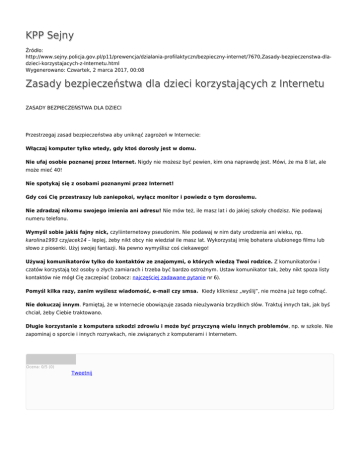 KPP Sejny Źródło: http://www.sejny.policja.gov.pl/p11/prewencja/dzialania-profilaktyczn/bezpieczny-internet/7670,Zasady-bezpieczenstwa-dladzieci-korzystajacych-z-Internetu.html Wygenerowano: Czwartek, 2 marca 2017, 00:08 Zasady bezpieczeństwa dla dzieci korzystających z Internetu ZASADY BEZPIECZEŃSTWA DLA DZIECI Przestrzegaj zasad bezpieczeństwa aby uniknąć zagrożeń w Internecie: Włączaj komputer tylko wtedy, gdy ktoś dorosły jest w domu. Nie ufaj osobie poznanej przez Internet. Nigdy nie możesz być pewien, kim ona naprawdę jest. Mówi, że ma 8 lat, ale może mieć 40! Nie spotykaj się z osobami poznanymi przez Internet! Gdy coś Cię przestraszy lub zaniepokoi, wyłącz monitor i powiedz o tym dorosłemu. Nie zdradzaj nikomu swojego imienia ani adresu! Nie mów też, ile masz lat i do jakiej szkoły chodzisz. Nie podawaj numeru telefonu. Wymyśl sobie jakiś fajny nick, czyliinternetowy pseudonim. Nie podawaj w nim daty urodzenia ani wieku, np. karolina1993 czyjacek14 – lepiej, żeby nikt obcy nie wiedział ile masz lat. Wykorzystaj imię bohatera ulubionego filmu lub słowo z piosenki. Użyj swojej fantazji. Na pewno wymyślisz coś ciekawego! Używaj komunikatorów tylko do kontaktów ze znajomymi, o których wiedzą Twoi rodzice. Z komunikatorów i czatów korzystają też osoby o złych zamiarach i trzeba być bardzo ostrożnym. Ustaw komunikator tak, żeby nikt spoza listy kontaktów nie mógł Cię zaczepiać (zobacz: najczęściej zadawane pytanie nr 6). Pomyśl kilka razy, zanim wyślesz wiadomość, e-mail czy smsa. Kiedy klikniesz „wyślij”, nie można już tego cofnąć. Nie dokuczaj innym. Pamiętaj, że w Internecie obowiązuje zasada nieużywania brzydkich słów. Traktuj innych tak, jak byś chciał, żeby Ciebie traktowano. Długie korzystanie z komputera szkodzi zdrowiu i może być przyczyną wielu innych problemów, np. w szkole. Nie zapominaj o sporcie i innych rozrywkach, nie związanych z komputerami i Internetem. Ocena: 0/5 (0) Tweetnij