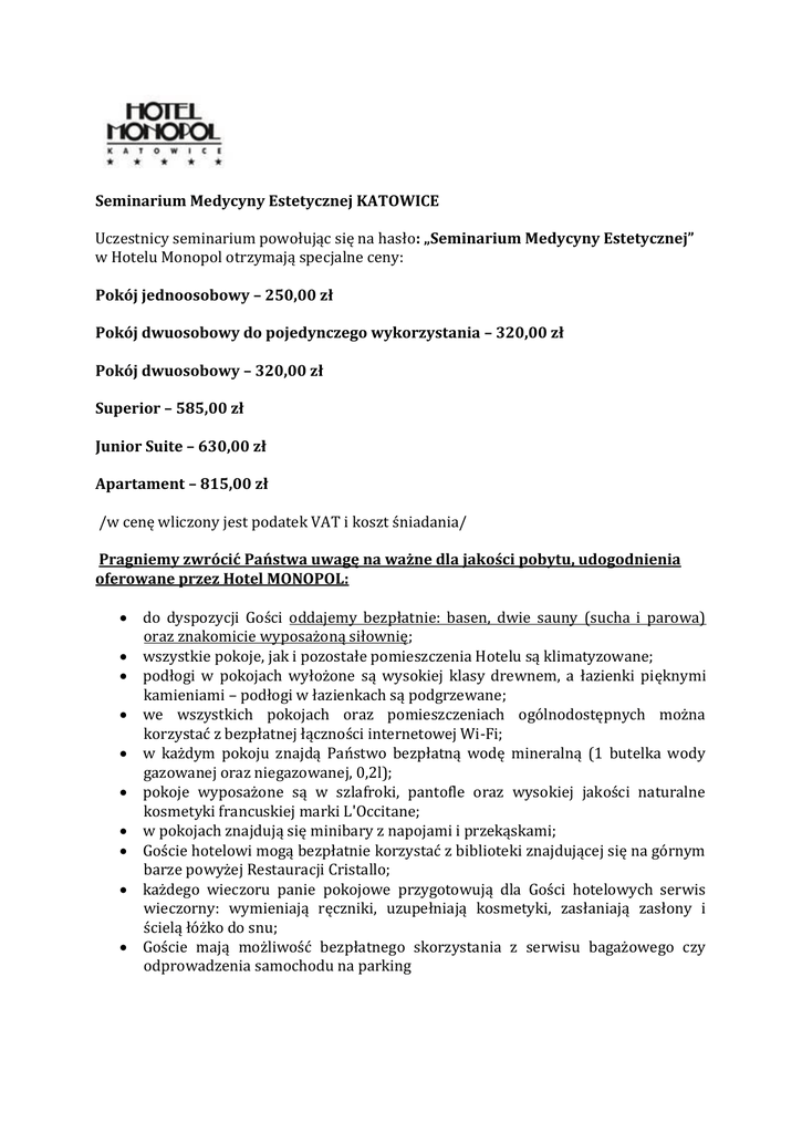 Seminarium Medycyny Estetycznej KATOWICE Uczestnicy seminarium powołując się na hasło: „Seminarium Medycyny Estetycznej” w Hotelu Monopol otrzymają specjalne ceny: Pokój jednoosobowy – 250,00 zł Pokój dwuosobowy do pojedynczego wykorzystania – 320,00 zł Pokój dwuosobowy – 320,00 zł Superior – 585,00 zł Junior Suite – 630,00 zł Apartament – 815,00 zł /w cenę wliczony jest podatek VAT i koszt śniadania/ Pragniemy zwrócić Państwa uwagę na ważne dla jakości pobytu, udogodnienia oferowane przez Hotel MONOPOL: do dyspozycji Gości oddajemy bezpłatnie: basen, dwie sauny (sucha i parowa) oraz znakomicie wyposażoną siłownię; wszystkie pokoje, jak i pozostałe pomieszczenia Hotelu są klimatyzowane; podłogi w pokojach wyłożone są wysokiej klasy drewnem, a łazienki pięknymi kamieniami – podłogi w łazienkach są podgrzewane; we wszystkich pokojach oraz pomieszczeniach ogólnodostępnych można korzystać z bezpłatnej łączności internetowej Wi-Fi; w każdym pokoju znajdą Państwo bezpłatną wodę mineralną (1 butelka wody gazowanej oraz niegazowanej, 0,2l); pokoje wyposażone są w szlafroki, pantofle oraz wysokiej jakości naturalne kosmetyki francuskiej marki L'Occitane; w pokojach znajdują się minibary z napojami i przekąskami; Goście hotelowi mogą bezpłatnie korzystać z biblioteki znajdującej się na górnym barze powyżej Restauracji Cristallo; każdego wieczoru panie pokojowe przygotowują dla Gości hotelowych serwis wieczorny: wymieniają ręczniki, uzupełniają kosmetyki, zasłaniają zasłony i ścielą łóżko do snu; Goście mają możliwość bezpłatnego skorzystania z serwisu bagażowego czy odprowadzenia samochodu na parking Dla Gości korzystających z apartamentów hotelu MONOPOL, przygotowaliśmy szereg dodatkowych udogodnień: przestronny salon z luksusowym kompletem wypoczynkowym oraz osobna sypialnia; talerz owoców na powitanie; wanna z hydromasażem; świeże kwiaty; słodki poczęstunek wraz z bezpłatnym zestawem do przygotowywania kawy Nespresso (ekspres do kawy i kawa w kapsułkach); możliwość bezpłatnego skorzystania z centrum biznesowego (komputer, drukarka), znajdującego się na górnym barze obok biblioteczki hotelowej; bezpłatne miejsce parkingowe; możliwość bezpłatnego użyczenia telefonu do telekonferencji – konieczność wcześniejszej rezerwacji. WARUNKI REZERWACJI: · · Oferta ważna jest w terminie 16.09.-18.09.2016 W celu dokonania rezerwacji pokoi proszę o kontakt z recepcją hotelu: tel. 032 782 82 82 fax 032 782 82 83 e-mail: [email protected] WARUNKI ANULACJI: • 24h przed datą przyjazdu Gości