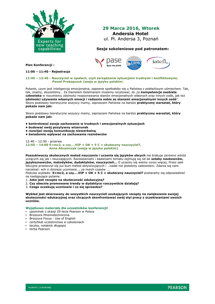 29 Marca 2016, Wtorek Andersia Hotel ul. Pl. Andersa 3, Poznań Sesje szkoleniowe pod patronatem: Plan Konferencji : 11:00 – 11:40 - Rejestracja 11:40 – 12:40 - Nauczyciel w opałach, czyli zarządzanie sytuacjami trudnymi i konfliktowymi, Paweł Prokopczuk (sesja w języku polskim) Pytanie, czym jest inteligencja emocjonalna, zapewne spotkałoby się u Państwa z pobłażliwym uśmiechem. Tak, tak, znamy, słyszeliśmy… Za Danielem Golemanem możemy recytować, że „to kompetencje osobiste człowieka w rozumieniu zdolności rozpoznawania stanów emocjonalnych własnych oraz innych osób, jak też zdolności używania własnych emocji i radzenia sobie ze stanami emocjonalnymi innych osób”. Skoro podstawy teoretyczne wszyscy mamy, zapraszam Państwa na bardzo praktyczny warsztat, który pokaże nam jak: Skoro podstawy teoretyczne wszyscy mamy, zapraszam Państwa na bardzo praktyczny warsztat, który pokaże nam jak: • • • • kontrolować swoje zachowanie w trudnych i emocjonalnych sytuacjach budować swój pozytywny wizerunek rozwijać swoją komunikację niewerbalną świadomie wpływać na zachowanie rozmówców 12:40 – 12:50 - przerwa 12:50 – 14:00 E=mc2, a czy….VIP + OK + 5 C = skuteczny nauczyciel?, Anna Abramczyk (sesja w języku polskim) Poszukiwaczy skutecznych metod nauczania i uczenia się języków obcych nie brakuje zarówno wśród uczących się jak i nauczających. Rozważaniami i badaniami tematu zajmują się od lat sztaby naukowców, językoznawców, metodyków, dydaktyków, nauczycieli… O uczeniu się wiemy coraz więcej. Przez sale lekcyjne przetoczył się już bum metod aktywizujących i …nadal nie jesteśmy zadowoleni. Zdarza się nam narzekać: ech ci dzisiejsi uczniowie…, za moich czasów …. Podczas wykładu: E=mc2, a czy….VIP + OK + 5 C = skuteczny nauczyciel? postaramy się odpowiedzieć na następujące pytania: 1. Jaka jest recepta na skuteczność edukacyjną? 2. Czy obecnie promowane trendy w dydaktyce rzeczywiście działają? 3. Czego oczekują uczniowie i co się sprawdza? Wykład jest skierowany do wszystkich nauczycieli szukających recepty na zwiększenie swojej skuteczności edukacyjnej oraz chcących skonfrontować swój styl pracy z oczekiwaniami swoich uczniów. Wyjątkowe materiały dla uczestników konferencji! • upominek z okazji 25-lecia Pearson w Polsce • Broszura Mnemotechniczna • Broszura Focus - Use of English • certyfikat uczestnictwa w szkoleniach • teczka, notatnik długopis • torba Pearson