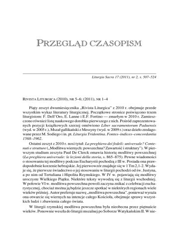 PRZEGLĄD CZASOPISM Liturgia Sacra 17 (2011), nr 2, s. 507–524 RIVISTA LITURGICA (2010), NR 5–6; (2011), NR 1–4 Piąty zeszyt dwumiesięcznika „Rivista Liturgica” z 2010 r. obejmuje przede wszystkim wykaz literatury liturgicznej. Początkowe stronice poświęcono trzem liturgistom: F. Dell’Oro, E. Lanne i E.F. Fortino — zmarłym w 2010 r. Zamieszczono również listę naukowego dorobku pierwszego z nich. Pośród zaprezentowanych pozycji książkowych szerzej omówiono Liber sacramentorum Paduensis (wyd. w 2005 r.), Mszał gallikański z Messyny (wyd. w 2009 r.) oraz dzieło zredagowane przez M. Sodiego i in. pt. Liturgia Tridentina. Fontes–indices–concordantia 1568–1962. Ostatni zeszyt z 2010 r. nosi tytuł: La preghiera dei fedeli: universale? Contenuti e strutture („Modlitwa wiernych: powszechna? Zawartość i struktury”). W pierwszym studium zeszytu Paul De Clerck omawia historię modlitwy powszechnej (La preghiera universale: le lezioni della storia, s. 865–875). Pewne wiadomości o stosowaniu tej modlitwy podczas Eucharystii pochodzą z III w. Posiada ona prawdopodobnie korzenie hebrajskie. Jej pierwowzór znajduje się w 1 Tm 2,1-2. Wydaje się, że pierwsze świadectwo o jej stosowaniu w liturgii pochodzi od św. Justyna, a po nim od Tertuliana i Hipolita Rzymskiego. W IV w. pojawiają się modlitwy uroczyste Wielkiego Piątku. Niektóre teksty wywodzą się z liturgii wschodniej. W połowie VI w. modlitwa powszechna powoli zaczyna znikać z celebracji eucharystycznej, chociaż można ją będzie jeszcze spotkać w niektórych regionach wiele wieków później. Autor preferuje nazwę „modlitwa powszechna”, ponieważ wyraża ona otwarcie się wiernych na intencje całego Kościoła, obejmuje sprawy wszystkich ludzi i zbawienia całego świata. W liturgii rzymskiej modlitwa powszechna była nieobecna przez piętnaście wieków. Ponownie weszła do liturgii mszalnej po Soborze Watykańskim II. W nie- 508 SPRAWOZDANIA I RECENZJE których krajach stosowano ją „potajemnie” w średniowieczu i później, o czym świadczy Reginon z Prüm (X w.) i J.-B. Bossuet (XVIII w.). Cesare Giraudo w swoim studium pt. La preghiera dei fedeli tra eclissi e clandestinità. La sopravvivenza ufficiosa delle suppliche dopo le letture („Modlitwa wiernych między zniknięciem a ukryciem. Przetrwanie półoficjalne próśb po czytaniach”, s. 876–892) podaje przykład takiej modlitwy z XV w. z terenów Polski, a także ze Sieny i Turynu. Trzecie studium, autorstwa Matiasa Augé, traktuje o ponownym odkryciu, wprowadzeniu na nowo i rozwoju modlitwy powszechnej (Riscoperta, ripristino e sviluppi della preghiera universale, s. 893–904). Problem stosowania modlitwy powszechnej był przedyskutowany w XX w. Pozytywnym efektem dyskusji była decyzja zawarta w Konstytucji o liturgii określająca zakres wezwań tejże modlitwy. Autor omawia teksty dokumentów odnoszących się do modlitwy powszechnej, wskazując, że w trzecim wydaniu Mszału rzymskiego kwestia tej modlitwy została znacznie zmodyfikowana. „Panie, naucz nas modlić się (Łk 11,1). Krytyczny przegląd pomocy i niedzielnych kartek” („Signore, insegnaci a pregare” (Lc 11,1). Rassegna critica da sussidi e foglietti domenicali, s. 905–919) — w tym studium Carlo Cibien ukazuje przykłady modlitwy wiernych, nawiązując do kryteriów, wedle których powinna ona być układana. Przytacza takie modlitwy z lat 2008–2010 w języku włoskim, francuskim i angielskim i krótko je komentuje. Manlio Sodi podkreśla wagę wychowywania do formułowania modlitwy wiernych, co zdaje się być ustawicznym wyzwaniem (Educare alla preghiera dei fedeli: sfida permanente?, s. 920–933). Studium obejmuje komentarz do tekstu soborowego oraz do tekstów z ogólnego wprowadzenia do Mszału i Lekcjonarza. Autor zwraca uwagę na wyzwania związane z liturgią słowa, oczekiwaniami wiernych, z treścią i sposobem wypowiadania wezwań. Pochwala łączenie próśb z oddawaniem Bogu chwały. Wskazuje, że istnieją trzy formy tej modlitwy: wielkopiątkowa, typiczna na niedziele i specjalna na dni kwartalne (w Mszale włoskim). Podkreśla też wagę milczenia. W „nocie” Il paradigma del Venerdi Santo („Paradygmat Wielkiego Piątku”, s. 935–943) Pietro Sorci stwierdza, że istnieje powszechna opinia, iż do pontyfikatu Feliksa III (483–492) modlitwa wiernych posiadała w Rzymie taką samą formę, jaką spotyka się dzisiaj w celebracji wielkopiątkowej. Znajduje się ona w Sakramentarzu gelazjańskim, w Mszale gallikańskim starym, w Sakramentarzu gregoriańskim i Ordo XXIII. Modlitwy odnowione w liturgii posoborowej stanowią model, który można by zastosować nie tylko w Wielki Piątek. Claudio Magnoli snuje refleksję na temat gestu i tekstu w modlitwie powszechnej (La preghiera universale: gesto o testo?, s. 944–949). Stara się on wykazać, że modlitwa powszechna nie jest tylko zwyczajnym tekstem do czytania, ale jest również prawdziwym i właściwym gestem, w którym zbiega się główna dynamika rytualnej komunikacji, werbalnej i niewerbalnej, mająca na celu skutki duchowe, DOM BOŻY. III OGÓLNOPOLSKA KONFERENCJA NAUKOWA 509 pożyteczne dla zbawienia wszystkich. Intencje modlitwy powinny być konkretne i sformułowane krótko z odpowiednią swobodą. Na temat form modlitwy wiernych pisze Angelo Lameri (Le „forme” della preghiera dei fedeli, s. 950–966). Po wyjaśnieniu terminologii: oratio communis seu fidelium, oratio universalis, preces, prex litanica, zawartej w różnych dokumentach i księgach liturgicznych, wskazuje na sposoby wyrażania uczestnictwa w tej modlitwie, a następnie omawia prośby zawarte w liturgii godzin, obrzędach błogosławieństw i obrzędach pokuty. Dwa ostatnie artykuły znajdują się w dziale „Horyzonty”. Cesare Alzati rozważa kwestie świadectwa ambrozjańskiego i ekumenii chrześcijańskiej, epiklezy, posługi i eklezjologii (Testimonianza ambrosiana ed ecum