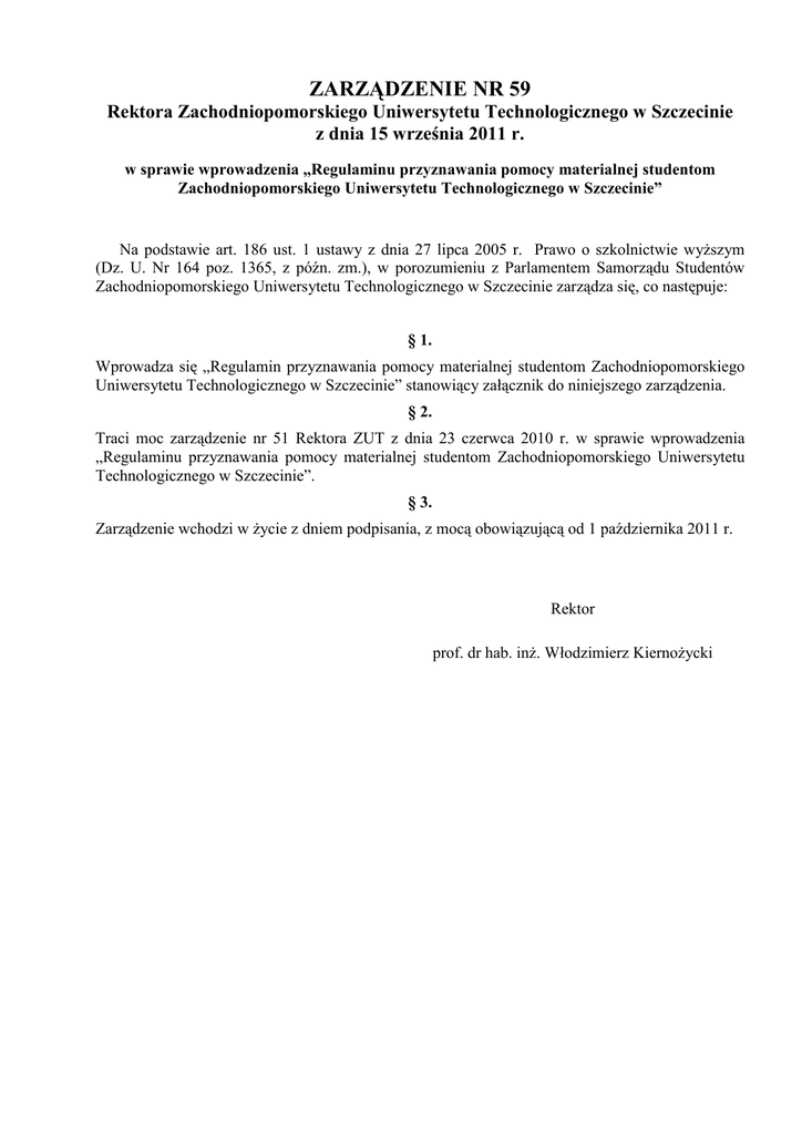 ZARZĄDZENIE NR 59 Rektora Zachodniopomorskiego Uniwersytetu Technologicznego w Szczecinie z dnia 15 września 2011 r. w sprawie wprowadzenia „Regulaminu przyznawania pomocy materialnej studentom Zachodniopomorskiego Uniwersytetu Technologicznego w Szczecinie” Na podstawie art. 186 ust. 1 ustawy z dnia 27 lipca 2005 r. Prawo o szkolnictwie wyŜszym (Dz. U. Nr 164 poz. 1365, z późn. zm.), w porozumieniu z Parlamentem Samorządu Studentów Zachodniopomorskiego Uniwersytetu Technologicznego w Szczecinie zarządza się, co następuje: § 1. Wprowadza się „Regulamin przyznawania pomocy materialnej studentom Zachodniopomorskiego Uniwersytetu Technologicznego w Szczecinie” stanowiący załącznik do niniejszego zarządzenia. § 2. Traci moc zarządzenie nr 51 Rektora ZUT z dnia 23 czerwca 2010 r. w sprawie wprowadzenia „Regulaminu przyznawania pomocy materialnej studentom Zachodniopomorskiego Uniwersytetu Technologicznego w Szczecinie”. § 3. Zarządzenie wchodzi w Ŝycie z dniem podpisania, z mocą obowiązującą od 1 października 2011 r. Rektor prof. dr hab. inŜ. Włodzimierz KiernoŜycki Załącznik do Zarządzenia nr 59 Rektora ZUT z dnia 15 września 2011 r. REGULAMIN przyznawania pomocy materialnej studentom Zachodniopomorskiego Uniwersytetu Technologicznego w Szczecinie I Postanowienia ogólne § 1. 1. Student Zachodniopomorskiego Uniwersytetu Technologicznego w Szczecinie moŜe ubiegać się o pomoc materialną w formie: 1) stypendium socjalnego, 2) stypendium specjalnego dla osób niepełnosprawnych, 3) stypendium rektora dla najlepszych studentów, 4) zapomogi. 2. Student moŜe równieŜ ubiegać się o pomoc materialną ze środków przeznaczonych na ten cel w budŜecie państwa w formie stypendium ministra, które regulują odrębne przepisy. 3. Prawo do świadczeń pomocy materialnej dla studentów Zachodniopomorskiego Uniwersytetu Technologicznego w Szczecinie, niebędących obywatelami polskimi i jego zakres określa ustawa z dnia 27 lipca 2005 r. Prawo o szkolnictwie wyŜszym. § 2. 1. Na wniosek właściwego organu samorządu studenckiego, dziekan powołuje wydziałową komisję stypendialną, a rektor odwoławczą komisję stypendialną, spośród studentów delegowanych przez wydziałowy lub uczelniany organ samorządu studenckiego i pracowników uczelni, przy czym studenci stanowią większość składu komisji. 2. Stypendia socjalne, stypendia specjalne dla osób niepełnosprawnych oraz zapomogi są przyznawane na wniosek studenta przez dziekana/wydziałową komisję stypendialną. 3. Stypendia rektora dla najlepszych studentów są przyznawane na wniosek studenta przez rektora. 4. Wraz z wnioskiem o przyznanie stypendium, student jest zobowiązany do złoŜenia oświadczenia o niepobieraniu świadczeń pomocy materialnej na więcej niŜ jednym kierunku studiów, wzór oświadczenia stanowi załącznik nr 1 do niniejszego regulaminu. 5. Nadzór nad działalnością wydziałowej komisji stypendialnej i odwoławczej komisji stypendialnej sprawują odpowiednio dziekan oraz rektor. 6. W ramach nadzoru, o którym mowa w ust. 5 dziekan lub rektor moŜe uchylić decyzję wydziałowej komisji stypendialnej lub odwoławczej komisji stypendialnej, niezgodną z przepisami ustawy lub niniejszym regulaminem. 7. Od decyzji dziekana/wydziałowej komisji stypendialnej w sprawie stypendium socjalnego, stypendium specjalnego dla osób niepełnosprawnych oraz zapomogi, studentowi przysługuje odwołanie do rektora/odwoławczej komisji stypendialnej, składane w terminie czternastu dni od dnia otrzymania decyzji. 8. Od decyzji rektora w sprawie stypendium rektora dla najlepszych studentów, przysługuje wniosek o ponowne rozpatrzenie sprawy, składany w terminie czternastu dni od dnia otrzymania decyzji. 9. Decyzja podjęta przez organ odwoławczy moŜe być zaskarŜona przez studenta do Wojewódzkiego Sądu Administracyjnego w Szczecinie w terminie 30 dni od dnia jej doręczenia. § 3. 1. Student moŜe otrzymywać stypendium socjalne, stypendium specjalne dla osób niepełnosprawnych oraz stypendium rektora dla najlepszych studentów w danym roku akademickim przez 9 miesięcy, a w przypadku niewykorzystanych środków – 10 miesięcy, natomiast gdy ostatni rok studiów trwa jeden semestr - przez okres do pięciu miesięcy. O wypłacie dziesiątego stypendium decyduje rektor w porozumieniu z Parlamentem Samorządu Studentów ZUT. 2. Stypendium socjalne, stypendium specjalne dla osób niepełnosprawnych oraz stypendium rektora dla najlepszych studentów przyznawane są na rok akademicki, z zastrzeŜeniem ust. 3. JeŜeli zgodnie z planem studiów ostatni rok studiów trwa jeden semestr, stypendium przyznawane jest na okres jednego semestru.1 3. W przypadku, gdy okres orzeczonej niepełnosprawności jest krótszy niŜ rok akademicki, wówczas stypendium dla osób niepełnosprawnych przyznawane jest na okres orzeczonej niepełnosprawności. 4. Stypendium socjalne, stypendium specjalne dla osób niepełnosprawnych oraz stypendium rektora dla najlepszych studentów wypłacane są co miesiąc, w terminach ustalonych przez rektora, ogłoszonych przed rozpoczęciem roku akademickiego. 5. Studenci ostatniego roku studiów pobierają stypendia: 1) do końca lutego – na studiach kończących się semestrem zimowym, 2) do końca czerwca – na studiach kończących się semestrem letnim. Uzyskanie przedłuŜenia terminu złoŜenia pracy dyplomowej na podstawie regulaminu studiów Zachodniopomorskiego Uniwersytetu Technologicznego w Szczecinie nie uprawnia do otrzymywania stypendiów, o których mowa w § 1 ust. 1. 6. Dla potrzeb niniejszego regulaminu ustala się, Ŝe semestr zimowy obejmuje miesiące: październik, listopad, grudzień, styczeń, luty, natomiast semestr letni obejmuje: marzec, kwiecień, maj, czerwiec, a w przypadku decyzji o wypłacie dziesiątego stypendium takŜe wrzesień. 7. Rektor w porozumieniu z Parlamentem Samorządu Studentów ZUT ustala na rok akademicki: 