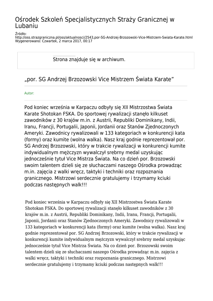 Ośrodek Szkoleń Specjalistycznych Straży Granicznej w Lubaniu Źródło: http://oss.strazgraniczna.pl/oss/aktualnosci/2543,por-SG-Andrzej-Brzozowski-Vice-Mistrzem-Swiata-Karate.html Wygenerowano: Czwartek, 2 marca 2017, 00:17 Strona znajduje się w archiwum. „por. SG Andrzej Brzozowski Vice Mistrzem Świata Karate” Autor: Pod koniec września w Karpaczu odbyły się XII Mistrzostwa Świata Karate Shotokan FSKA. Do sportowej rywalizacji stanęło kilkuset zawodników z 30 krajów m.in. z Austrii, Republiki Dominikany, Indii, Iranu, Francji, Portugalii, Japonii, Jordanii oraz Stanów Zjednoczonych Ameryki. Zawodnicy rywalizowali w 133 kategoriach w konkurencji kata (formy) oraz kumite (wolna walka). Nasz kraj godnie reprezentował por. SG Andrzej Brzozowski, który w trakcie rywalizacji w konkurencji kumite indywidualnym mężczyzn wywalczył srebrny medal uzyskując jednocześnie tytuł Vice Mistrza Świata. Na co dzień por. Brzozowski swoim talentem dzieli się ze słuchaczami naszego Ośrodka prowadząc m.in. zajęcia z walki wręcz, taktyki i techniki oraz rozpoznania granicznego. Mistrzowi serdecznie gratulujemy i trzymamy kciuki podczas następnych walk!!! Pod koniec września w Karpaczu odbyły się XII Mistrzostwa Świata Karate Shotokan FSKA. Do sportowej rywalizacji stanęło kilkuset zawodników z 30 krajów m.in. z Austrii, Republiki Dominikany, Indii, Iranu, Francji, Portugalii, Japonii, Jordanii oraz Stanów Zjednoczonych Ameryki. Zawodnicy rywalizowali w 133 kategoriach w konkurencji kata (formy) oraz kumite (wolna walka). Nasz kraj godnie reprezentował por. SG Andrzej Brzozowski, który w trakcie rywalizacji w konkurencji kumite indywidualnym mężczyzn wywalczył srebrny medal uzyskując jednocześnie tytuł Vice Mistrza Świata. Na co dzień por. Brzozowski swoim talentem dzieli się ze słuchaczami naszego Ośrodka prowadząc m.in. zajęcia z walki wręcz, taktyki i techniki oraz rozpoznania granicznego. Mistrzowi serdecznie gratulujemy i trzymamy kciuki podczas następnych walk!!!