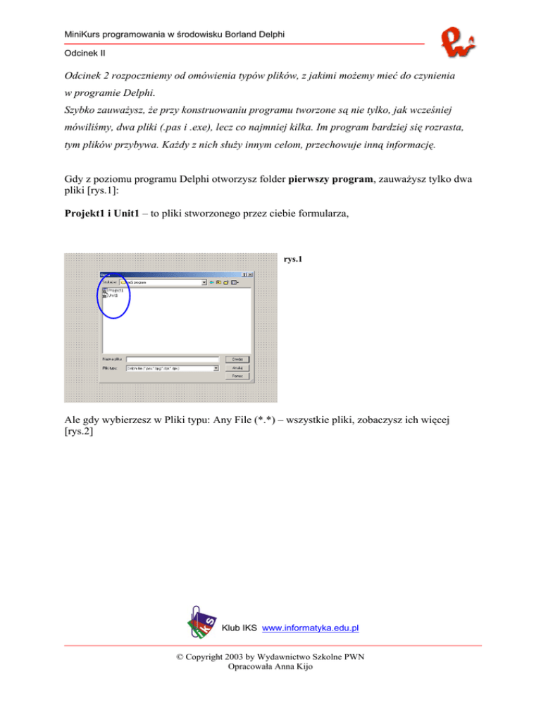 MiniKurs programowania w środowisku Borland Delphi Odcinek II Odcinek 2 rozpoczniemy od omówienia typów plików, z jakimi możemy mieć do czynienia w programie Delphi. Szybko zauważysz, że przy konstruowaniu programu tworzone są nie tylko, jak wcześniej mówiliśmy, dwa pliki (.pas i .exe), lecz co najmniej kilka. Im program bardziej się rozrasta, tym plików przybywa. Każdy z nich służy innym celom, przechowuje inną informację. Gdy z poziomu programu Delphi otworzysz folder pierwszy program, zauważysz tylko dwa pliki [rys.1]: Projekt1 i Unit1 – to pliki stworzonego przez ciebie formularza, rys.1 Ale gdy wybierzesz w Pliki typu: Any File (*.*) – wszystkie pliki, zobaczysz ich więcej [rys.2] Klub IKS www.informatyka.edu.pl © Copyright 2003 by Wydawnictwo Szkolne PWN Opracowała Anna Kijo MiniKurs programowania w środowisku Borland Delphi Odcinek II rys.2 Jakie zatem typy plików tworzone są przez Delphi? .dpr – plik projektu (zawiera dane na temat modułów i formatek, które wchodzą w skład projektu), .dfm – plik formatki (zawiera informacje o położeniu komponentów). Do każdego pliku tworzony jest plik modułu o tej samej nazwie, .pas – plik modułu (pliki te zawierają kody źródłowe wygenerowane przez Delphi oraz kody napisane przez programistę), .dcu – plik skompilowany, który jest tworzony w momencie tłumaczenia (kompilacji), .res – plik zasobów (zawiera informacje na temat ikon, kursorów, itp.), .dsk – pliki te zawierają informacje o wyglądzie środowiska i kompilacji, .exe – jest to plik skompilowany, który może być uruchamiany poza środowiskiem Delphi, .dll – są to biblioteki dołączane do programu dynamicznie w momencie pracy aplikacji, ~ - pliki tymczasowe (w momencie zapisu na dysku). Jeżeli jeszcze nie otworzyłeś swojego programu: 1. Odszukaj w „moich dokumentach” folder pierwszy program. 2. Otwórz plik pod nazwą Projekt1. KROK 3 Cel: Tworzymy napis na pasku tytułowym formularza. Klub IKS www.informatyka.edu.pl © Copyright 2003 by Wydawnictwo Szkolne PWN Opracowała Anna Kijo MiniKurs programowania w środowisku Borland Delphi Odcinek II Nasz program nie ma jeszcze nazwy. 3. Uaktywnij formularz, klikając na pasek tytułu. [rys.3]. rys.3 4. Odszukaj właściwość Caption i wpisz: Mój notatnik 1.0, a na pasku pojawi się tytuł twojego programu. 5. Ustaw właściwości: Właściwość Color ustaw np. na clGreen. Właściwość BorderIkons (rozwiń +) [rys.4] biMinimize ustaw na False biMaximize ustaw na False biHelp ustaw na True rys.4 Aby zobaczyć zmiany, skompiluj program (F9) [rys.5] Jakich elementów brakuje w Twoim programie, a co się pojawiło? Klub IKS www.informatyka.edu.pl © Copyright 2003 by Wydawnictwo Szkolne PWN Opracowała Anna Kijo MiniKurs programowania w środowisku Borland Delphi Odcinek II rys.5 Nasz program zamykamy poprzez naciśnięcie przycisku Zamknij. KROK 4 Cel: Umieszczamy panele, które będą stanowić podłoże dla ikon. Za chwilę będziemy umieszczać przydatne nam w programie ikony, organizować je w grupy: otwieranie, kopiowanie, wklejanie, wycinanie, usuwanie, itp. Umieścimy je na panelach. Do grupowania elementów służy komponent o nazwie Panel (jeden z ostatnich na zakładce standard) [rys.6]. 1. Odnajdź komponent Panel (naprowadź kursor myszy na komponent, a otrzymasz podpowiedź). 2. Kliknij na niego 2x . Pamiętaj, że aby ustawić właściwość danego obiektu, musisz go zaznaczyć. 3. Zaznacz panel. 4. Odszukaj właściwość Caption i usuń napis Panel1, tak aby pole zostało puste. 5. Właściwość Align ustaw na alTop (z alNone). Wtedy zauważysz, że panel został umieszczony na górze i dostosował się do szerokości okna. Zawsze, gdy będziesz zmieniać rozmiar okna, panel będzie się automatycznie zmniejszał lub powiększał. Spróbuj zmienić rozmiar okna. Właściwość Bevellnner – bvSpace (zmienisz wygląd obramowania panelu). 6. Odznacz obiekt Panel. 7. Wstaw kolejny komponent - Panel, ustawiając właściwości: Klub IKS www.informatyka.edu.pl © Copyright 2003 by Wydawnictwo Szkolne PWN Opracowała Anna Kijo MiniKurs programowania w środowisku Borland Delphi Odcinek II Align – alLeft (zmniejsz szerokość panelu). Caption – usuń napis Panel2. Bevellnner – bvRaised. 8. Spróbuj umieścić przycisk (zamknij) na panelu pionowym. Jeżeli przycisk chowa się pod panel, najszybciej zrobisz to: korzystając z opcji wytnij (menu Edit – Cut) wycinając przycisk, zaznaczając panel i wklejając go ponownie (Paste). Taki wygląd powinien mieć nasz formularz [rys.6]. rys.6 9. Naciśnij F9. A tak powinien wyglądać nasz skompilowany program [rys.7]. Klub IKS www.informatyka.edu.pl © Copyright 2003 by Wydawnictwo Szkolne PWN Opracowała Anna Kijo MiniKurs programowania w środowisku Borland Delphi Odcinek II rys.7 Możesz eksperymentować ze swoim programem, zmieniając właściwości, określając zdarzenia. Pamiętaj jednak, że kod programu jest w większej części (przynajmniej na początku) generowany przez program. Niedoświadczony programista nie będzie wiedział, jakie zrobił błędy i jak je naprawić. Proponuję zatem przy każdym odcinku tworzyć nowy folder. Tak więc cały projekt stworzony w odcinku 2 – zapisz w folderze pod nazwą: pierwszy program_2. File – Save Project As... (nie zmieniaj nazwy plików). Jeżeli w odcinku trzecim wszystko wykonasz prawidłowo, bez błędów (plik będzie się kompilował) lub poprawisz błędy sam, folder pierwszy program_2 będzie można usunąć. Zostanie folder: pierwszy program_3. I tak analogicznie będziesz tworzyć następne wersje programu. Z każdym kolejnym krokiem plików będzie przybywać, a twój program będzie się rozrastał. Takie działanie da ci gwarancję, że pracy nie będziesz musiał zaczynać od początku. Do zobaczenia w następnym odcinku. Klub IKS www.informatyka.edu.pl © Copyright 2003 by Wydawnictwo Szkolne PWN Opracowała Anna Kijo