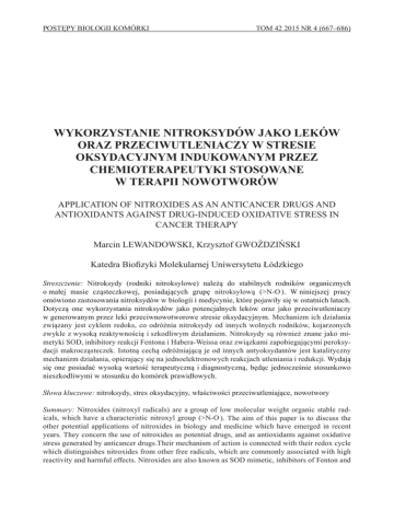 POSTĘPY BIOLOGII KOMÓRKI TOM 42 2015 NR 4 (667–686) WYKORZYSTANIE NITROKSYDÓW JAKO LEKÓW ORAZ PRZECIWUTLENIACZY W STRESIE OKSYDACYJNYM INDUKOWANYM PRZEZ CHEMIOTERAPEUTYKI STOSOWANE W TERAPII NOWOTWORÓW APPLICATION OF NITROXIDES AS AN ANTICANCER DRUGS AND ANTIOXIDANTS AGAINST DRUG-INDUCED OXIDATIVE STRESS IN CANCER THERAPY Marcin LEWANDOWSKI, Krzysztof GWOŹDZIŃSKI Katedra Biofizyki Molekularnej Uniwersytetu Łódzkiego Streszczenie: Nitroksydy (rodniki nitroksylowe) należą do stabilnych rodników organicznych o małej masie cząsteczkowej, posiadających grupę nitroksylową (>N-O.). W niniejszej pracy omówiono zastosowania nitroksydów w biologii i medycynie, które pojawiły się w ostatnich latach. Dotyczą one wykorzystania nitroksydów jako potencjalnych leków oraz jako przeciwutleniaczy w generowanym przez leki przeciwnowotworowe stresie oksydacyjnym. Mechanizm ich działania związany jest cyklem redoks, co odróżnia nitroksydy od innych wolnych rodników, kojarzonych zwykle z wysoką reaktywnością i szkodliwym działaniem. Nitroksydy są również znane jako mimetyki SOD, inhibitory reakcji Fentona i Habera-Weissa oraz związkami zapobiegającymi peroksydacji makrocząsteczek. Istotną cechą odróżniającą je od innych antyoksydantów jest katalityczny mechanizm działania, opierający się na jednoelektronowych reakcjach utleniania i redukcji. Wydają się one posiadać wysoką wartość terapeutyczną i diagnostyczną, będąc jednocześnie stosunkowo nieszkodliwymi w stosunku do komórek prawidłowych. Słowa kluczowe: nitroksydy, stres oksydacyjny, właściwości przeciwutleniające, nowotwory Summary: Nitroxides (nitroxyl radicals) are a group of low molecular weight organic stable radicals, which have a characteristic nitroxyl group (>N-O.). The aim of this paper is to discuss the other potential applications of nitroxides in biology and medicine which have emerged in recent years. They concern the use of nitroxides as potential drugs, and as antioxidants against oxidative stress generated by anticancer drugs.Their mechanism of action is connected with their redox cycle which distinguishes nitroxides from other free radicals, which are commonly associated with high reactivity and harmful effects. Nitroxides are also known as SOD mimetic, inhibitors of Fenton and 668 M. LEWANDOWSKI, K. GWOŹDZIŃSKI Haber–Weiss reactions and also protectants against peroxidation of macromolecules. They appear to have significant therapeutic and diagnostic value, while being relatively harmless to normal cells. Key-words: nitroxide, oxidative stress, antioxidant properties, cancer Wykaz stosowanych skrótów: CAT – katalaza; EPR – elektronowy rezonans paramagnetyczny; MMP-1 – metaloproteinazy matriks-1; NF-κB – czynnik jądrowy κB; SOD – dysmutazy ponadtlenkowe (manganowa: MnSOD oraz cynkowo-miedziowa: CuZnSOD); RFT – reaktywne formy tlenu; PARP – polimeraza poli(ADP-rybozy); RET – gen kodujący receptorową kinazę tyrozynową; STAT 3 – przekaźnik sygnału i aktywator transkrypcji 3 WSTĘP Nitroksydy są grupą syntetycznych rodników organicznych, posiadających niesparowany elektron zlokalizowany w grupie nitroksylowej >N·-O [50]. Charakteryzują się małą masą cząsteczkową, są nieszkodliwe dla komórek ssaków oraz swobodnie dyfundują przez błony komórkowe, choć oczywiście możliwe są wyjątki od tych reguł [18]. Głównym mechanizmem aktywności biologicznej nitroksydów jest regulacja poziomu stresu oksydacyjnego. Jest ona osiągana np. poprzez zmiatanie wolnych rodników, bezpośrednie oddziaływanie z nimi oraz zapobieganie redukcji nadtlenku wodoru do rodnika hydroksylowego w reakcji Fentona i Habera-Weissa przez utlenianie jonów Fe(II) do Fe(III) [7]. Nitroksydy są też mimetykami dysmutazy ponadtlenkowej (SOD), przerywają wolnorodnikowe łańcuchy reakcji, np. peroksydację lipidów. Jako rodniki uczestniczą w reakcji rekombinacji typu rodnik-rodnik oraz biorą udział w reakcjach przenoszenia elektronów, czym przejawiają swoje właściwości przeciwutleniające [51]. Nitroksydy hamują stres oksydacyjny, chociaż w pewnych warunkach mogą prowadzić do jego wzrostu. Dzieje się tak w komórkach nowotworowych oraz w przypadku zastosowania nadmiaru nitroksydu, który może wpływać na metabolizm żelaza zwiększając jego pulę dostępną do reakcji Fentona i Habera-Weissa, nasilając wytwarzanie reaktywnych form tlenu (RFT) [17, 18, 21]. Cechą odróżniającą nitroksydy od innych przeciwutleniaczy jest katalityczny mechanizm działania związany z jednoelektronowym cyklem redoks. W wyniku utleniania nitroksydu powstaje jon oksoamoniowy, z kolei redukcja prowadzi do hydroksyloaminy [22]. Jednak, w odpowiednich warunkach dochodzi do odtworzenia nitroksydu i w sposób ciągły może on pełnić swoją rolę przeciwutleniającą. Kolejnymi właściwościami odróżniającymi nitroksydy od innych przeciwutleniaczy jest łatwa dyfuzja przez błony (wiele przeciwutleniaczy nie przenika przez błony biologiczne), aktywność w stosunku do rodników, modulowanie poziomu tlenku azotu oraz możliwość zmiatania wolnych rodników wewnątrzkomórkowych [33]. W praktyce, nitroksydy są stosowane głównie w technice elektronowego rezonansu paramagnetycznego (EPR) jako znaczniki spinowe, jednakże w przyszłości WYKORZYSTANIE NITROKSYDÓW JAKO LEKÓW ORAZ PRZECIWUTLENIACZY... 669 ich zastosowanie może mieć znacznie szerszy charakter [18]. Właśnie temu zagadnieniu postanowiono poświęcić niniejszą pracę, bowiem właściwości chemiczne oraz fizyczne, metabolizm i szczegółowy mechanizm działania nitroksydów, zostały dokładnie opisane w innych opracowaniach [47, 50, 52, 53]. Ze względu na brak prac przeglądowych opisujących zastosowania nitroksydów, postanowiono skupić się na przedstawieniu badań, które mogą w przyszłości przełożyć się na ich zastosowanie w praktyce. Chodzi mianowicie o wykorzystanie tych 