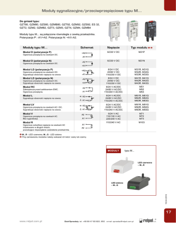 Moduły sygnalizacyjne/przeciwprzepięciowe typu M... Do gniazd typu: GZT80, GZM80, GZS80, GZMB80, GZT92, GZM92, GZS92, ES 32, GZT2, GZM2, GZMB2, GZT3, GZM3, GZT4, GZM4, GZMB4 Moduły typu M... są połączone równolegle z cewką przekaźnika. Polaryzacja P: -A1/+A2. Polaryzacja N: +A1/-A2. Moduły typu M... Schemat Napiêcie Typ modułu ❶ ❷ Moduł D (polaryzacja P) 6/230 V DC M21P Moduł D (polaryzacja N) 6/230 V DC M21N Moduł LD (polaryzacja P) 6/24 V DC 24/60 V DC 110/230 V DC M31R, M31G M32R, M32G M33R, M33G Moduł LD (polaryzacja N) 6/24 V DC 24/60 V DC 110/230 V DC M41R, M41G M42R, M42G M43R, M43G Moduł RC 6/24 V AC/DC 24/60 V AC/DC 110/240 V AC/DC M51 M52 M53 Moduł L 6/24 V AC/DC 24/60 V AC/DC 110/240 V AC/DC M61R, M61G M62R, M62G M63R, M63G Moduł LV 6/24 V AC/DC 24/60 V AC/DC 110/240 V AC/DC M91R, M91G M92R, M92G M93R, M93G Moduł V Ogranicza przepięcia na cewkach AC. Bez sygnalizacji. 6/24 V AC 110/130 V AC 220/240 V AC M71 M72 M73 Moduł R 110/240 V AC M103 Ogranicza przepięcia na cewkach DC. Ogranicza przepięcia na cewkach DC. Ogranicza przepięcia na cewkach DC. Sygnalizuje obecność napięcia na cewce. Ogranicza przepięcia na cewkach DC. Sygnalizuje obecność napięcia na cewce. Zabezpiecza przed zakłóceniem EMC. Ogranicza przepięcia. Sygnalizuje obecność napięcia na cewce. Ogranicza przepięcia na cewkach AC i DC. Sygnalizuje obecność napięcia na cewce. Ogranicza szkodliwe napięcia na cewkach AC indukowane w długich liniach, powodujące niepożądane zadziałania przekaźnika. ❶ M...R - LED czerwona, M...G - LED zielona ❷ Przy zamawianiu modułów należy wskazać ich kolor: szary lub czarny. MODUŁY typu M... LED czerwona – M...R 19.04.2016 LED zielona – M...G 17 www.relpol.com.pl Dzia³ Sprzeda¿y tel. +48 68 47 90 822, 850 • e-mail: [email protected]