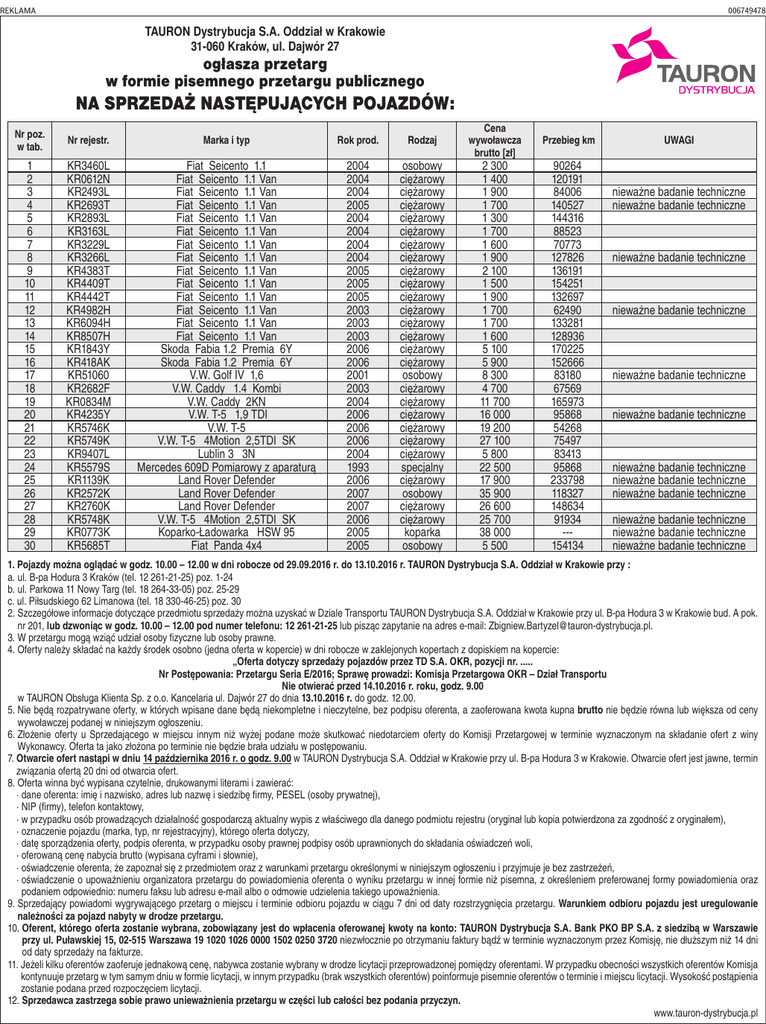 REKLAMA006749478 TAURON Dystrybucja S.A. Oddział w Krakowie 31-060 Kraków, ul. Dajwór 27 ogłasza przetarg w formie pisemnego przetargu publicznego NA SPRZEDAŻ NASTĘPUJĄCYCH POJAZDÓW: Nr poz. w tab. Nr rejestr. Marka i typ Rok prod. Rodzaj 1 2 3 4 5 6 7 8 9 10 11 12 13 14 15 16 17 18 19 20 21 22 23 24 25 26 27 28 29 30 KR3460L KR0612N KR2493L KR2693T KR2893L KR3163L KR3229L KR3266L KR4383T KR4409T KR4442T KR4982H KR6094H KR8507H KR1843Y KR418AK KR51060 KR2682F KR0834M KR4235Y KR5746K KR5749K KR9407L KR5579S KR1139K KR2572K KR2760K KR5748K KR0773K KR5685T Fiat Seicento 1.1 Fiat Seicento 1.1 Van Fiat Seicento 1.1 Van Fiat Seicento 1.1 Van Fiat Seicento 1.1 Van Fiat Seicento 1.1 Van Fiat Seicento 1.1 Van Fiat Seicento 1.1 Van Fiat Seicento 1.1 Van Fiat Seicento 1.1 Van Fiat Seicento 1.1 Van Fiat Seicento 1.1 Van Fiat Seicento 1.1 Van Fiat Seicento 1.1 Van Skoda Fabia 1.2 Premia 6Y Skoda Fabia 1.2 Premia 6Y V.W. Golf IV 1,6 V.W. Caddy 1.4 Kombi V.W. Caddy 2KN V.W. T-5 1,9 TDI V.W. T-5 V.W. T-5 4Motion 2,5TDI SK Lublin 3 3N Mercedes 609D Pomiarowy z aparaturą Land Rover Defender Land Rover Defender Land Rover Defender V.W. T-5 4Motion 2,5TDI SK Koparko-Ładowarka HSW 95 Fiat Panda 4x4 2004 2004 2004 2005 2004 2004 2004 2004 2005 2005 2005 2003 2003 2003 2006 2006 2001 2003 2004 2006 2006 2006 2004 1993 2006 2007 2007 2006 2005 2005 osobowy ciężarowy ciężarowy ciężarowy ciężarowy ciężarowy ciężarowy ciężarowy ciężarowy ciężarowy ciężarowy ciężarowy ciężarowy ciężarowy ciężarowy ciężarowy osobowy ciężarowy ciężarowy ciężarowy ciężarowy ciężarowy ciężarowy specjalny ciężarowy osobowy ciężarowy ciężarowy koparka osobowy Cena wywoławcza brutto [zł] 2 300 1 400 1 900 1 700 1 300 1 700 1 600 1 900 2 100 1 500 1 900 1 700 1 700 1 600 5 100 5 900 8 300 4 700 11 700 16 000 19 200 27 100 5 800 22 500 17 900 35 900 26 600 25 700 38 000 5 500 Przebieg km UWAGI 90264 120191 84006 140527 144316 88523 70773 127826 136191 154251 132697 62490 133281 128936 170225 152666 83180 67569 165973 95868 54268 75497 83413 95868 233798 118327 148634 91934 --- 154134 nieważne badanie techniczne nieważne badanie techniczne nieważne badanie techniczne nieważne badanie techniczne nieważne badanie techniczne nieważne badanie techniczne nieważne badanie techniczne nieważne badanie techniczne nieważne badanie techniczne nieważne badanie techniczne nieważne badanie techniczne nieważne badanie techniczne 1. Pojazdy można oglądać w godz. 10.00 – 12.00 w dni robocze od 29.09.2016 r. do 13.10.2016 r. TAURON Dystrybucja S.A. Oddział w Krakowie przy : a. ul. B-pa Hodura 3 Kraków (tel. 12 261-21-25) poz. 1-24 b. ul. Parkowa 11 Nowy Targ (tel. 18 264-33-05) poz. 25-29 c. ul. Piłsudskiego 62 Limanowa (tel. 18 330-46-25) poz. 30 2. Szczegółowe informacje dotyczące przedmiotu sprzedaży można uzyskać w Dziale Transportu TAURON Dystrybucja S.A. Oddział w Krakowie przy ul. B-pa Hodura 3 w Krakowie bud. A pok. nr 201, lub dzwoniąc w godz. 10.00 – 12.00 pod numer telefonu: 12 261-21-25 lub pisząc zapytanie na adres e-mail: [email protected]. 3. W przetargu mogą wziąć udział osoby fizyczne lub osoby prawne. 4. Oferty należy składać na każdy środek osobno (jedna oferta w kopercie) w dni robocze w zaklejonych kopertach z dopiskiem na kopercie: „Oferta dotyczy sprzedaży pojazdów przez TD S.A. OKR, pozycji nr. ..... Nr Postępowania: Przetargu Seria E/2016; Sprawę prowadzi: Komisja Przetargowa OKR – Dział Transportu Nie otwierać przed 14.10.2016 r. roku, godz. 9.00 w TAURON Obsługa Klienta Sp. z o.o. Kancelaria ul. Dajwór 27 do dnia 13.10.2016 r. do godz. 12.00. 5. N ie będą rozpatrywane oferty, w których wpisane dane będą niekompletne i nieczytelne, bez podpisu oferenta, a zaoferowana kwota kupna brutto nie będzie równa lub większa od ceny wywoławczej podanej w niniejszym ogłoszeniu. 6. Złożenie oferty u Sprzedającego w miejscu innym niż wyżej podane może skutkować niedotarciem oferty do Komisji Przetargowej w terminie wyznaczonym na składanie ofert z winy Wykonawcy. Oferta ta jako złożona po terminie nie będzie brała udziału w postępowaniu. 7. Otwarcie ofert nastąpi w dniu 14 października 2016 r. o godz. 9.00 w TAURON Dystrybucja S.A. Oddział w Krakowie przy ul. B-pa Hodura 3 w Krakowie. Otwarcie ofert jest jawne, termin związania ofertą 20 dni od otwarcia ofert. 8. Oferta winna być wypisana czytelnie, drukowanymi literami i zawierać: · dane oferenta: imię i nazwisko, adres lub nazwę i siedzibę firmy, PESEL (osoby prywatnej), · NIP (firmy), telefon kontaktowy, · w przypadku osób prowadzących działalność gospodarczą aktualny wypis z właściwego dla danego podmiotu rejestru (oryginał lub kopia potwierdzona za zgodność z oryginałem), · oznaczenie pojazdu (marka, typ, nr rejestracyjny), którego oferta dotyczy, · datę sporządzenia oferty, podpis oferenta, w przypadku osoby prawnej podpisy osób uprawnionych do składania oświadczeń woli, · oferowaną cenę nabycia brutto (wypisana cyframi i słownie), · oświadczenie oferenta, że zapoznał się z przedmiotem oraz z warunkami przetargu określonymi w niniejszym ogłoszeniu i przyjmuje je bez zastrzeżeń, · oświadczenie o upoważnieniu organizatora przetargu do powiadomienia oferenta o wyniku przetargu w innej formie niż pisemna, z określeniem preferowanej formy powiadomienia oraz podaniem odpowiednio: numeru faksu lub adresu e-mail albo o odmowie udzielenia takiego upoważnienia. 9. Sprzedający powiadomi wygrywającego przetarg o miejscu i terminie odbioru pojazdu w ciągu 7 dni od daty rozstrzygnięcia przetargu. Warunkiem odbioru pojazdu jest uregulowanie należności za pojazd nabyty w drodze przetargu. 10. Oferent, którego oferta zostanie wybrana, zobowiązany jest do wpłacenia oferowanej kwoty na konto: TAURON Dystrybucja S.A. Bank PKO BP S.A. z siedzibą w Warszawie przy ul. Puławskiej 15, 02-515 Warszawa 19 1020 1026 0000 1