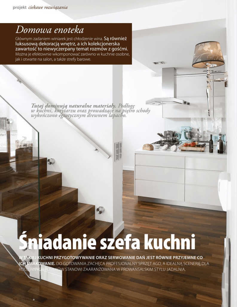 projekt ciekawe rozwiązania Domowa enoteka Głównym zadaniem winiarek jest chłodzenie wina. Są również luksusową dekoracją wnętrz, a ich kolekcjonerska zawartość to niewyczerpany temat rozmów z gośćmi. Można je efektownie wkomponować zarówno w kuchnie osobne, jak i otwarte na salon, a także strefy barowe. Tutaj dominują naturalne materiały. Podłogę w kuchni, korytarzu oraz prowadzące na piętro schody wykończono egzotycznym drewnem lapacho. Śniadanie szefa kuchni W TAKIEJ KUCHNI PRZYGOTOWYWANIE ORAZ SERWOWANIE DAŃ JEST RÓWNIE PRZYJEMNE CO ICH SMAKOWANIE. DO GOTOWANIA ZACHĘCA PROFESJONALNY SPRZĘT AGD, A IDEALNĄ SCENERIĘ DLA RODZINNYCH POSIŁKÓW STANOWI ZAARANŻOWANA W PROWANSALSKIM STYLU JADALNIA. 66 6/2011 ■ w w w.dobr zemieszk aj.pl projekt ciekawe rozwiązania Wyposażenie godne najlepszej restauracji: w zabudowie lodówka, winiarka, mikrofalówka, piekarnik oraz szuflada podgrzewająca talerze marki Viking. Profesjonalny sprzęt pomaga w kuchennych pracach, a dzięki winiarce można zaserwować francuskie wino w idealnej temperaturze. Strefa gotowania z widokiem na jadalnię w stylu prowansalskim. Wszystkie meble do jadalni wybrano z oferty sklepu Flaming&Co. Prezentują się doskonale na tle wykończonej piaskowcem ściany. Płyta grzejna oraz okap z katalogu marki Viking. UROKLIWY KLIMAT PROWANSJI tworzą przede wszystkim meble wybrane przez panią domu do jadalni: surowy drewniany stół oraz ława ustawiona pod oknem, krzesła, a także komoda z wiklinowymi koszykami. Cały zestaw prezentuje się niezwykle efektownie na jasnym tle ścian, z których jedna została wykończona piaskowcem. Duża ilość światła dziennego, wpadającego przez wysokie okna, podkreśla pogodny charakter wnętrza. Zastosowane kolory i materiały umożliwiły zrealizowanie najważniejszych założeń projektu. Kuchnia miała być przede wszystkim jasna – stąd białe blaty i fronty szafek kuchennych – oraz funkcjonalna. Gwarantuje to duża powierzchnia blatu roboczego oraz profesjonalne sprzęty AGD (firmy Viking). Przeciwwagę dla mebli w stylu prowansalskim stanowi zabudowa kuchenna wykonana z wykorzystaniem nowoczesnych materiałów. Ponieważ cały projekt miał łączyć nowoczesność z nutą stylu wiejskiego, postawiliśmy na podstawowe kolory i jak najprostszą formę – wyjaśnia arch. Natalia Rychtelska, autorka projektu. Brak tradycyjnych uchwytów oraz kolor zabudowy podkreślają nowoczesny styl wnętrza. Otwarta szafka pod płytą grzejną zapewnia szybki dostęp do kuchennych narzędzi i zapasów (od strony kuchni) oraz umożliwia wyeksponowanie (od strony jadalni) np. książek kucharskich. projekt ciekawe rozwiązania Fronty meblowe wykonano z białego, lakierowanego MDF-u, blaty robocze z kompozytu DuPont™ Corian®, ścianę zabezpiecza szkło. Pojemniki i dodatki w błękitnym kolorze doskonale uzupełniają kuchnię. Bagietki z konfiturami nabierają nowego smaku serwowane na drewnianym stole rodem z wiejskiej oberży. Nad stołem designerskie lampy „Umbrella” firmy LedSC4. Wszystkie szafki kuchenne zostały wykonane z białego MDF-u, a blaty z białego kompozytu DuPont™ Corian®. Kształt zabudowy kuchennej maksymalnie wykorzystuje przestrzeń, a także odwraca uwagę od stojącego na środku słupa konstrukcyjnego, który udało się „wtopić” w całość. Chociaż nie ma tu typowej wyspy, to linia zabudowy zwieńczona blatem, w którym umieszczono płytę grzejną, oddziela kuchnię od jadalni, zapewniając jednocześnie kontakt osobom znajdującym się w obu strefach. Zabudowa kuchenna w kształcie litery U to pełna wygoda dla osoby gotującej – wszystko jest na wyciągnięcie ręki. Oryginalna aranżacja przestrzeni pod płytą grzejną gwarantuje jej praktyczny charakter oraz łączy nowoczesny styl kuchni z sielskim klimatem jadalni. ■ TEKST: ANNA USAKIEWICZ ZDJĘCIA: BARTOSZ JAROSZ ■ STYLIZACJA: EWA SZYŁKO AUTORKI PROJEKTU: ARCH. NATALIA RYCHTELSKA, BEATA CZECHOWICZ; EJSMONT PRACOWNIA ARCHITEKTONICZNA POWIERZCHNIA: OK. 14 M2 (BEZ JADALNI)