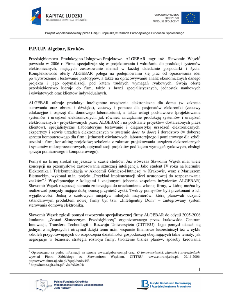 Projekt współfinansowany przez Unię Europejską w ramach Europejskiego Funduszu Społecznego P.P.U.P. Algebar, Kraków Przedsiębiorstwo Produkcyjno-Usługowo-Projektowe ALGEBAR mgr inż. Sławomir Wąsek1 powstało w 2006 r. Firma specjalizuje się w projektowaniu i wdrażaniu do produkcji systemów elektronicznych, mających zastosowanie niemal w każdej dziedzinie gospodarki i życia. Kompleksowość oferty ALGEBAR polega na podejmowaniu się prac od opracowania idei po wytworzenie i testowanie prototypów, a także na opracowywaniu analiz ekonomicznych danego projektu i jego optymalizacji pod kątem trudnych wymagań rynkowych. Swoją ofertę przedsiębiorstwo kieruje do firm, także z branż specjalistycznych, jednostek naukowych i oświatowych oraz klientów indywidualnych. ALGEBAR oferuje produkty: inteligentne urządzenia elektroniczne dla domu (w zakresie sterowania oraz obrazu i dźwięku), zestawy i pomoce dla pasjonatów elektroniki (zestawy edukacyjne i osprzęt dla domowego laboratorium), a także usługi podstawowe (projektowanie systemów i urządzeń elektronicznych, jak również zarządzanie produkcją systemów i urządzeń elektronicznych - projektowanych przez ALGEBAR i na podstawie projektów dostarczonych przez klientów), specjalistyczne (laboratoryjne testowanie i diagnostykę urządzeń elektronicznych, ekspertyzy i serwis urządzeń elektronicznych w systemie door to door) i doradztwo (w doborze sprzętu komputerowego dla firm i jednostek oświatowych, laboratoryjnego i pomiarowego dla szkół, uczelni i firm; konsulting projektów; szkolenia z zakresu: projektowania urządzeń elektronicznych i systemów mikroprocesorowych, optymalizacji projektów pod kątem wymagań rynkowych, obsługi sprzętu pomiarowego i komputerowego). Pomysł na firmę zrodził się jeszcze w czasie studiów. Już wówczas Sławomir Wąsek miał wiele koncepcji na przemysłowe zastosowania sztucznej inteligencji. Jako student IV roku na kierunku Elektronika i Telekomunikacja w Akademii Górniczo-Hutniczej w Krakowie, wraz z Mariuszem Biernackim, wykonał m.in. projekt „Przykład implementacji sieci neuronowej do rozpoznawania znaków”.2 Współpracując z kolegami i znajomymi (obecnie zespołem inżynierów ALGEBAR) Sławomir Wąsek rozpoczął starania zmierzające do uruchomienia własnej firmy, w której można by realizować pomysły mające dużą szansę przynieść zyski. Twórcy pomysłów byli przekonani o ich wyjątkowości. Jedną z czołowych inicjatyw młodych inżynierów, którą planowali uczynić sztandarowym produktem nowej firmy był tzw. „Inteligentny Dom” – zintegrowany system sterowania domową elektroniką. Sławomir Wąsek zgłosił pomysł utworzenia specjalistycznej firmy ALGEBAR do edycji 2005-2006 konkursu „Zostań Skutecznym Przedsiębiorcą” organizowanego przez krakowskie Centrum Innowacji, Transferu Technologii i Rozwoju Uniwersytetu (CITTRU). Jego pomysł okazał się jednym z najlepszych i otrzymał dzięki temu m.in. wsparcie finansowe (uczestniczył też w cyklu szkoleń przygotowujących do rozpoczęcia działalności gospodarczej obejmujących takie tematy, jak negocjacje w biznesie, strategia rozwoju firmy, tworzenie biznes planów, sposoby kreowania 1 Opracowano na podst. informacji na stronie www.algebar.com.pl oraz: O innowacyjności, planach i przeszkodach, wywiad Piotra Żabickiego ze Sławomirem Wąskiem, CITTRU, www.cittru.uj.edu.pl, 29.11.2006. http://www.cittru.uj.edu.pl/?q=pl/node/453 2 http://home.agh.edu.pl/~vlsi/AI/ex01/ 1 Projekt współfinansowany przez Unię Europejską w ramach Europejskiego Funduszu Społecznego wizerunku, a następnie przez kilka miesięcy mógł korzystać z doradztwa indywidualnego ze specjalistami z różnych dziedzin biznesu). Docenienie biznes planu firmy ALGEBAR przyspieszyło realizację decyzji o uruchomieniu działalności gospodarczej na własny rachunek. W ten sposób zostało zarejestrowane Przedsiębiorstwo Produkcyjno-Usługowo-Projektowe ALGEBAR mgr inż. Sławomir Wąsek. Był to kolejny „kamień milowy” obranej strategii: ukończenie elektroniki, uzyskanie tytułu magistra inżyniera tego kierunku, założenie firmy i kierowanie zespołem tworzącym w tej branży. Dotacja uzyskana dzięki nagrodzie w konkursie CITTRU została przeznaczona na zorganizowanie i wyposażenie laboratorium, które jeszcze bardziej poszerzyło możliwości firmy w zakresie projektowania i produkcji prototypowych urządzeń. Przedsiębiorstwo pozyskało do współpracy m.in. takich partnerów, jak producenci i dystrybutorzy produktów Pioneer, JVC czy marki ONMAX, PIOX Systemy Komputerowe oraz www.wypozyczalniasieci.pl. ALGEBAR realizuje koncepcje na zamówienie, ale także dużo uwagi poświęca na tworzenie, a następnie wdrażanie własnych pomysłów. Sprzyja to kreatywności, pozwala poszerzać ofertę firmy i zdobywać nowych klientów. To oni zapewniają wpływy pokrywające koszty prowadzenia działalności oraz rozwijania kolejnych autorskich pomysłów zespołu ALGEBAR. Sukces firmy ALGEBAR był możliwy dzięki odpowiedniemu przygotowaniu i nastawieniu jej twórcy – Sławomira Wąska, do podjęcia wyzwania, jakim było prowadzenie przedsiębiorstwa. Założyciel firmy miał przemyślaną strategię działania i pomysł na własną przyszłość po ukończeniu studiów. Pragnął wdrażać własne idee w praktyce. Skorzystał też z okazji uczestniczenia w konkursie CITTRU, co zaowocowało otrzymaniem funduszy na start. Uruchomienie działalności gospodarczej było poprzedzone stosunkowo długim okresem przygotowawczym, kiedy w szerszym zespole powstawały pomysły na praktyczne zastosowania w życiu codziennym prostych w użyciu i ekonomicznych rozwiązań z dziedziny nowoczesnych technologii. Młodzi innowatorzy byli przekonani o wysokiej wartości swoich pomysłów i możliwości zarabiania na nich. Na sukces ALGEBAR pracuje jego zespół - głównie młodzi ludzie, ale z doświadcz