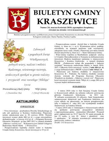 BIULETYN GMINY KRASZEWICE Numer 24; marzec/kwiecień 2010; egzemplarz bezpłatny; równieŜ na stronie: www.kraszewice.pl Biuletyn przygotowywany i publikowany przez Urząd Gminy Kraszewice na zlecenie Wójta Gminy Kolegium redakcyjne: Marta Pijanka, Paulina Gajdka Zdrowych i pogodnych Świąt Wielkanocnych, pełnych wiary, nadziei i miłości. Radosnego, wiosennego nastroju, serdecznych spotkań w gronie rodziny i przyjaciół oraz wesołego "Alleluja" - Przeprowadzono remont dwóch biur w budynku Urzędu Gminy, tj. biuro nr 1 i nr 6. Wymieniono drzwi, podłogi, oświetlenie, na ścianach połoŜono tynk wewnętrzny, zakupiono nowe szafy i biurko. Planowany jest takŜe remont dwóch innych biur tj. biuro nr 2 i biuro Sekretarza Gminy. - Wójt Gminy wspólnie ze Skarbnikiem podpisali umowę w Urzędzie Marszałkowskim w Poznaniu na dofinansowanie inwestycji: Budowa kanalizacji sanitarnej w miejscowości Kraszewice i Kuźnica Grabowska w ramach działania PROW „Podstawowe usługi dla gospodarki i ludności wiejskiej” Inwestycja realizowana będzie w latach 20102011. Całkowity koszt inwestycji wynosi 3 mln 484 tyś. zł, z czego dofinansowanie z PROW wynosi 2 mln 141tyś. zł. - Planowana jest budowa chodnika w miejscowości Kraszewice B - Podrenta. Na budowę chodnika zostanie złoŜony wniosek do Programu Rozwoju Obszarów Wiejskich na działanie „ Odnowa i rozwój wsi”. Planowany koszt inwestycji wyniesie około 700tyś zł, z czego 500 tyś zł wynosić będzie dofinansowanie. Ŝyczą: WYDARZENIA Przewodniczący Rady Gminy Gminy /-/Stanisław Baś Wójt Gminy /-/Józef Olszewski AKTUALNOŚCI AKTUALNO CI INWESTYCJE – Trwa inwestycja - przebudowa Dworku Szlacheckiego na cele sali sportowej w Kuźnicy Grabowskiej. Planowany termin zakończenia prac to 30 czerwca 2010r. Wartość inwestycji wynosi około 800 tyś zł, z czego otrzymaliśmy dofinansowanie w kwocie 414 tyś zł. z Programu Rozwoju Obszarów Wiejskich na lata 2007-2013 w ramach działania „Odnowa i rozwój wsi”. Wykonawcą jest Zakład Usługowo Budowlany Marek Malik z Wieruszowa. - Przeprowadzono kapitalny remont toalet w budynku Urzędu Gminy Kraszewice. Koszt inwestycji to 19 tyś zł. - 5 marca 2010 roku w Sali Sesyjnej Urzędu Gminy w Kraszewicach odbyło się zebranie sołtysów poświęcone głównie Funduszowi Sołeckiemu na 2011 rok. W zebraniu uczestniczyło 10 sołtysów. Sami bezpośrednio zainteresowani debatowali nad Funduszem Sołeckim, po czym odbyło się głosowanie, na którym przegłosowano, Ŝeby w budŜecie w roku 2011 nie wyodrębniać środków finansowych na Fundusz Sołecki. - 5 marca 2010 roku w Gimnzajum w Kraszewicach odbyło się spotkanie poświęcone przyjazdowi młodzieŜy z zaprzyjaźnionej gminy niemieckiej Albersdorf. Przyjazd gości zaplanowano na 10-17 lipca br. W sumie przyjadą do nas 23 osoby, w tym 20 dzieci i młodzieŜy oraz 3 opiekunów. W zebraniu uczestniczyli zainteresowani nauczyciele, rodzice i młodzieŜ. Źródło: UG Kraszewice 1 Sesje Rady Gminy w Kraszewicach I Turniej Tenisa Stołowego XXXIV Sesja Rady Gminy w Kraszewicach odbyła się w dniu 22 marca 2010r. Podczas sesji podjęto następujące uchwały: - Uchwała Nr XXXIV/158/2010 Rady Gminy w Kraszewicach w sprawie zmian w budŜecie gminy Kraszewice na 2010 rok; - Uchwała Nr XXXIV/159/2010 Rady Gminy w Kraszewicach w sprawie zaciągnięcia kredytu długoterminowego -Uchwała Nr XXXIV/160/2010 Rady Gminy w Kraszewicach w sprawie nie wyraŜenia zgody na wyodrębnienie w budŜecie gminy roku2011 środków na fundusz sołecki -Uchwała Nr XXXIV/161/2010 Rady Gminy w Kraszewicach w sprawie nadania imienia „Kardynała Karola Wojtyły” Szkole Podstawowej w Kuźnicy Grabowskiej - Uchwała Nr XXXIV/162/2010 Rady Gminy w Kraszewicach w sprawie zmieniająca uchwałę nr XXVI/102/93 z dnia 28 czerwca 1993r. w sprawie uchylenia uchwały Nr XIII/52/9 z dnia 16 sierpnia 1991r. dot. utworzenia przedszkola samorządowego. W dniu 28 lutego 2010. w Sali OSP w Kuźnicy Grabowskiej odbył się I Turniej Tenisa Stołowego o Puchar Wójta Gminy Kraszewice, Sołtysa Wsi Kuźnica Grabowska, Dyrektora Szkoły Podstawowej w Kuźnicy Grabowskiej i Świetlicy Środowiskowej w Kuźnicy Grabowskiej. Blisko100 osób kibicowało uczestnikom w organizowanym pod hasłem ,,I DLA MŁODYCH I DLA STARYCH TENIS ZAWSZE DOSKONAŁY”. Głównymi organizatorami i pomysłodawcami byli sołtys wsi Kuźnica Grabowska Leon Owczarek i Agnieszka Pędziwiatr szefowa Świetlicy Środowiskowej w Kuźnicy Grabowskiej. Do rywalizacji stanęło blisko 50 zawodników w wieku od 6 do 106 lat. O puchary walczono w czterech kategoriach: klasy 1-3 i 4-6, gimnazjum oraz seniorzy. W kaŜdej kategorii walczyli o inny puchar: Wójta, Sołtysa, Świetlicy Środowiskowej oraz Dyrektora Szkoły Podstawowej. Turniej oprócz wymiaru sportowego miał równieŜ wymiar edukacyjny. Organizatorzy zaprosili Panią sierŜ. Ewę Jakubowską z KPP w Ostrzeszowie, która opowiadała o bezpieczeństwie dzieci i młodzieŜy. Rozdano dzieciom równieŜ policyjne gadŜety. Nie zabrakło równieŜ niespodzianek, tuŜ po ogłoszeniu wyników i rozdaniu nagród odbył się mecz ,,NIESPODZIANKA'' pomiędzy Naszym Wójtem Gminy Józefem Olszewskim, a księdzem wikariuszem Piotrem Kuświkiem. Wójt wygrał 2:1, ale walka była zacięta przez cały mecz. „ Aktywizacja zawodowa szansą na lepsze jutro” Gminny Ośrodek Pomocy Społecznej w Kraszewicach informuje, Ŝe złoŜony wniosek aplikacyjny do Wojewódzkiego Urzędu Pracy w Poznaniu o dofinansowanie projektu systemowego "Aktywizacja zawodowa szansą na lepsze jutro" w ramach Programu Operacyjnego Kapitał Ludzki, Priorytet VII, Działanie 7.1, Poddziałanie 7.1.1, współfinansowany z Europejskiego Funduszu Społecznego przeszedł pozytywną ocenę formalna i merytoryczną, a teraz czeka za podpisaniem aneksu do umowy. Projekt ten będzie realizowany juŜ 3 rok w naszej gminie. W projekcie zaplanowano udział 16 osób z naszej g