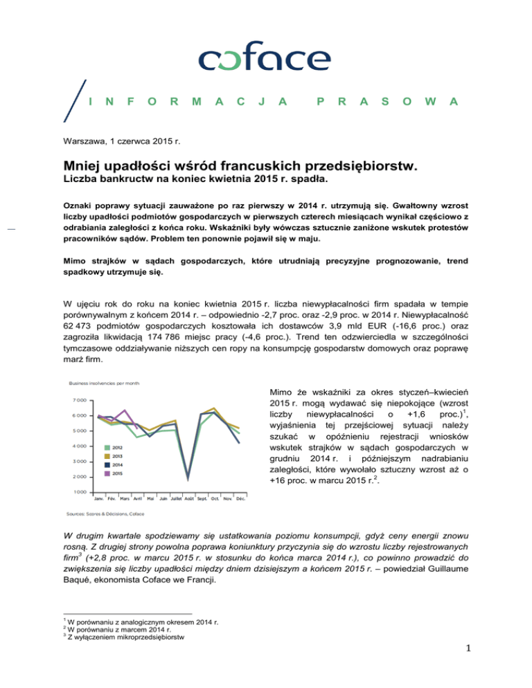 I N F O R M A C J A P R A S O W A Warszawa, 1 czerwca 2015 r. Mniej upadłości wśród francuskich przedsiębiorstw. Liczba bankructw na koniec kwietnia 2015 r. spadła. Oznaki poprawy sytuacji zauważone po raz pierwszy w 2014 r. utrzymują się. Gwałtowny wzrost liczby upadłości podmiotów gospodarczych w pierwszych czterech miesiącach wynikał częściowo z odrabiania zaległości z końca roku. Wskaźniki były wówczas sztucznie zaniżone wskutek protestów pracowników sądów. Problem ten ponownie pojawił się w maju. Mimo strajków w sądach gospodarczych, które utrudniają precyzyjne prognozowanie, trend spadkowy utrzymuje się. W ujęciu rok do roku na koniec kwietnia 2015 r. liczba niewypłacalności firm spadała w tempie porównywalnym z końcem 2014 r. – odpowiednio -2,7 proc. oraz -2,9 proc. w 2014 r. Niewypłacalność 62 473 podmiotów gospodarczych kosztowała ich dostawców 3,9 mld EUR (-16,6 proc.) oraz zagroziła likwidacją 174 786 miejsc pracy (-4,6 proc.). Trend ten odzwierciedla w szczególności tymczasowe oddziaływanie niższych cen ropy na konsumpcję gospodarstw domowych oraz poprawę marż firm. Mimo że wskaźniki za okres styczeń–kwiecień 2015 r. mogą wydawać się niepokojące (wzrost 1 liczby niewypłacalności o +1,6 proc.) , wyjaśnienia tej przejściowej sytuacji należy szukać w opóźnieniu rejestracji wniosków wskutek strajków w sądach gospodarczych w grudniu 2014 r. i późniejszym nadrabianiu zaległości, które wywołało sztuczny wzrost aż o 2 +16 proc. w marcu 2015 r. . W drugim kwartale spodziewamy się ustatkowania poziomu konsumpcji, gdyż ceny energii znowu rosną. Z drugiej strony powolna poprawa koniunktury przyczynia się do wzrostu liczby rejestrowanych 3 firm (+2,8 proc. w marcu 2015 r. w stosunku do końca marca 2014 r.), co powinno prowadzić do zwiększenia się liczby upadłości między dniem dzisiejszym a końcem 2015 r. – powiedział Guillaume Baqué, ekonomista Coface we Francji. 1 2 3 W porównaniu z analogicznym okresem 2014 r. W porównaniu z marcem 2014 r. Z wyłączeniem mikroprzedsiębiorstw 1 Pogorszenie sytuacji w 3 sektorach: metalowym, budowlanym i usług dla ludności O ile w segmencie przedsiębiorstw o obrotach od 2,5 do 10 mln EUR nastąpił gwałtowny spadek liczby upadłości, o tyle w segmencie większych firm (obroty powyżej 10 mln EUR) wskaźnik ten wzrósł na początku roku, po czym zaczął spadać w kwietniu. Pod względem 100 największych upadłości według wartości obrotów, pierwsze trzy miejsca zajmują następujące branże: metalowa (15 proc. ogółu), budowlana (17 proc.) oraz, po raz pierwszy w tym zestawieniu, branża usług dla ludności (5 proc.). Są to także trzy sektory spośród 11 badanych, w których odnotowano wzrost liczby upadłości. Gorsza sytuacja w regionie Ile-de-France Na mapie upadłości we Francji zaszły pewne zmiany. Sześć regionów odnotowało wyraźną poprawę – liczba upadłości zmniejszyła się tam o ponad 5 proc.; w szczególności jest to Akwitania (-10,2 proc.) i Limousin (-8 proc.). Wzrost liczby upadłości nastąpił tylko w pięciu regionach i wyniósł od +5,1 proc. w Alzacji do +0,3 proc. w Ile-de-France, na który to region przypada 19,7 proc. wszystkich upadłości we Francji. W tych dwóch regionach najbardziej ucierpiał sektor budowlany. Najgorzej radzą sobie firmy zajmujące się budową domów dla prywatnych inwestorów w Ile-de-France, gdzie liczba upadłości firm zwiększyła się o +10,3 proc. KONTAKT DLA MEDIÓW: Anna A. GUZIK – T. +48 22 465 02 22, M. +48 509 467 531 – E. [email protected] Informacje o Coface Grupa Coface, światowy lider w obszarze ubezpieczeń należności, oferuje firmom na całym świecie rozwiązania w zakresie ochrony przed ryzykiem niewypłacalności ich klientów, zarówno w transakcjach krajowych jak i eksportowych. W 2014 r. Grupa, wspierana przez 4,446 swoich pracowników, osiągnęła skonsolidowany obrót w wysokości 1,441 mld EUR. Działając w sposób pośredni lub bezpośredni w 98 krajach, zabezpiecza transakcje 40 tys. spółek z ponad 200 krajów. We Francji Coface zarządza gwarancjami eksportowymi w imieniu skarbu państwa. W Polsce Coface jest obecny od 1992 roku. Ubezpiecza należności krajowe i eksportowe, oferuje finansowanie poprzez faktoring, a także raporty handlowe o firmach z całego świata i marketingowe bazy danych. Prowadzi monitoring i windykację należności B2B. Więcej informacji o firmie oraz pozostałe komunikaty prasowe dostępne na www.coface.pl Spółka Coface SA jest notowana w indeksie Euronext Paris – Compartment A na giełdzie papierów wartościowych w Paryżu pod numerem ISIN: FR0010667147 / Skrót: COFA 2