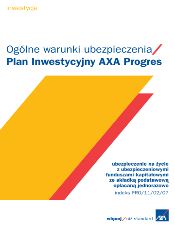 inwestycje Ogólne warunki ubezpieczenia Plan Inwestycyjny AXA Progres ubezpieczenie na życie z ubezpieczeniowymi funduszami kapitałowymi ze składką podstawową opłacaną jednorazowo indeks PRO/11/02/07 Ogólne warunki ubezpieczenia na życie z ubezpieczeniowymi funduszami kapitałowymi ze składką podstawową opłacaną jednorazowo Plan Inwestycyjny AXA Progres Postanowienia ogólne §1 Niniejsze Ogólne warunki ubezpieczenia na życie z ubezpieczeniowymi funduszami kapitałowymi ze składką podstawową opłacaną jednorazowo Plan Inwestycyjny AXA Progres stosuje się do umów ubezpieczenia na życie z ubezpieczeniowymi funduszami kapitałowymi zawieranych przez AXA Życie Towarzystwo Ubezpieczeń S.A. z Ubezpieczającymi. Definicje §2 Określenia użyte w OWU oraz w innych dokumentach stanowiących integralną część umowy ubezpieczenia oznaczają: 1) alokacja – procentowy podział składki podstawowej lub odpowiednio składki dodatkowej pomiędzy wybrane ubezpieczeniowe fundusze kapitałowe, w celu nabycia jednostek uczestnictwa tych funduszy, ustalony przez Ubezpieczającego; 2) Beneficjent wykupu – Ubezpieczający lub Ubezpieczony uprawniony do otrzymania wartości polisy lub jej części z wyłączeniem przypadku określonego w § 8 OWU; 3) data rozpoczęcia ochrony – określony w polisie dzień zawarcia umowy ubezpieczenia lub odpowiednio następny dzień po upływie terminu do złożenia sprzeciwu w przypadku określonym w § 4 ust. 5 OWU, w którym rozpoczyna się odpowiedzialność Towarzystwa z tytułu udzielania ochrony ubezpieczeniowej; 4) dzień przeliczenia – termin nabycia jednostek uczestnictwa ubezpieczeniowego funduszu kapitałowego przypadający nie później niż w terminie 4 dni roboczych od daty rozpoczęcia ochrony lub od dnia zapłaty składki podstawowej, jeżeli została wpłacona po dniu rozpoczęcia ochrony ubezpieczeniowej lub odpowiednio od daty zapłaty składki dodatkowej bądź od dnia umorzenia jednostek wszystkich ubezpieczeniowych funduszy kapitałowych podlegających konwersji; 5) dzień umorzenia – termin umorzenia jednostek uczestnictwa ubezpieczeniowego funduszu kapitałowego przypadający nie później niż w terminie 3 dni roboczych od dnia akceptacji przez Towarzystwo dyspozycji lub wniosku Ubezpieczającego lub Uposażonego lub odpowiednio od dnia pobrania przez Towarzystwo odpowiedniej opłaty; 6) jednostka uczestnictwa – część ubezpieczeniowego funduszu kapitałowego stanowiąca proporcjonalny udział w aktywach netto tego Funduszu; 7) konwersja – nabycie jednostek uczestnictwa ubezpieczeniowego funduszu kapitałowego za środki uzyskane z umorzenia jednostek uczestnictwa innego funduszu; 8) OWU – niniejsze Ogólne warunki ubezpieczenia na życie z ubezpieczeniowymi funduszami kapitałowymi ze składką podstawową opłacaną jednorazowo Plan Inwestycyjny AXA; 9) polisa – dokument wystawiany przez Towarzystwo, potwierdzający zawarcie umowy ubezpieczenia; 10) rachunek dodatkowy – wyodrębniony rachunek jednostek uczestnictwa, na którym ewidencjonowane są jednostki uczestnictwa nabyte za środki pochodzące ze składek dodatkowych; 11) rachunek podstawowy – wyodrębniony rachunek jednostek uczestnictwa, na którym ewidencjonowane są jednostki uczestnictwa nabyte za środki pochodzące ze składki podstawowej; 12) rocznica polisy – dzień w każdym roku kalendarzowym obowiązywania umowy ubezpieczenia, odpowiadający dacie rozpoczęcia ochrony, a jeżeli nie ma takiego dnia w danym roku – ostatni dzień miesiąca kalendarzowego, w którym przypada data rozpoczęcia ochrony; 13) rok polisy – 12-miesięczny okres rozpoczynający się od daty rozpoczęcia ochrony; 14) składka dodatkowa – składka nieobowiązkowa z tytułu umowy ubezpieczenia opłacana przez Ubezpieczającego w dowolnym okresie obowiązywania umowy ubezpieczenia po upływie pierwszego roku polisy; 15) składka podstawowa – składka obowiązkowa z tytułu umowy ubezpieczenia opłacana przez Ubezpieczającego; 16) Strony – Towarzystwo i Ubezpieczający; 17) suma ubezpieczenia – kwota określona w polisie, którą Towarzystwo zobowiązuje się wypłacić w przypadku śmierci Ubezpieczonego w okresie odpowiedzialności Towarzystwa z tytułu ochrony ubezpieczeniowej; 18) świadczenie ubezpieczeniowe – kwota należna osobom uprawnionym w przypadku śmierci Ubezpieczonego w okresie odpowiedzialności Towarzystwa z tytułu udzielania ochrony ubezpieczeniowej; 19) Towarzystwo – AXA Życie Towarzystwo Ubezpieczeń S.A. z siedzibą w Warszawie; 20) Ubezpieczający – osoba fizyczna, która w dniu podpisania wniosku Ubezpieczeniowego ukończyła 18. rok życia, osoba prawna lub jednostka organizacyjna nieposiadająca osobowości prawnej, która zawarła umowę ubezpieczenia i jest zobowiązana do opłacenia składki podstawowej; 21) ubezpieczeniowy fundusz kapitałowy lub fundusz – ubezpieczeniowy fundusz kapitałowy oferowany przez Towarzystwo w związku z umową ubezpieczenia, stanowiący wydzielony fundusz aktywów lokowanych zgodnie z postanowieniami regulaminu właściwego ubezpieczeniowego funduszu kapitałowego; 22) Ubezpieczony – osoba fizyczna, na rzecz której Ubezpieczający zawarł umowę ubezpieczenia; 23) umowa ubezpieczenia – umowa ubezpieczenia na życie z ubezpieczeniowymi funduszami kapitałowymi zawarta na podstawie OWU; 24) Uposażony – osoba fizyczna, osoba prawna lub jednostka organizacyjna nieposiadająca osobowości prawnej, wskazana przez Ubezpieczonego, uprawniona do otrzymania świadczenia ubezpieczeniowego na wypadek śmierci Ubezpieczonego lub wartości polisy w przypadku określonym w § 8 OWU; 25) wartość dodatkowa polisy – część wartości polisy stanowiąca sumę iloczynów liczby jednostek uczestnictwa każdego z ubezpieczeniowych funduszy kapitałowych zewidencjonowanych na rachunku dodatkowym i ceny jednostki uczestnictwa danego funduszu obowiązującej w dniu, na który jest ustalana w