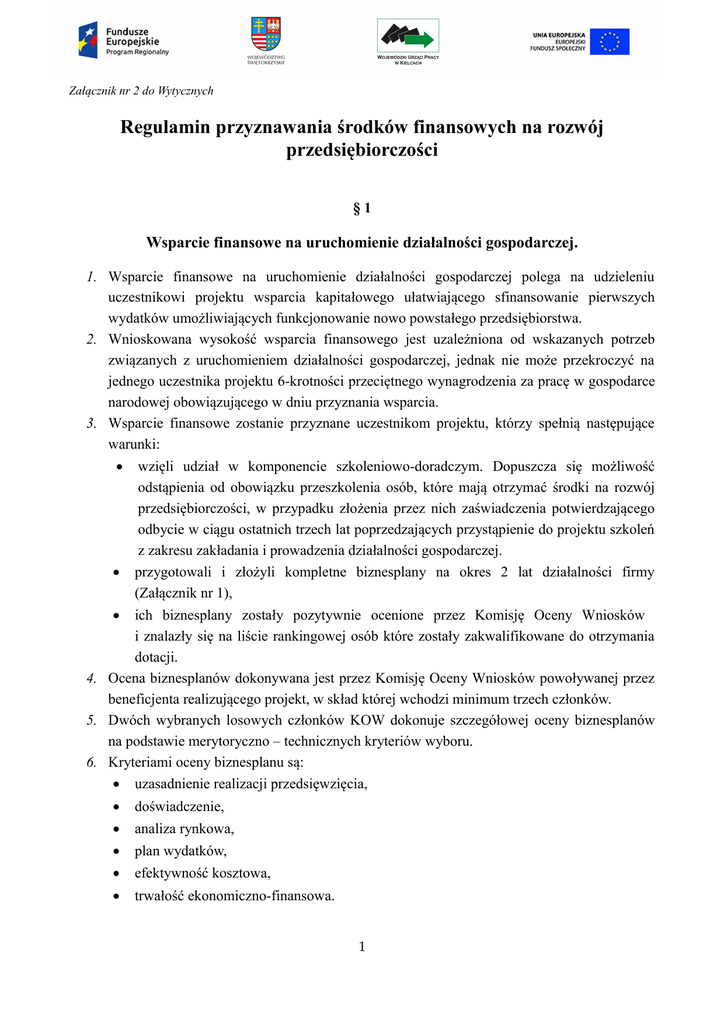 Załącznik nr 2 do Wytycznych Regulamin przyznawania środków finansowych na rozwój przedsiębiorczości §1 Wsparcie finansowe na uruchomienie działalności gospodarczej. 1. Wsparcie finansowe na uruchomienie działalności gospodarczej polega na udzieleniu uczestnikowi projektu wsparcia kapitałowego ułatwiającego sfinansowanie pierwszych wydatków umożliwiających funkcjonowanie nowo powstałego przedsiębiorstwa. 2. Wnioskowana wysokość wsparcia finansowego jest uzależniona od wskazanych potrzeb związanych z uruchomieniem działalności gospodarczej, jednak nie może przekroczyć na jednego uczestnika projektu 6-krotności przeciętnego wynagrodzenia za pracę w gospodarce narodowej obowiązującego w dniu przyznania wsparcia. 3. Wsparcie finansowe zostanie przyznane uczestnikom projektu, którzy spełnią następujące warunki: wzięli udział w komponencie szkoleniowo-doradczym. Dopuszcza się możliwość odstąpienia od obowiązku przeszkolenia osób, które mają otrzymać środki na rozwój przedsiębiorczości, w przypadku złożenia przez nich zaświadczenia potwierdzającego odbycie w ciągu ostatnich trzech lat poprzedzających przystąpienie do projektu szkoleń z zakresu zakładania i prowadzenia działalności gospodarczej. przygotowali i złożyli kompletne biznesplany na okres 2 lat działalności firmy (Załącznik nr 1), ich biznesplany zostały pozytywnie ocenione przez Komisję Oceny Wniosków i znalazły się na liście rankingowej osób które zostały zakwalifikowane do otrzymania dotacji. 4. Ocena biznesplanów dokonywana jest przez Komisję Oceny Wniosków powoływanej przez beneficjenta realizującego projekt, w skład której wchodzi minimum trzech członków. 5. Dwóch wybranych losowych członków KOW dokonuje szczegółowej oceny biznesplanów na podstawie merytoryczno – technicznych kryteriów wyboru. 6. Kryteriami oceny biznesplanu są: uzasadnienie realizacji przedsięwzięcia, doświadczenie, analiza rynkowa, plan wydatków, efektywność kosztowa, trwałość ekonomiczno-finansowa. 1 Szczegółowe kryteria oceny przedstawione są w załączniku nr 2 (Karta oceny biznesplanu wnioskodawcy ubiegającego się o środki finansowe w ramach Poddziałania 10.4.1). 7. Końcowa ocena punktowa biznesplanu stanowi średnią arytmetyczną ocen dokonanych przez dwóch członków Komisji. 8. Ocena każdego oceniającego musi być liczbą całkowitą, nie może być ułamkiem np. 1,5; 2,75. 9. Minimalna liczba punktów kwalifikująca biznesplan do dofinansowania wynosi 60. 10. W przypadku, gdy biznes plan uzyskał od przynajmniej jednego z oceniających co najmniej 60 punktów oraz różnica w liczbie punktów przyznanych przez dwóch oceniających za spełnianie kryteriów merytoryczno - technicznych wynosi co najmniej 30 punktów, projekt poddawany jest dodatkowej ocenie, którą przeprowadza trzeci oceniający, wybrany w drodze losowania. Ocena dokonana przez trzeciego oceniającego jest oceną wiążącą. 11. Wsparcie finansowe na uruchomienie działalności gospodarczej zostanie przyznane 45 uczestnikom projektu, których biznesplany zostaną najwyżej ocenione przez Komisję Oceny Wniosków. 12. W przypadku gdy łączna wartość wniosków rekomendowana do przyznania wsparcia finansowego będzie mniejsza niż posiadane środki, dopuszcza się możliwość przyznania dofinansowania większej liczbie uczestników. 13. O wynikach oceny biznesplanów (wraz z podaniem liczby uzyskanych punktów) dokonanych przez KOW uczestnik projektu zostanie poinformowany w formie pisemnej. 14. Uczestnik projektu, może wnioskować o wydanie kserokopii kart oceny biznesplanów. Kopie dokumentów nie będą posiadały danych osób oceniających z uwagi na fakt, iż są one wyłączone z jawności zgodnie z ograniczeniami, o których mowa w art. 5 Ustawy o dostępie do informacji publicznej. 15. Uczestnik, którego biznesplan został odrzucony ma możliwość złożenia do ENTERPRISE INVESTMENT ZARZĄDZANIE RYZYKIEM KATARZYNA KSIĄŻEK wniosku o ponowne rozpatrzenie biznesplanu, wraz z przedstawieniem dodatkowych wyjaśnień. 16. Wniosek o ponowne rozpatrzenie biznesplanu powinien zostać złożony przez uczestnika projektu w formie pisemnej do 7 dni kalendarzowych od daty informacji o odrzuceniu wniosku. 17. Beneficjent ma obowiązek dokonania powtórnej oceny biznesplanu w terminie 5 dni roboczych od dnia wpłynięcia wniosku w tej sprawie. Ocena powtórnie złożonego biznesplanu nie może być dokonywana przez te same osoby, które uczestniczyły w ocenie pierwotnej wersji dokumentu. 18. O wynikach powtórnej oceny biznesplanu uczestnik projektu zostanie poinformowany pisemnie. Powtórna ocena biznesplanu jest ocena wiążącą i ostateczną i nie podlega dalszej procedurze odwoławczej. 19. Ostateczne zamknięcie listy uczestników projektu kwalifikujących się do otrzymania dotacji możliwe jest po rozpatrzeniu wszystkich wniosków o ponowne rozpatrzenie biznesplanu, jednak nie później niż 31.03.2017r. 2 20. Po ostatecznym zamknięciu listy uczestników projektu kwalifikujących się do otrzymania wsparcia, osoby których biznesplan został pozytywnie oceniony przez KOW oraz zarekomendowany do realizacji, rejestrują działalność gospodarczą na terenie województwa świętokrzyskiego z wyłączeniem działalności o których mowa w § 4 ust. 1 i 2 Regulaminu Rekrutacji. 21. W terminie 21 dni od poinformowania uczestników o zarekomendowaniu do dofinansowania, są oni zobligowani do dostarczenia do Beneficjenta wniosku o udzielenie wsparcia finansowego oraz wszystkich niezbędnych dokumentów potwierdzających założenie własnej działalności gospodarczej. 22. Do wniosku o udzielenie wsparcia finansowego uczestnik projektu musi załączyć następujące dokumenty: potwierdzenie wykonania usługi szkoleniowo-doradczej, lub zaświadczenie o odbyciu w ciągu ostatnich trzech lat poprzedzających przystąpienie do projektu szkoleń z zakresu zakładania i p