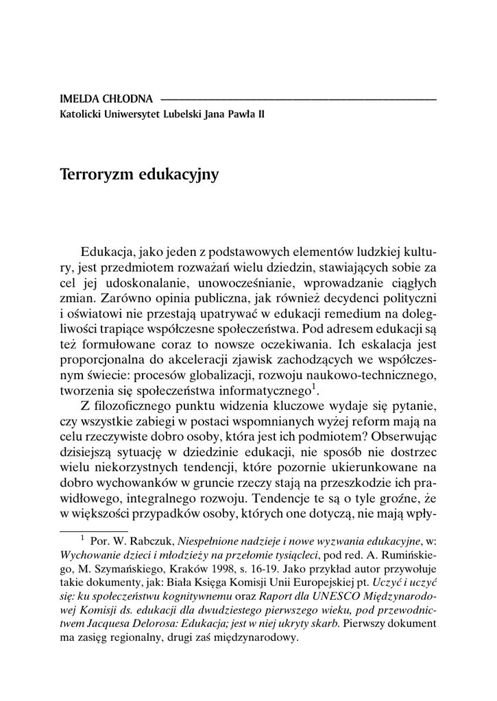 IMELDA CH£ODNA Katolicki Uniwersytet Lubelski Jana Paw³a II Terroryzm edukacyjny Edukacja, jako jeden z podstawowych elementoÂw ludzkiej kultury, jest przedmiotem rozwazÇan wielu dziedzin, stawiajaÎcych sobie za cel jej udoskonalanie, unowoczesÂnianie, wprowadzanie ciaÎgøych zmian. ZaroÂwno opinia publiczna, jak roÂwniezÇ decydenci polityczni i osÂwiatowi nie przestajaÎ upatrywac w edukacji remedium na dolegliwosÂci trapiaÎce wspoÂøczesne spoøeczenÂstwa. Pod adresem edukacji saÎ tezÇ formuøowane coraz to nowsze oczekiwania. Ich eskalacja jest proporcjonalna do akceleracji zjawisk zachodzaÎcych we wspoÂøczesnym sÂwiecie: procesoÂw globalizacji, rozwoju naukowo-technicznego, tworzenia sieÎ spoøeczenÂstwa informatycznego1. Z filozoficznego punktu widzenia kluczowe wydaje sieÎ pytanie, czy wszystkie zabiegi w postaci wspomnianych wyzÇej reform majaÎ na celu rzeczywiste dobro osoby, ktoÂra jest ich podmiotem? ObserwujaÎc dzisiejszaÎ sytuacjeÎ w dziedzinie edukacji, nie sposoÂb nie dostrzec wielu niekorzystnych tendencji, ktoÂre pozornie ukierunkowane na dobro wychowankoÂw w gruncie rzeczy stajaÎ na przeszkodzie ich prawidøowego, integralnego rozwoju. Tendencje te saÎ o tyle grozÂne, zÇe w wieÎkszosÂci przypadkoÂw osoby, ktoÂrych one dotyczaÎ, nie majaÎ wpøy1 Por. W. Rabczuk, Niespeønione nadzieje i nowe wyzwania edukacyjne, w: Wychowanie dzieci i møodziezÇy na przeøomie tysiaÎcleci, pod red. A. RuminÂskiego, M. SzymanÂskiego, KrakoÂw 1998, s. 16-19. Jako przykøad autor przywoøuje takie dokumenty, jak: Biaøa KsieÎga Komisji Unii Europejskiej pt. Uczyc i uczyc sieÎ: ku spoøeczenÂstwu kognitywnemu oraz Raport dla UNESCO MieÎdzynarodowej Komisji ds. edukacji dla dwudziestego pierwszego wieku, pod przewodnictwem Jacquesa Delorosa: Edukacja; jest w niej ukryty skarb. Pierwszy dokument ma zasieÎg regionalny, drugi zas mieÎdzynarodowy. 208 Imelda Ch³odna wu na ich realizacjeÎ albo wprowadza sieÎ je w zÇycie ¹po cichuº, bez zasieÎgnieÎcia opinii osoÂb zainteresowanych. Czy zatem zasadne jest moÂwienie o swego rodzaju terroryzmie edukacyjnym? Pojêcie terroryzmu Zanim odpowiemy na to pytanie, zastanoÂwmy sieÎ, czym jest terroryzm. Søowo to ma wiele znaczenÂ. W literaturze przedmiotu wysteÎpuje okoøo dwustu definicji terroryzmu2. NajczeÎsÂciej okresÂla sieÎ go jako uzÇycie siøy lub przemocy przeciwko osobom lub wøasnosÂci, z pogwaøceniem prawa, majaÎce na celu zastraszenie i wymuszenie na danej grupie ludnosÂci lub panÂstwie usteÎpstw, w drodze do realizacji okresÂlonych celoÂw. Termin ¹terroryzmº wywodzi sieÎ z jeÎzyka greckiego: treo ± ¹drzÇecº, ¹bac sieκ, ¹stchoÂrzycº, ¹uciecº oraz øacinÂskiego: terror, terroris ± ¹strachº, ¹trwogaº, ¹przerazÇenieº lub ¹straszne søowoº, ¹straszna wiesÂcº oraz czasownika terreo ± ¹wywoøac przerazÇenieº, ¹straszycº3. Na tej podstawie mozÇna bardzo ogoÂlnie zdefiniowac terroryzm jako sianie strachu i grozy. IstotaÎ terroryzmu jest to, zÇe przedmiotem dziaøania terrorystycznego saÎ osoby, ktoÂre nie majaÎ bezposÂredniego wpøywu na realizacjeÎ celoÂw, ktoÂre chcaÎ osiaÎgnaÎc organizacje terrorystyczne. Aby wieÎc dziaøania terrorystyczne mogøy 2 Zob. m.in.: Bruce Hoffman, Inside terrorism, London 1998; B. Jenkins, International Terrorism. A New Mode of Conflict, California Seminar on Arms Control and Foreign Policy, January 1975; Research Paper No. 48, Los Angeles, W. Laquer, Terrorism, London 1977; Age of Terrorism, Boston 1987; A. P. Schmid, A. I. Jongman, Political Terrorism, A Naw Guide to Actors, Authors, Concepts, Data Bases, Theories, and Literature, New Bruswick 1998; G. Wardlaw, Political Terrorism. Theory, Tactics, Countermeasures, Cambridge University Press, 1989; P. Wilkinson, Political Terrorism, London 1974; Terrorism and the Liberal State, London 1977; Do wyzÇej wymienionych opracowan odwoøujaÎ sieÎ m.in.: T. Biaøek, Terroryzm. Manipulacja strachem, Warszawa 2005; B. BolechoÂw, Terroryzm w sÂwiecie podwubiegunowym, Torun 2003; J. Tomasiewicz, Terroryzm na tle przemocy politycznej ± zarys encyklopedyczny, Katowice 2000. 3 Zob. hasøo: TERRORYZM, w: Encyklopedia ¹Biaøych Plamº, t. XVII, Radom 2006, s. 145-148. Terroryzm edukacyjny byc skuteczne, muszaÎ charakteryzowac sieÎ znacznym efektem spoøecznym i medialnym. Jednak w przypadku dziedziny jakaÎ jest edukacja, podana wyzÇej charakterystyka terroryzmu jest zbyt waÎska. Nie mozÇemy tu bowiem patrzec na terroryzm jedynie jako na akt terrorystyczny ± czyli akt przemocy, ktoÂry ma posøuzÇyc realizacji dowolnych celoÂw. Akt taki wysteÎpuje bowiem zawsze na bazie jakiejs ideologii. W momencie, kiedy owa ideologia w swoim zaøozÇeniu nawoøuje do stosowania przemocy ± czy beÎdzie to przemoc fizyczna czy inne, mniej wyraziste, jej formy ± staje sieÎ ona istotnym skøadnikiem zjawiska terroryzmu. Sprowadzanie zatem terroryzmu jedynie do aktu terrorystycznego czy aktu przemocy jest niewystarczajaÎce, nie wyczerpuje bowiem w sposoÂb caøkowity tego niejednorodnego i wielopøaszczyznowego zjawiska. BøeÎdne jest wieÎc identyfikowanie terroryzmu z przemocaÎ lub grozÂbaÎ jej uzÇycia. ChociazÇ przemoc jest najbardziej charakterystyczna dla zjawiska terroryzmu, to jednak wazÇniejsza jest tutaj motywacja, bez niej bowiem akt przemocy mozÇna by uznac za przesteÎpstwo o charakterze kryminalnym, akt bandytyzmu, wandalizmu, pospolitego morderstwa. Przemoc jest zawsze wypadkowaÎ, czyli skutkiem jakiejs ideologii czy motywacji: politycznej, religijnej, ekologicznej lub innej. Takie zaweÎzÇone patrzenie na zjawisko terroryzmu, jedynie przez pryzmat jednej (i to nie najwazÇniejszej) jego skøadowej, a mianowicie poprzez akt przemocy, skutkuje m.in. nieskutecznosÂciaÎ dziaøan kontr-terrorystycznych. Przy takim podejsÂciu dziaøania te skupiajaÎ sieÎ na oddziaøywaniu na jednaÎ tylko strefeÎ tego zjawiska, a m