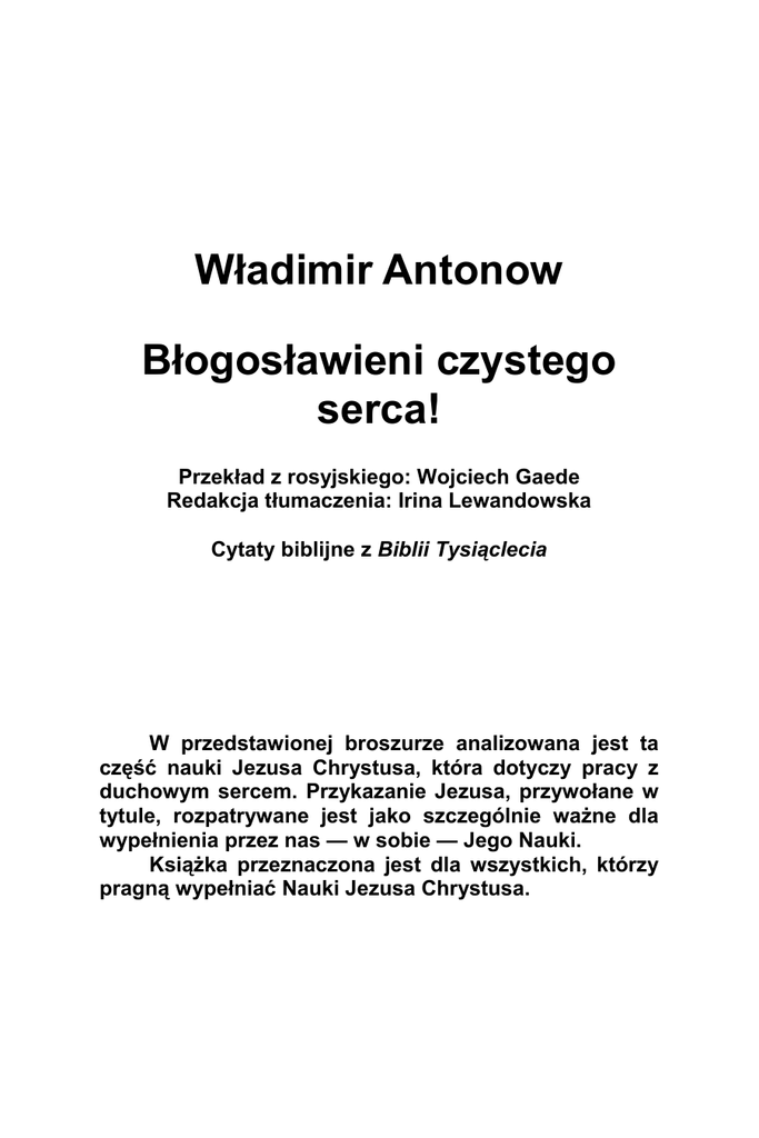 Władimir Antonow Błogosławieni czystego serca! Przekład z rosyjskiego: Wojciech Gaede Redakcja tłumaczenia: Irina Lewandowska Cytaty biblijne z Biblii Tysiąclecia W przedstawionej broszurze analizowana jest ta część nauki Jezusa Chrystusa, która dotyczy pracy z duchowym sercem. Przykazanie Jezusa, przywołane w tytule, rozpatrywane jest jako szczególnie ważne dla wypełnienia przez nas — w sobie — Jego Nauki. Książka przeznaczona jest dla wszystkich, którzy pragną wypełniać Nauki Jezusa Chrystusa. W Kazaniu na górze Jezusa Chrystusa (Mt 5) szczególne miejsce zajmuje kilka Jego wypowiedzi, nazwanych poźniej Błogosławieństwami: Błogosławieni ubodzy (tj. nie posiadający w świecie materialnym, którzy rezygnują z pogoni za dobrami materialnymi) w duchu (tj. z własnego przekonania, z własnej woli), albowiem do nich należy Królestwo niebieskie! Błogosławieni, którzy się smucą (tj. okazujący skruchę z powodu własnych błędów, mających etyczne znaczenie1), albowiem oni będą pocieszeni! Błogosławieni cisi (tj., pozbawieni pychy i ambicjonalności), albowiem oni na własność posiądą ziemię! Błogosławieni, którzy łakną i pragną sprawiedliwości, albowiem oni będą nasyceni! Błogosławieni miłosierni, albowiem oni miłosierdzia dostąpią! Błogosławieni czystego serca, albowiem oni Boga oglądać będą! Błogosławieni, którzy wprowadzają pokój, albowiem oni będą nazwani synami Bożymi! Błogosławieni, którzy cierpią prześladowanie dla sprawiedliwości, albowiem do nich należy Królestwo niebieskie! 1 Tylko nie należy tego robić zbyt długo: gdy już się nauczymy — poprzez mechanizm skruchy — nie grzeszyć, powinniśmy dalej kroczyć Drogą duchową w stanie pozytywnych emocji; inaczej nic dobrego z tego nie wyjdzie. Błogosławieni jesteście, gdy wam urągają i prześladują was, i gdy z Mego powodu mówią kłamliwie wszystko złe na was! Cieszcie się i radujcie, albowiem wasza nagroda wielka jest w Niebie! Zatrzymamy się teraz na jednym z tych błogosławieństw, a konkretnie na głoszącym «Błogosławieni czystego serca, albowiem oni Boga oglądać będą!», ponieważ ma ono specjalnie ważne znaczenie dla realizacji przez nas — w nas samych — nauki Boga. O czym mówił tu Jezus? O tym, że Bóg Ojciec, tak samo jak Duch Święty, o Których głosił Jezus, mogą zostać poznani, w tym także i ujrzani — przez kogo? — przez tych ludzi, którzy będą mieć czyste serca. *** Czym więc jest: czyste serce? I co w ogóle powinniśmy rozumieć pod słowem serce, kiedy mówimy o procesach rozwoju duchowego? Oczywiście, nie mówimy tu o sercu anatomicznym. I fałszywe jest zdanie, że serce — to całokształt wszystkich kierujących nami instynktów i emocji, włączając pociąg seksualny i żądze. Działalność serca duchowego w ogóle nie jest związana, a nawet stawia opór żądzom seksualnym (silnym egocentrycznym, egoistycznym popędom). Możemy wspomnieć jeszcze jeden, niekiedy używany, amorficzny i równie nieadekwatny przypadek wykorzystaniania słowa serce: rozum (tylko jeden z przykładów — Dz 5:3). Przykro, że takie nieadekwatności weszły na stałe do literatury, w tym i do religijnej, i nawet w bogaty w niedostatki synodalny przekład na język rosyjski Nowego Testamentu. 2 *** Aby zrozumieć, czym rzeczywiście jest serce duchowe, należy, choćby bardzo krótko zahaczyć o te2 Na przykład w tłumaczeniu modlitwy-medytacji «Ojcze nasz» nie widać, że «chleb nasz powszedni» w rozumieniu Jezusa to wcale nie pożywienie materialne, a właśnie wyższa wiedza duchowa, prowadzenie duchowe ze strony Ojca Niebieskiego, o które tylko właśnie powinniśmy prosić Boga. I to jest przyczyną dla której wielkie rzesze ludzi, uważających się za chrześcijan, zaczęły zajmować się żebraniem u Boga — zamiast wypełniać Jego Nauki, które polegają na dążeniu do Doskonałości duchowej (Mt 5:48). Tak wiec «ubodzy duchem» — to wcale nie upośledzeni intelektualnie parazyty-żebracy, jak to się zwykle pojmuje się na podstawie tłumaczenia, lecz adepci rozwoju duchowego, odmawiające pogoni za dobrami ziemskimi — dla realizacji swego prawdziwego sensu życia w zgodzie z nauką Boga. Także w danym przekładzie Nowego Testamentu często powtarza się błąd typu «moja (jego, jej) dusza». Przecież w ten sposób utwierdza się przekonanie, że człowiek to ciało, w którym żyje jakaś niepojęta «dusza», która opuszcza człowieka w chwili śmierci. I powstają nawet takie absurdalne pojęcia, że można «stracić duszę», «ukraść duszę». Ale przecież tak naprawdę człowiek jest tą ewoluującą duszą, która tylko chwilowo zasiedla materialne ciała w celu kontynuowania swego rozwoju. Dlatego więc nie można «stracić duszy», wręcz przeciwnie — można «stracić ciało»... Również w przekładzie Listów apostoła Pawła spotykamy frazy, wydawałoby się, pozbawione sensu. W rzeczywistości Paweł opisywał w nich techniki medytacyjne, których uczył go Jezus; po prostu tłumacze nie potrafili tego zrozumieć w wyniku swojej niewystarczającej kompetencji... (Patrz także «Pierwotne Nauki Jezusa Chrystusa» w [7]). mat budowy bioenergetycznej organizmu ludzkiego (szczegółowo o tym w [5]). Mówimy tu, przede wszystkim, o czakrach. Tak oto, wewnątrz naszych klatek piersiowych znajduje się bioenergetyczny organ, nazywany czakrą anahata. Czakra ta odpowiada za zaopatrzenie w bioenergie, rozprowadzane po sieci odpowiednich bioenergetycznych kanałów (meridianów), — płuc, anatomicznego serca i innych organów, mieszczących się w klatce piersiowej. Aczkolwiek anahata, jak każda inna czakra, jest jednocześnie refleksogennym obszarem emocjonalnowolitywnej sfery (szczegółowo — w [5]). Właśnie anahata odpowiada za wytwarzanie całego spektrum emocji miłości, i nawet samo przeniesienie koncentracji świadomości do tej czakry rady