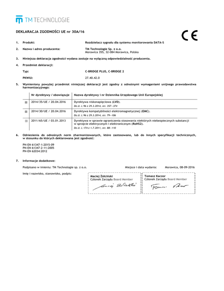 DEKLARACJA ZGODNOŚCI UE nr 30A/16 1. Produkt: Rozdzielacz sygnału dla systemu monitorowania DATA-S 2. Nazwa i adres producenta: TM Technologie Sp. z o.o. Morawica 355, 32-084 Morawica, Polska 3. Niniejsza deklaracja zgodności wydana zostaje na wyłączną odpowiedzialność producenta. 4. Przedmiot deklaracji: 5. Typ: C-BRIDGE PLUS, C-BRIDGE 2 PKWiU: 27.40.42.0 Wymieniony powyżej przedmiot niniejszej deklaracji jest zgodny z odnośnymi wymaganiami unijnego prawodawstwa harmonizacyjnego: ☒ Nr dyrektywy / obowiązuje Nazwa dyrektywy i nr Dziennika Urzędowego Unii Europejskiej 2014/35/UE / 20.04.2016 Dyrektywa niskonapięciowa (LVD). Dz.U. L 96 z 29.3.2014, str. 357—374 ☒ 2014/30/UE / 20.04.2016 ☒ 2011/65/UE / 03.01.2013 Dyrektywa kompatybilności elektromagnetycznej (EMC). Dz.U. L 96 z 29.3.2014, str. 79—106 Dyrektywa w sprawie ograniczenia stosowania niektórych niebezpiecznych substancji w sprzęcie elektrycznym i elektronicznym (RoHS2). Dz.U. L 174 z 1.7.2011, str. 88—110 6. Odniesienia do odnośnych norm zharmonizowanych, które zastosowano, lub do innych specyfikacji technicznych, w stosunku do których deklarowana jest zgodność: PN-EN 61347-1:2015-09 PN-EN 61347-2-11:2005 PN-EN 62034:2012 7. Informacje dodatkowe: Podpisano w imieniu: TM Technologie sp. z o.o. Imię i nazwisko, stanowisko, podpis: Miejsce i data wydania: Maciej Żółciński Członek Zarządu Board Member Morawica, 08-09-2016 Tomasz Kaczor Członek Zarządu Board Member DEKLARACJA ZGODNOŚCI UE nr 31A/16 1. Produkt: Rozdzielacz sygnału dla systemu monitorowania DATA-S 2. Nazwa i adres producenta: TM Technologie Sp. z o.o. Morawica 355, 32-084 Morawica, Polska 3. Niniejsza deklaracja zgodności wydana zostaje na wyłączną odpowiedzialność producenta. 4. Przedmiot deklaracji: 5. Typ: L-REPEATER PKWiU: 27.40.42.0 Wymieniony powyżej przedmiot niniejszej deklaracji jest zgodny z odnośnymi wymaganiami unijnego prawodawstwa harmonizacyjnego: ☒ Nr dyrektywy / obowiązuje Nazwa dyrektywy i nr Dziennika Urzędowego Unii Europejskiej 2014/35/UE / 20.04.2016 Dyrektywa niskonapięciowa (LVD). Dz.U. L 96 z 29.3.2014, str. 357—374 ☒ 2014/30/UE / 20.04.2016 Dyrektywa kompatybilności elektromagnetycznej (EMC). Dz.U. L 96 z 29.3.2014, str. 79—106 ☒ 2011/65/UE / 03.01.2013 Dyrektywa w sprawie ograniczenia stosowania niektórych niebezpiecznych substancji w sprzęcie elektrycznym i elektronicznym (RoHS2). Dz.U. L 174 z 1.7.2011, str. 88—110 6. Odniesienia do odnośnych norm zharmonizowanych, które zastosowano, lub do innych specyfikacji technicznych, w stosunku do których deklarowana jest zgodność: PN-EN 61347-1:2015-09 PN-EN 61347-2-11:2005 PN-EN 62034:2012 7. Informacje dodatkowe: Podpisano w imieniu: TM Technologie sp. z o.o. Imię i nazwisko, stanowisko, podpis: Miejsce i data wydania: Maciej Żółciński Członek Zarządu Board Member Morawica, 08-09-2016 Tomasz Kaczor Członek Zarządu Board Member DEKLARACJA ZGODNOŚCI UE nr 32A/16 1. Produkt: Jednostka sterująca systemu monitorowania DATA-S 2. Nazwa i adres producenta: TM Technologie Sp. z o.o. Morawica 355, 32-084 Morawica, Polska 3. Niniejsza deklaracja zgodności wydana zostaje na wyłączną odpowiedzialność producenta. 4. Przedmiot deklaracji: 5. Typ: C-PANEL DATA-S EASY PKWiU: 27.40.42.0 Wymieniony powyżej przedmiot niniejszej deklaracji jest zgodny z odnośnymi wymaganiami unijnego prawodawstwa harmonizacyjnego: ☒ Nr dyrektywy / obowiązuje Nazwa dyrektywy i nr Dziennika Urzędowego Unii Europejskiej 2014/35/UE / 20.04.2016 Dyrektywa niskonapięciowa (LVD). Dz.U. L 96 z 29.3.2014, str. 357—374 ☒ 2014/30/UE / 20.04.2016 Dyrektywa kompatybilności elektromagnetycznej (EMC). Dz.U. L 96 z 29.3.2014, str. 79—106 ☒ 2011/65/UE / 03.01.2013 Dyrektywa w sprawie ograniczenia stosowania niektórych niebezpiecznych substancji w sprzęcie elektrycznym i elektronicznym (RoHS2). Dz.U. L 174 z 1.7.2011, str. 88—110 6. Odniesienia do odnośnych norm zharmonizowanych, które zastosowano, lub do innych specyfikacji technicznych, w stosunku do których deklarowana jest zgodność: PN-EN 61347-1:2015-09 PN-EN 61347-2-11:2005 PN-EN 62034:2012 7. Informacje dodatkowe: Podpisano w imieniu: TM Technologie sp. z o.o. Imię i nazwisko, stanowisko, podpis: Miejsce i data wydania: Maciej Żółciński Członek Zarządu Board Member Morawica, 08-09-2016 Tomasz Kaczor Członek Zarządu Board Member DEKLARACJA ZGODNOŚCI UE nr 33A/16 1. Produkt: Jednostka sterująca systemu monitorowania DATA-S 2. Nazwa i adres producenta: TM Technologie Sp. z o.o. Morawica 355, 32-084 Morawica, Polska 3. Niniejsza deklaracja zgodności wydana zostaje na wyłączną odpowiedzialność producenta. 4. Przedmiot deklaracji: 5. Typ: C-PANEL PLUS, C-PANEL DATA 2 PKWiU: 27.40.42.0 Wymieniony powyżej przedmiot niniejszej deklaracji jest zgodny z odnośnymi wymaganiami unijnego prawodawstwa harmonizacyjnego: Nr dyrektywy / obowiązuje Nazwa dyrektywy i nr Dziennika Urzędowego Unii Europejskiej ☒ 2014/35/UE / 20.04.2016 Dyrektywa niskonapięciowa (LVD). ☒ 2014/30/UE / 20.04.2016 Dz.U. L 96 z 29.3.2014, str. 357—374 Dyrektywa kompatybilności elektromagnetycznej (EMC). Dz.U. L 96 z 29.3.2014, str. 79—106 ☒ 2011/65/UE / 03.01.2013 Dyrektywa w sprawie ograniczenia stosowania niektórych niebezpiecznych substancji w sprzęcie elektrycznym i elektronicznym (RoHS2). Dz.U. L 174 z 1.7.2011, str. 88—110 6. Odniesienia do odnośnych norm zharmonizowanych, które zastosowano, lub do innych specyfikacji technicznych, w stosunku do których deklarowana jest zgodność: PN-EN 61347-1:2015-09 PN-EN 61347-2-11:2005 PN-EN 62034:2012 7. Informacje dodatkowe: Podpisano w imieniu: TM Technologie sp. z o.o. Imię i nazwisko, stanowisko, podpis: Miejsce i data wydania: Maciej Żółciński Członek Zarządu Board Member Morawica, 08-09-2016 Tomasz Kaczor Członek Zarządu Board Member