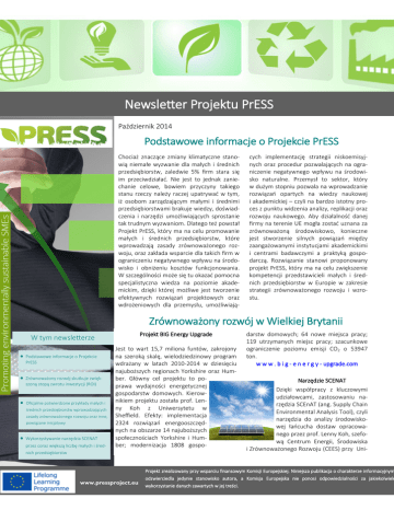 Newsletter Projektu PrESS Październik 2014 Podstawowe informacje o Projekcie PrESS Chociaż znaczące zmiany klimatyczne stanowią niemałe wyzwanie dla małych i średnich przedsiębiorstw, zaledwie 5% firm stara się im przeciwdziałać. Nie jest to jednak zaniechanie celowe, bowiem przyczyny takiego stanu rzeczy należy raczej upatrywać w tym, iż osobom zarządzającym małymi i średnimi przedsiębiorstwami brakuje wiedzy, doświadczenia i narzędzi umożliwiających sprostanie tak trudnym wyzwaniom. Dlatego też powstał Projekt PrESS, który ma na celu promowanie małych i średnich przedsiębiorstw, które wprowadzają zasady zrównoważonego rozwoju, oraz zakłada wsparcie dla takich firm w ograniczeniu negatywnego wpływu na środowisko i obniżeniu kosztów funkcjonowania. W szczególności może się tu okazać pomocna specjalistyczna wiedza na poziomie akademickim, dzięki której możliwe jest tworzenie efektywnych rozwiązań projektowych oraz wdrożeniowych dla przemysłu, umożliwiają- cych implementację strategii niskoemisyjnych oraz procedur pozwalających na ograniczenie negatywnego wpływu na środowisko naturalne. Przemysł to sektor, który w dużym stopniu pozwala na wprowadzanie rozwiązań opartych na wiedzy naukowej i akademickiej – czyli na bardzo istotny proces z punktu widzenia analizy, replikacji oraz rozwoju naukowego. Aby działalność danej firmy na terenie UE mogła zostać uznana za zrównoważoną środowiskowo, konieczne jest stworzenie silnych powiązań między zaangażowanymi instytucjami akademickimi i centrami badawczymi a praktyką gospodarczą. Rozwiązanie stanowi proponowany projekt PrESS, który ma na celu zwiększenie kompetencji przedstawicieli małych i średnich przedsiębiorstw w Europie w zakresie strategii zrównoważonego rozwoju i wzrostu. Zrównoważony rozwój w Wielkiej Brytanii Projekt BIG Energy Upgrade W tym newsletterze Podstawowe informacje o Projekcie PrESS Zrównoważony rozwój skutkuje zwiększoną stopą zwrotu inwestycji (ROI) Oficjalnie potwierdzone przykłady małych i średnich przedsiębiorstw wprowadzających zasady zrównoważonego rozwoju oraz inne, powiązane inicjatywy Wykorzystywanie narzędzia SCENAT przez coraz większą liczbę małych i śred- Jest to wart 15,7 miliona funtów, zakrojony na szeroką skalę, wielodziedzinowy program wdrażany w latach 2010-2014 w dziesięciu najuboższych regionach Yorkshire oraz Humber. Główny cel projektu to poprawa wydajności energetycznej gospodarstw domowych. Kierownikiem projektu została prof. Lenny Koh z Uniwersytetu w Sheffield. Efekty: implementacja 2324 rozwiązań energooszczędnych na obszarze 14 najuboższych społecznościach Yorkshire i Humber; modernizacja 1808 gospo- nich przedsiębiorstw darstw domowych; 64 nowe miejsca pracy; 119 utrzymanych miejsc pracy; szacunkowe ograniczenie poziomu emisji CO2 o 53947 ton. w w w . b i g - e n e r g y - upgrade.com Narzędzie SCENAT Dzięki współpracy z kluczowymi udziałowcami, zastosowaniu narzędzia SCEnAT (ang. Supply Chain Environmental Analysis Tool), czyli narzędzia do analizy środowiskowej łańcucha dostaw opracowanego przez prof. Lenny Koh, szefową Centrum Energii, Środowiska i Zrównoważonego Rozwoju (CEES) przy Uni- Projekt zrealizowany przy wsparciu finansowym Komisji Europejskiej. Niniejsza publikacja o charakterze informacyjnym www.pressproject.eu odzwierciedla jedynie stanowisko autora, a Komisja Europejska nie ponosi odpowiedzialności za jakiekolwiek wykorzystanie danych zawartych w jej treści. Centrum Badań nad Zarządzaniem Łańcuchem Dostaw (LSCM), a także dzięki wsparciu zespołu naukowców pracujących pod jej kierownictwem oraz reprezentantów przemysłu (m.in. Rolls-Royce, Unilever, Tata Steel, Sheffield Forgemasters, Muntons, Brocklesby, DLA Piper, Skanska) i partnerów szczebla akademickiego (m.in. York Stockholm Environmental Institute oraz Hull’s Geography) możliwe było określenie krytycznych punktów łańcucha dostaw, które odpowiadają za najwyższy poziom emisji oraz opracowanie odpowiednich rozwiązań zaradczych, które pozwoliły ograniczyć negatywny wpływ na środowisko naturalne. Narzędzie SCEnAT wykorzystuje unikalny 5-stopniowy cykliczny proces, na który składają się etapy mapowania, modelowania, interweniowania, szacowania i decydowania, a także zaawansowana metodologia oceny i analizy cyklu życia (LCA) oraz nakładów i wyników, co umożliwia zdecydowaną poprawę łańcucha dostaw w różnych sektorach rynku. Narzędzie SCEnAT wykorzystywane jest przez korporacje o globalnych łańcuchach dostaw takie jak Rolls-Royce, Unilever czy Tata Steel, do wyraźnego ograniczenia swojego śladu węglowego oraz zmniejszenia kosztów funkcjonowania (do kwoty 250 tys. funtów na firmę), a także do usprawnienia działalności i wyników biznesowych. www.scenat.com Zrównoważony rozwój w Polsce W Polsce podejmuje się różnorodne działania mające na celu rozwój technologii ekologicznych. Należy tu wspomnieć, iż dla propagacji strategii zrównoważonego rozwoju ogromne znaczenie ma wykorzystywanie funduszy unijnych, które umożliwiają wdrażanie rozwiązań na różnych szczeblach organizacyjnych oraz prowadzenie działalności edukacyjnej, co ma niezwykle istotny wpływ na kształtowanie świadomości ekologicznej przedsiębiorstw. Doskonałym przykładem może tu być zastosowanie wielu metod i narzędzi mających na celu ograniczenie zużycia energii. W Polsce prowadzony jest specjalny Program Finansowania Zrównoważonej Energii – PolSEFF (ang. Polish Sustainable Energy Financing Facility), którego głównym założeniem jest wsparcie małych i średnich przedsiębiorstw. W ramach programu dana firma może otrzymać kredyt inwestycyjny na potrzeby wdrożenia nowoczesnych technologii oraz na zakup sprzętu, dzięki czemu możliwe jest ograniczenie zużycia oraz zwiększenie odzysku energii ze źródeł odnawialnych. Na skalę globaln