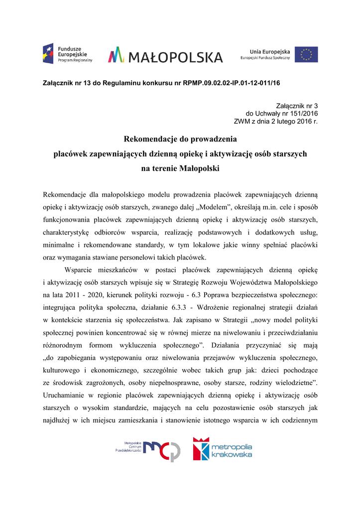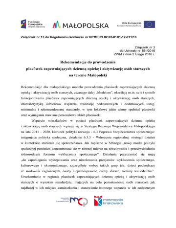 Załącznik nr 13 do Regulaminu konkursu nr RPMP.09.02.02-IP.01-12-011/16 Załącznik nr 3 do Uchwały nr 151/2016 ZWM z dnia 2 lutego 2016 r. Rekomendacje do prowadzenia placówek zapewniających dzienną opiekę i aktywizację osób starszych na terenie Małopolski Rekomendacje dla małopolskiego modelu prowadzenia placówek zapewniających dzienną opiekę i aktywizację osób starszych, zwanego dalej „Modelem”, określają m.in. cele i sposób funkcjonowania placówek zapewniających dzienną opiekę i aktywizację osób starszych, charakterystykę odbiorców wsparcia, realizację podstawowych i dodatkowych usług, minimalne i rekomendowane standardy, w tym lokalowe jakie winny spełniać placówki oraz wymagania stawiane personelowi takich placówek. Wsparcie mieszkańców w postaci placówek zapewniających dzienną opiekę i aktywizację osób starszych wpisuje się w Strategię Rozwoju Województwa Małopolskiego na lata 2011 - 2020, kierunek polityki rozwoju - 6.3 Poprawa bezpieczeństwa społecznego: integrująca polityka społeczna, działanie 6.3.3 - Wdrożenie regionalnej strategii działań w kontekście starzenia się społeczeństwa. Jak zapisano w Strategii „nowy model polityki społecznej powinien koncentrować się w równej mierze na niwelowaniu i przeciwdziałaniu różnorodnym formom wykluczenia społecznego”. Działania przyczyniać się mają „do zapobiegania występowaniu oraz niwelowania przejawów wykluczenia społecznego, kulturowego i ekonomicznego, szczególnie wobec takich grup jak: dzieci pochodzące ze środowisk zagrożonych, osoby niepełnosprawne, osoby starsze, rodziny wielodzietne”. Uruchamianie w regionie placówek zapewniających dzienną opiekę i aktywizację osób starszych o wysokim standardzie, mających na celu pozostawienie osób starszych jak najdłużej w ich miejscu zamieszkania i stanowienie istotnego wsparcia w ich codziennym funkcjonowaniu, a także funkcjonowaniu ich rodzin, jest realizacją powyższych założeń strategicznych. Wypracowany model ma charakter uniwersalny - wskazówki dotyczą placówek zapewniających dzienną opiekę i aktywizację osób starszych, które mogą być prowadzone przez system pomocy społecznej w postaci ośrodków wsparcia, ale też inne podmioty prowadzące działalność społeczną, w tym organizacje pozarządowe, organizacje non-profit, podmioty ekonomii społecznej, kościoły i związki wyznaniowe oraz osoby prawne kościołów i związków wyznaniowych, jednostki samorządu terytorialnego, ich związki i stowarzyszenia, jednostki organizacyjne samorządu terytorialnego posiadające osobowość prawną oraz przedsiębiorców, tj. beneficjentów Poddziałania 9.2.2 i 9.2.3 Regionalnego Programu Operacyjnego Województwa Małopolskiego na lata 2014 - 20201. Tym samym placówki zapewniające dzienną opiekę i aktywizację osób starszych mogą być prowadzone w oparciu o środki własne samorządów lokalnych, budżety organizacji pozarządowych, środki europejskie i wszelkie inne dostępne źródła finansowania tego typu usług. W przypadku finansowania placówek zapewniających dzienną opiekę i aktywizację osób starszych ze środków Europejskiego Funduszu Społecznego należy uwzględnić zasady wynikające z „Wytycznych w zakresie realizacji przedsięwzięć w obszarze włączenia społecznego i zwalczania ubóstwa z wykorzystaniem środków Europejskiego Funduszu Społecznego i Europejskiego Funduszu Regionalnego na lata 2014-2020”2. W szczególności zastosowanie mają zapisy dotyczące usług opiekuńczych dla osób niesamodzielnych jako „usług świadczonych w lokalnej społeczności” (słownik pojęć). 1. Cele placówki Celem działalności placówki zapewniającej dzienną opiekę i aktywizację osób starszych jest oferowanie opieki oraz polepszanie funkcjonowania osób starszych i ich rodzin. Efektem usług realizowanych w placówce jest osiąganie i utrzymywanie przez uczestników optymalnego poziomu samodzielności i aktywności. Placówka zapewniając wsparcie (w placówce i poza nią) ma na celu pozostawanie osób starszych jak najdłużej w ich miejscu zamieszkania i stanowienie istotnego wsparcia w ich codziennym funkcjonowaniu, a także 1 Szczegółowy Opis Osi Priorytetowych Regionalnego Programu Operacyjnego Województwa Małopolskiego na lata 2014-2020 [www.rpo.malopolska.pl] 2 Wytyczne w zakresie realizacji przedsięwzięć w obszarze włączenia społecznego i zwalczania ubóstwa z wykorzystaniem środków Europejskiego Funduszu Społecznego i Europejskiego Funduszu Regionalnego na lata 2014-2020 [www.mir.gov.pl] 2 funkcjonowaniu ich rodzin, poprzez ich odciążenie oraz podnoszenie jakości opieki rodzinnej. Biorąc pod uwagę fakt, iż ciężar opieki spoczywa głównie na rodzinie istotne jest odciążenie jej poprzez objęcie osoby starszej pomocą placówki. Powyższe może także pozwolić pracującym opiekunom rodzinnym na realizację pracy zawodowej, a niepracującym z powodu konieczności opieki nad członkiem rodziny, może pozwolić na uaktywnienie zawodowe. Placówka może specjalizować się w opiece nad osobami starszymi z określonymi grupami chorobowymi i w ramach wybranego profilu być dostosowana do potrzeb osób z konkretnymi schorzeniami, wymagającymi specjalistycznej opieki i terapii, w tym osób po udarach mózgu, cierpiących na chorobę Parkinsona, Alzheimera i zespoły otępienne innego rodzaju. Istotnym wyzwaniem jest stworzenie oferty dla osób cierpiących na choroby otępienne, w tym chorobę Alzheimera. Problem organizacji opieki nad osobami cierpiącymi na choroby otępienne dotyczy przede wszystkim ich dotychczasowych opiekunów, dla których możliwość pobytu podopiecznego w ośrodku byłaby znaczącym wsparciem. Opieka nad osobą cierpiącą na choroby otępienne niejednokrotnie jest bardzo obciążająca psychicznie dla opiekuna, często jest realizowana w formie opieki całodobowej. Oferta placówki pozwoli o