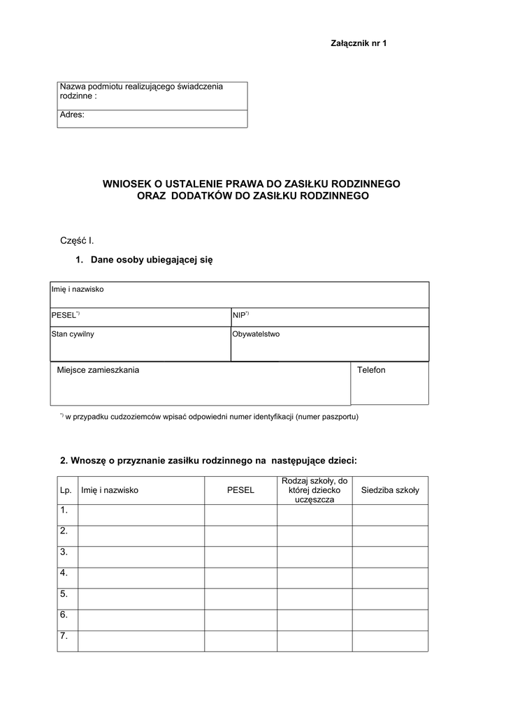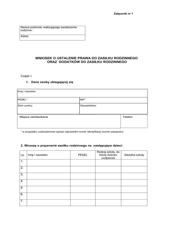 Załącznik nr 1 Nazwa podmiotu realizującego świadczenia rodzinne : Adres: WNIOSEK O USTALENIE PRAWA DO ZASIŁKU RODZINNEGO ORAZ DODATKÓW DO ZASIŁKU RODZINNEGO Część I. 1. Dane osoby ubiegającej się Imię i nazwisko PESEL*) 1.Dane wnioskodawcy Stan cywilny NIP*) Obywatelstwo Miejsce zamieszkania *) Telefon w przypadku cudzoziemców wpisać odpowiedni numer identyfikacji (numer paszportu) 2. Wnoszę o przyznanie zasiłku rodzinnego na następujące dzieci: Lp. 1. 2. 3. 4. 5. 6. 7. Imię i nazwisko PESEL Rodzaj szkoły, do której dziecko uczęszcza Siedziba szkoły oraz dodatków do zasiłku rodzinnego z tytułu: (zakreślić odpowiedni kwadrat i wpisać dane dzieci) urodzenia dziecka ...................................................................................., ............................................................................................ .. (imię i nazwisko dziecka) (imi ę i nazwisko dziecka) opieki nad dzieckiem w okresie korzystania z urlopu wychowawczego (należy wypełnić część II) ....................................................................................., ........................................................................................... .. (imię i nazwisko dziecka) (imi ę i nazwisko dziecka) samotnego wychowywania dziecka i utraty prawa do zasiłku dla bezrobotnych na skutek upływu ustawowego okresu jego pobierania; (należy wypełnić część III) na: ....................................................................................., ........................................................................................... .. (imię i nazwisko dziecka) (imi ę i nazwisko dziecka) samotnego wychowywania dziecka; (należy wypełnić część IV) na: ....................................................................................., ........................................................................................... .. (imię i nazwisko dziecka) (imi ę i nazwisko dziecka) wychowywania dziecka w rodzinie wielodzietnej; na: ...................................................................................., ............................................................................................ .. (imię i nazwisko dziecka) (imi ę i nazwisko dziecka) ...................................................................................., ............................................................................................ .. (imię i nazwisko dziecka) (imi ę i nazwisko dziecka) kształcenia i rehabilitacji dziecka niepełnosprawnego ...................................................................................., ............................................................................................ .. (imię i nazwisko dziecka) (imi ę i nazwisko dziecka) rozpoczęcia roku szkolnego przez: ...................................................................................., ............................................................................................ .. (imię i nazwisko dziecka) (imi ę i nazwisko dziecka) ...................................................................................., ............................................................................................ .. (imię i nazwisko dziecka) (imi ę i nazwisko dziecka) podjęcia przez dziecko nauki w szkole poza miejscem zamieszkania ( na częściowe pokrycie wydatków związanych z zamieszkaniem w miejscowości, w której znajduje się siedziba szkoły ) ...................................................................................., ............................................................................................ .. (imię i nazwisko dziecka) (imi ę i nazwisko dziecka) podjęcia przez dziecko nauki w szkole poza miejscem zamieszkania ( na pokrycie wydatków związanych z zapewnieniem dziecku możliwości dojazdu z miejsca zamieszkania do miejscowości, w której znajduje się siedziba szkoły ) ...................................................................................., ............................................................................................ .. (imię i nazwisko dziecka) (imi ę i nazwisko dziecka) 3. Dane członków rodziny ( w tym dzieci do ukończenia 25 lat, a także dziecka, które ukończyło 25 rok życia legitymującego się orzeczeniem o znacznym stopniu niepełnosprawności, jeżeli w związku z tą niepełnosprawnością rodzinie przysługuje świadczenie pielęgnacyjne). Do składu rodziny nie wlicza się dziecka pozostającego pod opieką opiekuna prawnego. W skład rodziny wchodzą: *) 1 ............................................................................................................... ( imię i nazwisko stopień pokrewieństwa PESEL* ) 2 ............................................................................................................... ( imię i nazwisko stopień pokrewieństwa PESEL* ) 3 ............................................................................................................... ( imię i nazwisko stopień pokrewieństwa PESEL* ) 4 ............................................................................................................... ( imię i nazwisko stopień pokrewieństwa PESEL* ) 5 ............................................................................................................... ( imię i nazwisko stopień pokrewieństwa PESEL* ) w przypadku cudzoziemców wpisać odpowiedni numer identyfikacji (numer paszportu) 4. Inne dane 4.1 Łączna kwota alimentów świadczonych na rzecz innych osób wyniosła w roku ................. *) ....................... zł ...... gr. 4.2 Łączna kwota opłat poniesionych z tytułu przebywania członka rodziny w instytucji zapewniającej całodobowe utrzymanie w roku .................*) wyniosła …….......... zł ...... gr. 4.3 Dochód utracony z roku .................*) wyniósł ................. zł …... gr miesięcznie. 4.4 Dochód uz