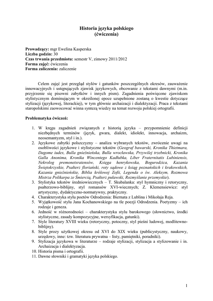 Mgr E Kasperska Historia języka polskiego V sem ĆW