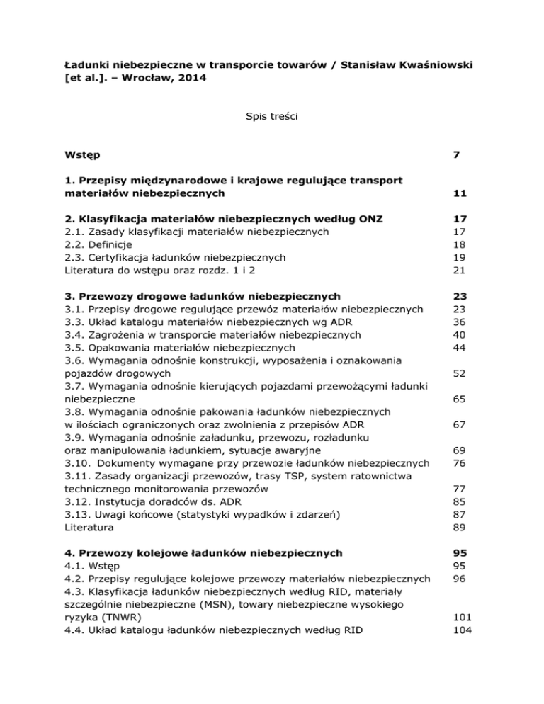 Ładunki niebezpieczne w transporcie towarów / Stanisław Kwaśniowski [et al.]. – Wrocław, 2014 Spis treści Wstęp 7 1. Przepisy międzynarodowe i krajowe regulujące transport materiałów niebezpiecznych 11 2. Klasyfikacja materiałów niebezpiecznych według ONZ 2.1. Zasady klasyfikacji materiałów niebezpiecznych 2.2. Definicje 2.3. Certyfikacja ładunków niebezpiecznych Literatura do wstępu oraz rozdz. 1 i 2 17 17 18 19 21 3. Przewozy drogowe ładunków niebezpiecznych 3.1. Przepisy drogowe regulujące przewóz materiałów niebezpiecznych 3.3. Układ katalogu materiałów niebezpiecznych wg ADR 3.4. ZagroŜenia w transporcie materiałów niebezpiecznych 3.5. Opakowania materiałów niebezpiecznych 3.6. Wymagania odnośnie konstrukcji, wyposaŜenia i oznakowania pojazdów drogowych 3.7. Wymagania odnośnie kierujących pojazdami przewoŜącymi ładunki niebezpieczne 3.8. Wymagania odnośnie pakowania ładunków niebezpiecznych w ilościach ograniczonych oraz zwolnienia z przepisów ADR 3.9. Wymagania odnośnie załadunku, przewozu, rozładunku oraz manipulowania ładunkiem, sytuacje awaryjne 3.10. Dokumenty wymagane przy przewozie ładunków niebezpiecznych 3.11. Zasady organizacji przewozów, trasy TSP, system ratownictwa technicznego monitorowania przewozów 3.12. Instytucja doradców ds. ADR 3.13. Uwagi końcowe (statystyki wypadków i zdarzeń) Literatura 23 23 36 40 44 4. Przewozy kolejowe ładunków niebezpiecznych 4.1. Wstęp 4.2. Przepisy regulujące kolejowe przewozy materiałów niebezpiecznych 4.3. Klasyfikacja ładunków niebezpiecznych według RID, materiały szczególnie niebezpieczne (MSN), towary niebezpieczne wysokiego ryzyka (TNWR) 4.4. Układ katalogu ładunków niebezpiecznych według RID 95 95 96 52 65 67 69 76 77 85 87 89 101 104 4.5. Warunki dotyczące opakowań wewnętrznych ładunków niebezpiecznych 4.6. Wymagania odnośnie konstrukcji, wyposaŜenia i oznaczania taboru szynowego 4.7. Postępowanie przy przyjęciu do przewozu towarów niebezpiecznych 4.8. Postępowanie przy przewozie towarów niebezpiecznych 4.9. Postępowanie przy przekazaniu ładunków odbiorcy 4.10. Przepisy szczegółowe dotyczące przygotowania ładunków do transportu, pakowania, manipulowania i przewozu 4.11. Szkolenia osób zajmujących się organizacją przewozu ładunków niebezpiecznych 4.12. Instytucja doradców d.s. RID 4.13. Uwagi końcowe (statystyki wypadków i zdarzeń) Literatura 108 113 129 134 146 146 148 149 150 163 5. Transport materiałów niebezpiecznych w Ŝegludze śródlądowej 5.1. Ładunki niebezpieczne w transporcie śródlądowym 5.2. Przepisy regulujące przewozy towarów niebezpiecznych statkami Ŝeglugi śródlądowej 5.4. Instytucja doradcy ds. ADN 5.5. Zakończenie Literatura 165 165 6. Transport lotniczy ładunków niebezpiecznych 6.1. Przepisy regulujące przewóz materiałów niebezpiecznych w transporcie lotniczym 6.2. Zawartość przepisów „Dangerous Goods Regulation" 6.3. Układ katalogu materiałów niebezpiecznych wg. DGR 6.4. Zasady transportu materiałów niebezpiecznych 6.5. Kompatybilność materiałów niebezpiecznych 6.6. Grupy pakowania materiałów niebezpiecznych 6.7. Opakowania przeznaczone do transportu materiałów niebezpiecznych 6.8. Oznaczenia opakowań z materiałem niebezpiecznym 6.9. Dokumentacja transportowa 6.10. Lotnicze jednostki ładunkowe w transporcie materiałów niebezpiecznych 6.11. Obsługa, załadunek i magazynowanie materiałów niebezpiecznych 6.12. Przykłady przesyłek lotniczych zawierających materiały niebezpieczne 6.13. Uwagi końcowe Literatura 203 7. Transport ładunków niebezpiecznych drogą morską 7.1. System ustawodawstwa w zakresie transportu morskiego, rola IMO 7.2. Charakterystyka ładunków morskich oraz technologia ich przewozu 255 256 259 166 190 192 192 203 205 207 210 215 217 221 224 231 239 246 249 253 254 7.3. NajwaŜniejsze akty prawne regulujące transport ładunków niebezpiecznych drogą morską (SOLAS, MARPOL, inne konwencje i kodeksy, ustawy polskie oraz rozporządzenia odpowiednich ministrów) 7.4. Klasyfikacja ładunków niebezpiecznych wg Kodeksu MDG 7.5. Zasady przewozu ładunków stałych - Kodeks IMSBC 7.6. Zasady przewozu ładunków ciekłych - kodeksy IBC i BCH 7.7. Zasady przewozu ładunków gazowych - Kodeks IGC 7.8. Zasady przewozu ładunków w sztukach - CTU 7.9. Zasady przewozu statkami napromieniowanego paliwa jądrowego, plutonu i wysokopromieniotwórczych odpadów w pojemnikach Kodeks INF 7.10. Zasady przewozu kontenerów-Konwencja CSS 7.11. Zasady szkolenia załóg oraz personelu nadzorującego załadunki, przewóz i wyładunki wg HAZMAT 7.12. Aspekty bezpieczeństwa przewozu ładunków niebezpiecznych w świetle innych -konwencji - LL, COLREG, MOP, SAR, STCW 273 277 302 308 312 313 314 314 320 320 Bibliografia 324 Załącznik 1. Międzynarodowe konwencje, protokoły i porozumienia IMO 328 Załącznik 2. Lista dokumentów podlegających kontroli przez PSC (Kontrola Państwa Portu) 333 oprac. BPK