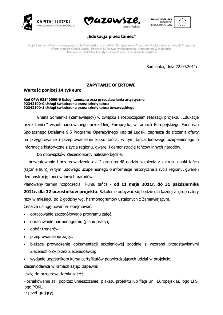 „Edukacja przez taniec” Projekt jest współfinansowany przez Unię Europejską ze środków Europejskiego Funduszu Społecznego w ramach Programu Operacyjnego Kapitał Ludzki, Priorytet IX Rozwój wykształcenia i kompetencji w regionach Działanie 9.5 Oddolne Inicjatywy edukacyjne na obszarach wiejskich Somianka, dnia 22.04.2011r. Wartość poniżej 14 tyś euro ZAPYTANIE OFERTOWE Kod CPV: 92340000-6 Usługi taneczne oraz przedstawienia artystyczne 92342100-0 Usługi świadczone przez szkoły tańca 92342100-1 Usługi świadczone przez szkoły tańca towarzyskiego Gmina Somianka (Zamawiający) w związku z rozpoczęciem realizacji projektu „Edukacja przez taniec” współfinansowanego przez Unię Europejską w ramach Europejskiego Funduszu Społecznego Działanie 9.5 Programu Operacyjnego Kapitał Ludzki, zaprasza do złożenia oferty na przygotowanie i przeprowadzenie kursu tańca, w tym tańca ludowego uzupełnionego o informacje historyczne z życia regionu, gwarę i demonstrację tańców innych narodów. Do obowiązków Zleceniobiorcy należało będzie: - przygotowanie i przeprowadzenie dla 2 grup po 48 godzin szkolenia z zakresu nauki tańca (łącznie 96h), w tym ludowego uzupełnionego o informacje historyczne z życia regionu, gwarę i demonstrację tańców innych narodów. Planowany termin rozpoczęcia kursu tańca - od 11 maja 2011r. do 31 października 2011r. dla 32 uczestników projektu. Szkolenie odbywać się będzie dla każdej z grup cztery razy w miesiącu po 2 godziny wg. harmonogramów ustalonych z Zamawiającym. Cena za usługę powinna obejmować: opracowanie szczegółowego programu zajęć; opracowanie harmonogramu (planu pracy); dobór trenerów; przeprowadzenie zajęć; bieżące prowadzenie dokumentacji szkoleniowej zgodnie z wzorami przedstawionymi Zleceniobiorcy przez Zleceniodawcę; wydanie uczestnikom kursu certyfikatów potwierdzających udział w projekcie. Zleceniodawca w ramach zajęć zapewni: - salę do przeprowadzenia zajęć; - oznakowanie sali poprzez umieszczenie: plakatu projektu lub flagi Unii Europejskiej, logo EFS, logo POKL; - sprzęt grający; „Edukacja przez taniec” Projekt jest współfinansowany przez Unię Europejską ze środków Europejskiego Funduszu Społecznego w ramach Programu Operacyjnego Kapitał Ludzki, Priorytet IX Rozwój wykształcenia i kompetencji w regionach Działanie 9.5 Oddolne Inicjatywy edukacyjne na obszarach wiejskich - poczęstunek dla uczestników szkolenia; - ubezpieczenie uczestników. Ponadto informujemy, iż podstawą wynagrodzenia będzie stawka za godzinę kursu. Istotne warunki zamówienia: 1. Przedstawiona cena powinna zawierać cenę netto plus podatek VAT za przeprowadzenie jednej godziny zajęć. 2. Kryteria oceny ofert: cena brutto. 3. Cena określona w ofercie powinna obejmować wszystkie koszty związane z realizacją przedmiotu zamówienia. 4. Każdy wykonawca może złożyć tylko jedną ofertę, w której może być zaproponowana tylko jedna cena. 5. Oferta musi być podpisana przez osobę upoważnioną do reprezentowania Wykonawcy. 6. Rozliczenie transakcji następować będzie przelewem na konto wskazane na fakturze w ciągu 30 dni od dnia otrzymania prawidłowo wystawionej faktury przez Wykonawcę. 7. Przed upływem terminu składania ofert, w szczególnie uzasadnionych przypadkach Zamawiający może zmodyfikować treść zapytania ofertowego. Dokonana modyfikacja zostanie niezwłocznie przekazana wszystkim wykonawcom, którzy otrzymali zapytanie ofertowe. 8. Zamawiający może zamknąć postępowanie bez wybrania żadnej oferty, w przypadku, gdy żadna ze złożonych ofert nie odpowiada warunkom określonym przez Zamawiającego. 9. Ofertę z postaci załącznika nr 1 do niniejszego zapytania ofertowego (Formularz cenowy) należy złożyć do dnia 06 maja 2011 r. do godz. 16.00 w sekretariacie Urzędu Gminy w Somiance w godzinach 8.00 -16.00 lub w Biurze Projektu w godzinach 16.00 – 18.00 lub przesłać na adres mailowy [email protected] lub [email protected]. 10. Osobami uprawnionymi do kontaktu z oferentami jest: Izabela Gargała i Marzena Kuchta tel. 029 74 187 90 wew. 49. 11. Do oferty należy dołączyć CV z opisem doświadczenia w prowadzeniu podobnych zajęć. Wójt Gminy Somianka Andrzej Żołyński