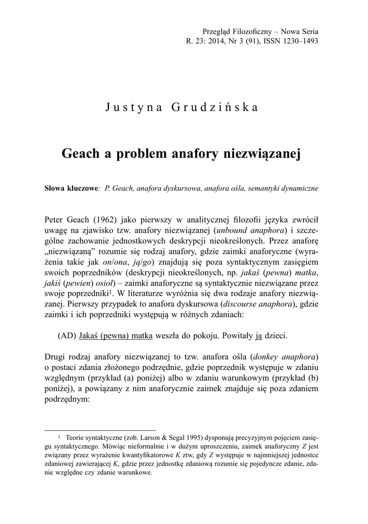 Artykuł omawia problem tzw. anafory niezwiązanej (unbound anaphora), koncepcję Petera Geacha, jej słabe strony i konkurencyjne propozycje rozwiązań.
