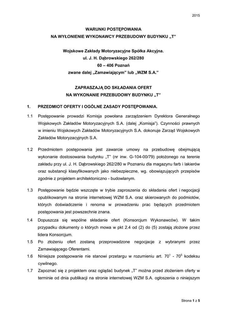 2015 WARUNKI POSTĘPOWANIA NA WYŁONIENIE WYKONAWCY PRZEBUDOWY BUDYNKU „T” Wojskowe Zakłady Motoryzacyjne Spółka Akcyjna. ul. J. H. Dąbrowskiego 262/280 60 – 406 Poznań zwane dalej „Zamawiającym” lub „WZM S.A.” ZAPRASZAJĄ DO SKŁADANIA OFERT NA WYKONANIE PRZEBUDOWY BUDYNKU „T” 1. PRZEDMIOT OFERTY I OGÓLNE ZASADY POSTĘPOWANIA. 1.1 Postępowanie prowadzi Komisja powołana zarządzeniem Dyrektora Generalnego Wojskowych Zakładów Motoryzacyjnych S.A. (dalej „Komisja”). Czynności prawnych w imieniu Wojskowych Zakładów Motoryzacyjnych S.A. dokonuje Zarząd Wojskowych Zakładów Motoryzacyjnych S.A. 1.2 Przedmiotem postępowania jest zawarcie umowy na przebudowę obejmującą wykonanie dostosowania budynku „T” (nr inw. G-104-00/79) położonego na terenie zakładu przy ul. J. H. Dąbrowskiego 262/280 w Poznaniu dla magazynu farb i lakierów oraz substancji klasyfikowanych jako niebezpieczne, wg. obowiązujących przepisów zgodnie z projektem architektoniczno - budowlanym. 1.3 Postępowanie będzie wszczęte w trybie zaproszenia do składania ofert i negocjacji opublikowanym na stronie internetowej WZM S.A. oraz skierowanych do podmiotów, których doświadczenie i renoma w prowadzeniu prac będących przedmiotem postępowania jest powszechnie znana. 1.4 Dopuszcza się wspólne składanie ofert (Konsorcjum Wykonawców). W takim przypadku dokumenty o których mowa w pkt 2.4 od (2) do (5) zostają złożone przez lidera Konsorcjum. 1.5 Po złożeniu ofert zostaną przeprowadzone negocjacje z wybranymi przez Zamawiającego Oferentami. 1.6 Niniejsze postępowanie nie stanowi przetargu w rozumieniu art. 701 - 705 kodeksu cywilnego. 1.7 Zapoznać się z projektem oraz oglądać budynek „T” można przed złożeniem oferty w terminie od dnia publikacji na stronie internetowej WZM S.A. ogłoszenia o niniejszym Strona 1 z 5 2015 postępowaniu do dnia 27 marca 2015 roku. Wejście na teren Zakładu należy uzgodnić z osobami wskazanymi w pkt 1.8. 1.8 Dodatkowych informacji udziela: mgr Bartosz Sobański – Kierownik Działu Utrzymania Ruchu – tel. 697-649-978 2. OPIS SPOSOBU PRZYGOTOWANIA OFERTY. 2.1. Ofertę należy umieścić w zamkniętej kopercie. Koperta powinna zostać oznaczona tytułem „OFERTA NA WYKONANIE PRZEBUDOWY BUDYNKU T” oraz opatrzona pieczęcią firmową Oferenta. 2.2. W ofercie powinna być wskazana oferowana cena (netto i brutto). 2.3. Oferta jest ważna po złożeniu pod nią podpisów przez osoby uprawnione do reprezentowania firmy Oferenta. 2.4. Do oferty należy dołączyć: (1) Odpis z właściwego rejestru. (2) Odpis z polisy odpowiedzialności cywilnej na sumę nie niższą niż 200.000,00 PLN. (3) Wynik finansowy (bilans, rachunek zysków i strat) za rok 2012 i 2013 w przypadku oferentów prowadzących pełną księgowość, a w przypadku osób fizycznych prowadzących działalność gospodarczą – deklaracja PIT z prowadzonej działalności w 2012 r. i 2013 r. (4) Referencje z realizacji poprzednich zamówień z zakresu prac budowlanych z ostatnich 3 lat, (5) Umowę konsorcjum - w przypadku złożenia oferty przez Konsorcjum Wykonawców 2.5. Dokumenty do oferty powinny zostać dołączone w oryginale lub w formie odpisu poświadczonego za zgodność z oryginałem przez Oferenta. 2.6. Oferta powinna zawierać termin wykonania prac. 2.7. Oferta powinna zawierać także długość (podaną w miesiącach) gwarancji na wykonane prace. Warunki gwarancji nie mogą pogarszać sytuacji Zamawiającego w stosunku do uprawnień określonych w kodeksie cywilnym. Długość gwarancji nie może być krótsza niż wskazana w projekcie umowy. 2.8. Ponadto oferta powinna zawierać oznaczenie terminu związania oferty – nie mniej niż 6 miesięcy od daty złożenia oferty. Strona 2 z 5 2015 2.9. Jeżeli Oferent zatrudnia lub zamierza wykonać prace przy udziale cudzoziemców, powinien zawrzeć o tym informację w ofercie. 3. TERMIN I MIEJSCE SKŁADANIA OFERT. 3.1. Ofertę należy złożyć w terminie do dnia 31 marca 2015 roku godzina 12:00 w siedzibie Zamawiającego przy ul. J.H. Dąbrowskiego 262/280, 60-406 Poznań w kancelarii (pokój 009 – parter). 3.2. Ofertę można złożyć we wskazanym miejscu, w godzinach 7:00–14:00 od poniedziałku do piątku. 3.3. Oferty złożone po wskazanym terminie nie będą uczestniczyć w postępowaniu. 4. OTWARCIE OFERT. 4.1. Komisyjne otwarcie ofert nastąpi w dniu 31 marca 2015 roku w siedzibie Zamawiającego w pokoju o godzinie 12:15 122. Oferenci mogą być obecni podczas otwarcia ofert. 4.2. Po otwarciu ofert Komisja ogłosi obecnym Oferentom nazwy Oferentów i zaproponowaną cenę brutto. 4.3. Zamawiający może żądać od Oferenta uzupełnienia lub wyjaśnienia treści oferty w terminie 7 dni. Uzupełnienie nie może dotyczyć łącznej wysokości ceny. 5. NEGOCJACJE. 5.1. Po otwarciu ofert Komisja może zaprosić pisemnie na negocjacje Oferentów w liczbie 1 do 3, których oferty będą najkorzystniejsze pod względem ceny, terminu realizacji i kompleksowości. 5.2. W czasie negocjacji Komisja ani przedstawiciele WZM S.A. nie będzie ujawniać szczegółów negocjacji prowadzonych z innymi oferentami. 5.3. Negocjacje zostaną zakończone prośbą Komisji o złożenie w określonym terminie ostatecznej oferty. Ostateczną ofertę mogą składać wyłącznie Oferenci, którzy brali udział w negocjacjach. Komisja może zwrócić się do Oferentów biorących udział w negocjacjach o złożenie oferty na roboty dodatkowe, których konieczność wykonania ujawni się w trakcie prowadzenia negocjacji. Warunki umowy stanowiącej załącznik nr 3 mogą ulec zmianie w toku przeprowadzonych negocjacji. 5.4. Ostateczna oferta cenowa powinna zawierać wyłącznie cenę netto i brutto z rozbiciem na zakresy prac i termin realizacji. Strona 3 z 5 2015 6. OPIS KRYTERIÓW I SPOSÓB DOKONANIA ICH OCENY. 6.1. Komisja wybiera najkorzystniejszą ofertę ostateczną spośród złożonych ofert biorąc pod uwagę 