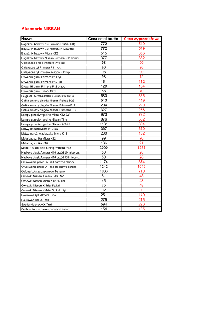 Akcesoria NISSAN Nazwa Bagażnik bazowy alu.Primera P12 (S,HB) Bagażnik bazowy alu.Primera P12 kombi Bagażnik bazowy Micra K12 Bagażnik bazowy Nissan Primera P11 kombi Chlapacze przód Primera P11 kpl. Chlapacze tył Primera P11 kpl. Chlapacze tył Primera Wagon P11 kpl. Dywaniki gum. Primera P11 tył Dywaniki gum. Primera P12 kpl. Dywaniki gum. Primera P12 przód Dywaniki gum. Tino V10 tył Felga alu 5.5x14 4x100 Sciron K12 0203 Gałka zmiany biegów Nissan Pickup D22 Gałka zmiany biegów Nissan Primera P12 Gałka zmiany biegów Nissan Primera P13 Lampy przeciwmgielne Micra K12 03" Lampy przeciwmgielne Nissan Tino Lampy przeciwmgielne Nissan X-Trial Listwy boczne Micra K12 5D Listwy narożne zderzaka Micra K12 Mata bagażnika Micra K12 Mata bagażnika V10 Moduł 1.9 Dci chip tuning Primera P12 Nadkole plast. Almera N16 przód LH nieoryg. Nadkole plast. Almera N16 przód RH nieoryg. Orurowanie przód X-Trail narożne chrom Orurowanie przód X-Trail środkowe chrom Osłona koła zapasowego Terrano Owiewki Nissan Almera 3drz. N-16 Owiewki Nissan Micra K12 3D kpl Owiewki Nissan X-Trial 5d.kpl Owiewki Nissan X-Trial 5d.kpl. +tył Pokrowce kpl. Almera Tino Pokrowce kpl. X-Trail Spoiler dachowy X-Trail Zestaw do win,drewn.pudełko Nissan Cena detal brutto 772 772 515 377 98 98 98 98 161 129 88 680 543 284 327 973 876 1131 367 230 99 136 2000 50 50 1174 1242 1033 81 45 75 92 251 275 594 154 Cena wyprzedażowa 549 549 366 332 90 90 90 72 112 104 70 366 449 229 288 732 582 824 320 182 70 91 1287 28 28 874 1049 710 48 48 48 60 149 215 220 135