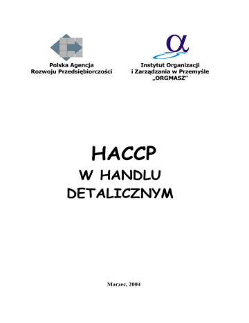 Polska Agencja Rozwoju Przedsiębiorczości Instytut Organizacji i Zarządzania w Przemyśle „ORGMASZ” HACCP W HANDLU DETALICZNYM Marzec, 2004 Autorzy pierwszego wydania: Jerzy Chrząszcz, Joanna Drapińska, Bogdan Malinowski, Sławomir Muńko, Artur Wójcik, Aneta Wysokińska Wydanie drugie (zweryfikowane – marzec 2004) Autorzy: Olgierd Głodkowski Bogdan Malinowski Artur Wójcik © Copyright by Polska Agencja Rozwoju Przedsiębiorczości, 2004 Organizacja cyklu seminariów informacyjnych oraz przygotowanie publikacji zostało sfinansowane przez Polską Agencję Rozwoju Przedsiębiorczości. 2 SPIS TREŚCI WPROWADZENIE.......................................................................................................................................................... 4 1. SYSTEM HACCP – ISTOTA I CECHY SYSTEMU................................................................................................ 6 1.1 Definicja systemu HACCP ................................................................................................................................... 6 1.2 Idea systemu HACCP ........................................................................................................................................... 6 1.3 Zagrożenia zdrowotne w produkcji dystrybucji żywności ................................................................................ 6 1.4 Terminologia systemu HACCP............................................................................................................................ 8 1.5 Geneza systemu HACCP ...................................................................................................................................... 9 1.6 Zasady systemu HACCP (wg codex alimentarius commission) ...................................................................... 10 2. PODSTAWY PRAWNE REGULACJI SYSTEMU HACCP W POLSCE I W UNII EUROPEJSKIEJ........... 11 2.1 Ustawodawstwo żywnościowe w Polsce............................................................................................................. 11 2.2 Ustawodawstwo żywnościowe w krajach Unii Europejskiej ........................................................................... 14 2.3 Europejskie standardy dla branży spożywczej................................................................................................. 15 2.4 Aktualne prace nad ustawodawstwem żywnościowym w krajach UE ........................................................... 16 3. SYSTEM HACCP A SYSTEMY ZARZĄDZANIA JAKOŚCIĄ........................................................................... 20 3.1 Norma ISO 9000 – definicja jakości .................................................................................................................. 20 3.2 Styl życia a oczekiwania klienta......................................................................................................................... 22 3.3 Relacja: konsument a odbiorca.......................................................................................................................... 23 3.4 Oczekiwania klientów względem sklepów detalicznych .................................................................................. 23 3.5 Model drogi „ku jakości” ................................................................................................................................... 25 4. SYSTEM HACCP W FIRMACH HANDLOWYCH .............................................................................................. 28 4.1 Założenia wstępne do wdrożenia systemu HACCP w handlu......................................................................... 28 4.2 Dobra praktyka produkcyjna GMP.................................................................................................................. 29 4.3 Dobra praktyka higieniczna GHP ..................................................................................................................... 31 4.4 Podział kompetencji przy nadzorze nad bezpieczeństwem żywności ............................................................. 33 4.5 Etapy wdrażania systemu HACCP.................................................................................................................... 33 Etap 1. Powołanie Zespołu HACCP ................................................................................................................. 34 Etap 2. Opis produktu ....................................................................................................................................... 34 Etap 3. Przeznaczenie produktu ....................................................................................................................... 34 Etap 4. Sporządzenie diagramu przepływu, schemat procesu ....................................................................... 34 Etap 5. Weryfikacja schematu, sprawdzenie ze stanem faktycznym ............................................................ 34 Etap 6. Analiza zagrożeń................................................................................................................................... 34 Etap 7. Określenie Krytycznych Punktów Kontroli (CCP) ........................................................................... 34 Etap 8. Ustalenie limitów krytycznych............................................................................................................. 34 Etap 9. Ustalenie monitorowania CCP............................................................................................................. 34 Etap 10. Ustalenie działań korekcyjnych (korygujących) .............................................................................. 34 Etap 11. Opracowanie procedury weryfikacji systemu .................................................................................. 34 Etap 12. Utworzenie dokumentacji .............................................................