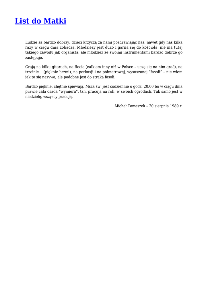 List do Matki Ludzie są bardzo dobrzy, dzieci krzyczą za nami pozdrawiając nas, nawet gdy nas kilka razy w ciągu dnia zobaczą. Młodzieży jest dużo i garną się do kościoła, nie ma tutaj takiego zawodu jak organista, ale młodzież ze swoimi instrumentami bardzo dobrze go zastępuje. Grają na kilku gitarach, na flecie (całkiem inny niż w Polsce – uczę się na nim grać), na trzcinie… (pięknie brzmi), na perkusji i na półmetrowej, wysuszonej “fasoli” – nie wiem jak to się nazywa, ale podobne jest do strąka fasoli. Bardzo pięknie, chętnie śpiewają. Msza św. jest codziennie o godz. 20.00 bo w ciągu dnia prawie cała osada “wymiera”, tzn. pracują na roli, w swoich ogrodach. Tak samo jest w niedzielę, wszyscy pracują. Michał Tomaszek – 20 sierpnia 1989 r.