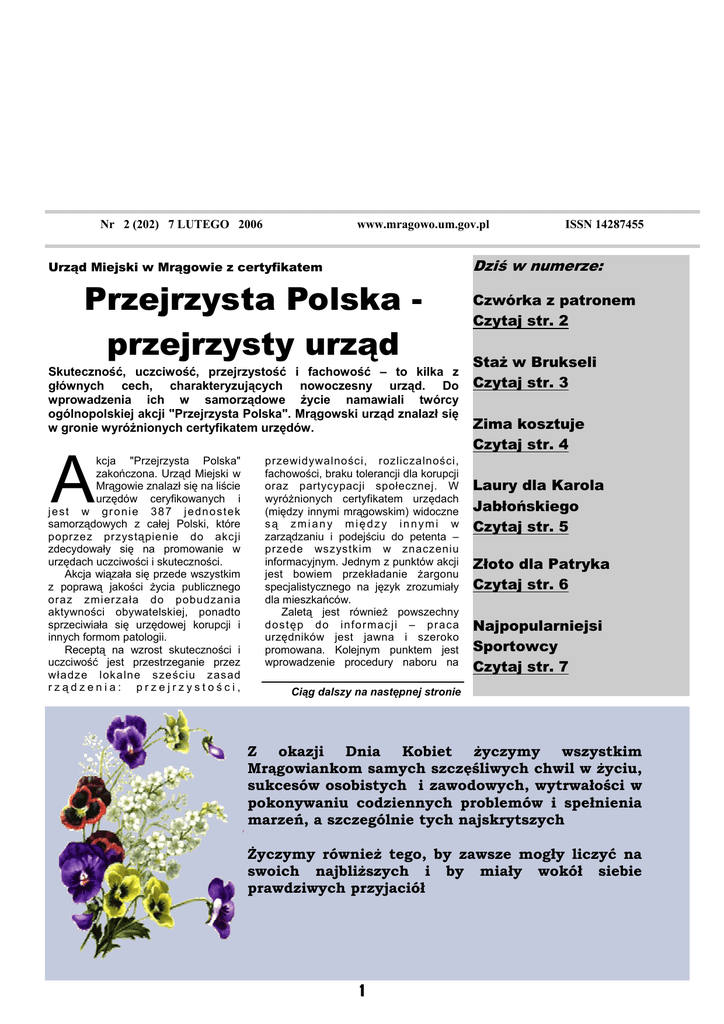 Magazyn Mrągowski Nr 2 (202) 7 LUTEGO 2006 www.mragowo.um.gov.pl Urząd Miejski w Mrągowie z certyfikatem Przejrzysta Polska przejrzysty urząd Skuteczność, uczciwość, przejrzystość i fachowość – to kilka z głównych cech, charakteryzujących nowoczesny urząd. Do wprowadzenia ich w samorządowe życie namawiali twórcy ogólnopolskiej akcji "Przejrzysta Polska". Mrągowski urząd znalazł się w gronie wyróżnionych certyfikatem urzędów. A kcja "Przejrzysta Polska" zakończona. Urząd Miejski w Mrągowie znalazł się na liście urzędów ceryfikowanych i jest w gronie 387 jednostek samorządowych z całej Polski, które poprzez przystąpienie do akcji zdecydowały się na promowanie w urzędach uczciwości i skuteczności. Akcja wiązała się przede wszystkim z poprawą jakości życia publicznego oraz zmierzała do pobudzania aktywności obywatelskiej, ponadto sprzeciwiała się urzędowej korupcji i innych formom patologii. Receptą na wzrost skuteczności i uczciwość jest przestrzeganie przez władze lok alne sześciu zasad rządzenia: przejrzystości, przewidywalności, rozliczalności, fachowości, braku tolerancji dla korupcji oraz partycypacji społecznej. W wyróżnionych certyfikatem urzędach (między innymi mrągowskim) widoczne są zmiany między innymi w zarządzaniu i podejściu do petenta – przede wszystkim w znaczeniu informacyjnym. Jednym z punktów akcji jest bowiem przekładanie żargonu specjalistycznego na język zrozumiały dla mieszkańców. Zaletą jest również powszechny dost ęp do informacji – praca urzędników jest jawna i szeroko promowana. Kolejnym punktem jest wprowadzenie procedury naboru na ISSN 14287455 Dziś w numerze: Czwórka z patronem Czytaj str. 2 Staż w Brukseli Czytaj str. 3 Zima kosztuje Czytaj str. 4 Laury dla Karola Jabłońskiego Czytaj str. 5 Złoto dla Patryka Czytaj str. 6 Najpopularniejsi Sportowcy Czytaj str. 7 Ciąg dalszy na następnej stronie Z okazji Dnia Kobiet życzymy wszystkim Mrągowiankom samych szczęśliwych chwil w życiu, sukcesów osobistych i zawodowych, wytrwałości w pokonywaniu codziennych problemów i spełnienia marzeń, a szczególnie tych najskrytszych Życzymy również tego, by zawsze mogły liczyć na swoich najbliższych i by miały wokół siebie prawdziwych przyjaciół 1 Magazyn Mrągowski Przejrzysta Polska przejrzysty urząd, cd. Rocznica powstania Armii Krajowej każdy wakat w urzędzie – stąd liczne konkursy na stanowiska pracy, ogłaszane przez urząd. - Liczymy na to, że wysiłek włożony w realizację zadań zostanie doceniony przez społeczność lokalną i spowoduje wzrost zaufania naszych mieszkańców, a także potencjalnych inwestorów. Deklarujemy jednocześnie, że nadal będziemy wprowadzać w życie zasady programu „Przejrzysta Polska” - mówią władze miasta. Organizatorami akcji byli: Gazeta Wyborcza, Fundacja Agory, PolskoAmerykańska Fundacja Wolności, Program Przeciw Korupcji Fundacji im. Stefana Batorego, Fundacja Rozwoju Demokracji Lokalnej, Centrum Edukacji Obywatelskiej i Bank Światowy. Sześćdziesiątą czwartą rocznicę powstania Armii Krajowej obchodził Zespół Szkół nr 4 w Mrągowie. Komendant główny AK, Stefan „Grot” Rowecki jest bowiem patronem szkoły. Czwórka z patronem P atronem Zespołu Szkół nr 4 jest generał Stefan Grot Rowecki, komendant główny AK. Placówka od lat współpracuje z mrągowskim kołem Światowego Związku Żołnierzy AK. Kombatanci spotykają się z Głównymi bohaterami uroczystości byli kombatanci SKRÓTEM Program o Mrągowie Użytkownicy telewizji kablowej mogą codziennie obejrzeć program z Mrągowa i okolic. Emituje go stacja Tele - Top, a programy powstają we współpracy z samorządem. Program emitowany jest co cztery godziny: 13.30, 17.30, 21.30 i 1.30. Jego zadaniem jest promocja miasta oraz prezentacja instytucji oraz lokalnych przedsięwzięć. Dobrzy policjanci Mrągowscy policjanci wyróżnieni. W rankingu najlepszych komend w województwie mrągowska zajęła drugie miejsce. Pod uwagę brany był postęp w wykrywaniu przestępstw oraz ich zapobieganiu. Jak wyliczył komendant mrągowskiej policji Wiesław Skudelski, liczba przestępstw w powiecie mrągowskim wciąż maleje. Maleje również liczba kradzieży samochodów - jeszcze dwa lata temu zanotowano ich aż 77, teraz jest ich dwukrotnie mniej. Policjanci zapowiadają, że teraz, wyróżnieni, będą pracować jeszcze lepiej. W obchodach wzięli udział kombatanci, przedstawiciele lokalnych organizacji i władze miasta. Uroczystość połączona była z konkursem wiedzy o patronie i przeglądem piosenki patriotycznej i p a r t y z a n c k i e j . Przygotowanie oceniała specjalna komisja w składzie: burmistrz Otolia Siemieniec, dyrektor ZS4 Mariola Dziamałek, przedstawiciele ŚWŻAK Antoni Jabłoński i Tadeusz Reczek oraz przewodniczący Rady Rodziców, Krzyszto f Skwira. Największą wiedzą wykazał się Mateusz Szumowski, zaś najwięcej punktów za piosenkę otrzymała Sandra Banach. uczniami, by przybliżyć im historię II wojny światowej. „On jeden, tylko on jeden mógł powiedzieć - Armia Krajowa to ja” - te słowa szefa sztabu Komendy Głównej AK Tadeusza Pełczyńskiego, wypowiedziane o S t e fa n i e G r o ci e R o w e c k i m wspominali na uroczystości uczniowie Zespołu Szkół nr 4. Komisja oceniała wiedzę i talent muzyczny uczestników konkursu Mrągowskie przyspieszenie Nowe mieszkania w koszarach Przed planowanym terminem, pod koniec lutego, mrągowskie Przedsiębiorstwa Budownictwa Ogólnego oddało do użytku 11 mieszkań na terenie koszar. Nowe mieszkania komunalne w Mrągowie to dobra wiadomość dla tych, których nie stać na własne M. Jedenaście mieszkań, wykończonych i wyposażonych nowocześniej niż standardowe mieszkania komunalne otrzymali ci, którzy byli na tak zwanej liście oczekujących lub wcześniej mieszkali w kamienicach, przeznaczonych do wyburzeń. W wyremontowanym budy