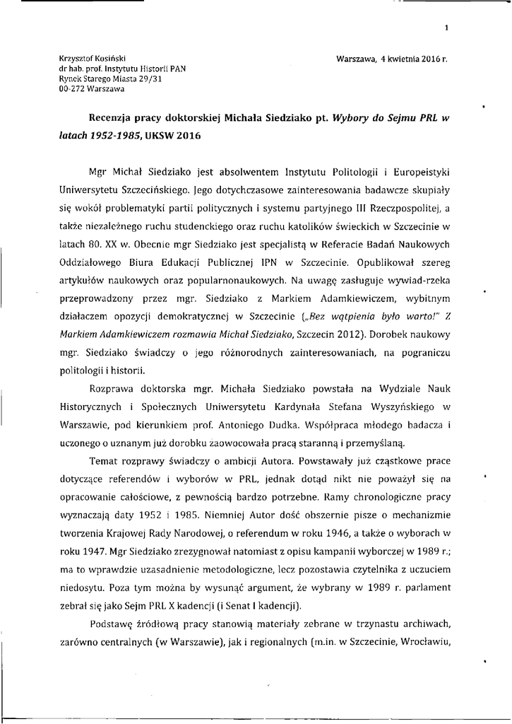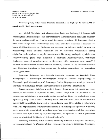 1 Krzysztof Kosiński dr hab. prof. Instytutu Historii PAN Rynek Starego Miasta 29/31 00-272 Warszawa Warszawa, 4 kwietnia 2016 r. Recenzja pracy doktorskiej Michała Siedziako pt. Wybory do Sejmu PRL w latach 1952-1985, UKSW 2016 Mgr Michał Siedziako jest absolwentem Instytutu Politologii i Europeistyki Uniwersytetu Szczecińskiego. Jego dotychczasowe zainteresowania badawcze skupiały się wokół problematyki partii politycznych i systemu partyjnego III Rzeczpospolitej, a także niezależnego ruchu studenckiego oraz ruchu katolików świeckich w Szczecinie w latach 80. XX w. Obecnie mgr Siedziako jest specjalistą w Referacie Badań Naukowych Oddziałowego Biura Edukacji Publicznej IPN w Szczecinie. Opublikował szereg artykułów naukowych oraz popularnonaukowych. Na uwagę zasługuje wywiad-rzeka przeprowadzony przez mgr. Siedziako z Markiem Adamkiewiczem, działaczem opozycji demokratycznej w Szczecinie [„Bez wgtpienia wybitnym było warto!" Z Markiem Adamkiewiczem rozmawia Michał Siedziako, Szczecin 2012). Dorobek naukowy mgr. Siedziako świadczy o jego różnorodnych zainteresowaniach, na pograniczu politologii i historii. Rozprawa Historycznych doktorska mgr. Michała Siedziako powstała na Wydziale i Społecznych Uniwersytetu Kardynała Stefana Nauk Wyszyńskiego w Warszawie, pod kierunkiem prof. Antoniego Dudka. Współpraca młodego badacza i uczonego o uznanym już dorobku zaowocowała pracą staranną i przemyślaną. Temat rozprawy świadczy o ambicji Autora. Powstawały już cząstkowe prace dotyczące referendów i wyborów w PRL, jednak dotąd nikt nie poważył się na opracowanie całościowe, z pewnością bardzo potrzebne. Ramy chronologiczne pracy wyznaczają daty 1952 i 1985. Niemniej Autor dość obszernie pisze o mechanizmie tworzenia Krajowej Rady Narodowej, o referendum w roku 1946, a także o wyborach w roku 1947. Mgr Siedziako zrezygnował natomiast z opisu kampanii wyborczej w 1989 r.; ma to wprawdzie uzasadnienie metodologiczne, lecz pozostawia czytelnika z uczuciem niedosytu. Poza tym można by wysunąć argument, że wybrany w 1989 r. parlament zebrał się jako Sejm PRL X kadencji (i Senat I kadencji). Podstawę źródłową pracy stanowią materiały zebrane w trzynastu archiwach, zarówno centralnych (w Warszawie), jak i regionalnych (m.in. w Szczecinie, Wrocławiu, 2 Gdańsku, Lublinie, Łodzi). Literatura przedmiotu dobrana została starannie, została też w pełni spożytkowana w pracy. Brakuje w niej jednak studiów Michała Głowińskiego dotyczących peerelowskiej nowomowy wyborczych), a zwłaszcza Dziennika (przydatnych 1954-1957 m.in. w analizie haseł Jana Józefa Lipskiego z obszernym opisem przygotowań do wyborów w styczniu 1957 r. Na pochwałę zasługuje natomiast to, że Autor wykorzystał szereg monografii niepublikowanych, np. prace magisterskie, co dobrze świadczy o jego dociekliwości badawczej. Co jeszcze ważniejsze, mgr Siedziako zebrał dziesięć relacji, m.in. prominentów okresu PRL, jak Maciej Szczepański, Stanisław Ciosek czy Tadeusz Fiszbach. Można zatem powiedzieć, że praca oparta jest na solidnych podstawach. Konstrukcja pracy ma charakter chronologiczno-problemowy. Rozprawa składa się ze wstępu, sześciu rozdziałów oraz zakończenia. Całość liczy przeszło 400 stron. Pracę cechuje dojrzały, wyważony język. Należy też docenić redakcyjne dopracowanie tekstu, dzięki czemu udało się uniknąć poważniejszych usterek interpunkcyjnych czy stylistycznych. W dość obszernym Wstępie mgr Siedziako uzasadnia wybór tematu pracy, przedstawia jej główne cele (wśród nich również problem frekwencji), zgłasza hipotezy badawcze, charakteryzuje wykorzystane źródła, omawia dotychczasową literaturę przedmiotu. Autor wyjaśnia, dlaczego pominął opis wyborów w 1989 r.; jak już sygnalizowałem, argumenty te nie do końca przekonują, choć Autor miał prawo podjąć taką decyzję (s. 13). Mgr Siedziako zaznacza też, że przedstawione w pracy „wnioski są konsekwencją zastosowania metod badawczych właściwych dla badań z zakresu nauk o polityce" (s. 7). W znacznej mierze praca jest jednak historią wyborów w PRL. Można odnieść wrażenie, że o ile Autor sprawnie porusza się w obrębie metodologii wypracowanej przez politologię, o tyle mniej pewnie czuje się na gruncie tradycyjnej historii. Pomimo tego zastrzeżenia, trzeba podkreślić, że Autor w przekonujący sposób uzasadnia założenia badawcze; widać, że dokładnie przemyślał temat swojej pracy. Rozdział 1 pt. Modele i funkcje wyborów w państwach bloku sowieckiego stanowi bardzo dobre, klarowne wprowadzenie do tematu pracy. Autor pokazuje mechanizmy wyborcze w Związku Sowieckim i ich oddziaływanie na kraje bloku (s. 21). Omawia specyfikę wyborów w Związku Sowieckim, począwszy od wyborów do Zgromadzenia Konstytucyjnego (s. 21). Przedstawia następnie zmiany zachodzące w kolejnych dekadach (zdaniem Autora raczej niewielkie) (np. s. 28). Mgr Siedziako trafnie 3 dowodzi, że wyróżnikami wyborów w Związku Sowieckim było z jednej strony wystawianie „jednego kandydata do jednego mandatu", pod ścisłym nadzorem partii komunistycznej (s. 31), z drugiej zaś - dążenie do uzyskania blisko stuprocentowej frekwencji, co przemieniało wybory w gigantyczną operację mobilizacyjną (s. 38-39). W ślad za innymi badaczami Autor podaje, że w różnego rodzaju działania propagandowe oraz organizację głosowania angażowano każdorazowo nawet 15% populacji (s. 33). Bardzo dobrze wypada podrozdział poświęcony, jak to określa Autor, „modelom wyborów w państwach sowieckiej strefy wpływów". I w tym wypadku zaletą wywodu jest przejrzystość i zwięzłość (s. 41). Zebrana literatura przedmiotu pozwoliła Autorowi pokazać, w jaki sposób powielano sowiecki model w różnych krajach tzw. bloku wschodniego (np. s. 49). Mgr Siedziako stawia pozornie banalne, lecz w istocie fundamentalne pytanie, po co w ogóle w