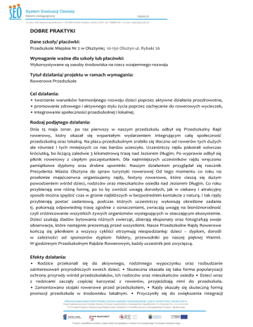 DOBRE PRAKTYKI Dane szkoły/ placówki: Przedszkole Miejskie Nr 2 w Olsztynie; 10-150 Olsztyn ul. Rybaki 26 Wymaganie ważne dla szkoły lub placówki: Wykorzystywane są zasoby środowiska na rzecz wzajemnego rozwoju Tytuł działania/ projektu w ramach wymagania: Rowerowe Przedszkole Cel działania: • tworzenie warunków harmonijnego rozwoju dzieci poprzez aktywne działania prozdrowotne, • promowanie zdrowego i aktywnego stylu życia poprzez zachęcanie do rowerowych wycieczek, • integrowanie społeczności przedszkolnej i lokalnej. Rodzaj podjętego działania: Dnia 15 maja 2010r. po raz pierwszy w naszym przedszkolu odbył się Przedszkolny Rajd rowerowy, który okazał się wspaniałym wydarzeniem integrującym całą społeczność przedszkolną oraz lokalną. Na placu przedszkolnym zrobiło się tłoczno od rowerów tych dużych ale również i tych mniejszych co nas bardzo ucieszyło. Uczestniczy rajdu pokonali wówczas króciutką, bo liczącą zaledwie 3 kilometrową trasę nad Jeziorem Długim. Po wyprawie odbył się piknik rowerowy z ciepłym poczęstunkiem. Dla najmniejszych uczestników rajdu wręczono pamiątkowe dyplomy oraz drobne upominki. Naszym działaniom przyglądał się rzecznik Prezydenta Miasta Olsztyna do spraw turystyki rowerowej Od tego momentu co roku na przełomie maja/czerwca organizujemy rajdy, festyny rowerowe, które cieszą się dużym powodzeniem wśród dzieci, rodziców oraz mieszkańców osiedla nad Jeziorem Długim. Co roku przybierają one różną formę, po to by zwrócić uwagę dorosłych, jak w ciekawy i atrakcyjny sposób można spędzić czas w gronie najbliższych w bezpośrednim kontakcie z naturą. I tak rajdy przybierają postać zadaniową, podczas których uczestniczy wykonują określone zadania tj. pokonują odpowiednią trasę zgodnie z oznaczeniami, zwracają uwagę na bioróżnorodność czyli zróżnicowanie wszystkich żywych organizmów występujących w otaczającym ekosystemie. Dzieci szukają śladów bytowania różnych zwierząt, zbierają eksponaty oraz fotografują swoje obserwacje, które następnie prezentują przed wszystkimi. Nasze Przedszkolne Rajdy Rowerowe kończą się piknikiem a wszyscy cykliści otrzymują niespodziankę: dzieci – dyplom, dorośli w zależności od sponsorów dyplom- foldery, przewodniki po naszej pięknej Warmii. W godzinnym Przedszkolnym Rajdzie Rowerowym, każdy uczestnik jest zwycięzcą. Efekty działania: • Rodzice przekonali się do aktywnego, rodzinnego wypoczynku oraz rozbudzanie zainteresowań przyrodniczych swoich dzieci. • Skuteczna okazała się taka forma popularyzacji ochrony przyrody wśród przedszkolaków, ich rodziców oraz mieszkańców osiedla • Dzieci wraz z rodzicami zaczęły częściej korzystać z rowerów, przyjeżdżają nimi do przedszkola. • Zamontowano stojaki rowerowe przed przedszkolem, • Rajdy okazały się skuteczną formą promocji przedszkola w środowisku lokalnym. • Przyczyniły się do zwiększenia integracji środowiska przedszkolnego oraz lokalnego. • Widoczne jest bardziej aktywne zaangażowanie rodziców w życie przedszkola. Rady i przestrogi: Warunkiem koniecznym do właściwej realizacji działania jest wybranie odpowiedniego, bezpiecznego miejsca z dala od ruchu samochodowego na organizację rajdu. Najlepszym miejscem jest pobliski teren zielony, las, park, albo tak jak w naszym przypadku przylegający do przedszkola Las Miejski, rowerowa ścieżka wokół jeziora Długiego. Pomocnikami w organizacji rajdu mogą być różnego rodzaju firmy i instytucje, które mogą przekazać środki finansowe lub gadżety, które można wykorzystać na nagrody dla uczestników. Dostępność informacji na temat podjętego działania: Tajemniczy Ekoogród i Zielony Rajd - Teraz DB Schenker Magazyn dla pracowników, Nr. 6 (185) Czerwiec 2010 http://www.rowerowy.olsztyn.pl/wydarzenia/142-rowerowe-przedszkole.html http://www.przyjaznyol.nazwa.pl/www/przedszkole_2_olsztyn/index.php?option=com_cont ent&view=article&id=64&Itemid=71 http://www.przyjaznyol.nazwa.pl/www/przedszkole_2_olsztyn/index.php?option=com_content& view=article&id=72&Itemid=78 http://www.przyjaznyol.nazwa.pl/www/przedszkole_2_olsztyn/index.php?option=com_content& view=article&id=82&Itemid=89 Streszczenie: Inicjatywa pt. Rowerowe Przedszkole, jest cyklicznym, zapoczątkowanym w 2010 roku w Przedszkolu nr 2 w Olszynie, innowacyjnym działaniem integrującym wiele dziedzin i treści edukacji przedszkolnej. W ramach tego projektu zorganizowano do tej pory trzy rajdy/festyny rowerowe odbywające się cyklicznie na przełomie maja i czerwca. Ich celem jest realizacja treści edukacji ekologicznej, prozdrowotnej oraz regionalnej w formie, która integruje oddziaływania rodziny oraz środowiska lokalnego. Nie bez znaczenia jest atrakcyjność tej formy realizacji dla jej uczestników – w tym szczególnie dzieci jak i rodziców. Podjęte działania zaowocowały szeregiem trwałych, zasługujących na uwagę rezultatów: • Rodzice przekonali się do aktywnego, rodzinnego wypoczynku oraz rozbudzanie zainteresowań przyrodniczych swoich dzieci. • Skuteczna okazała się taka forma popularyzacji ochrony przyrody wśród przedszkolaków, ich rodziców oraz mieszkańców osiedla • Dzieci wraz z rodzicami zaczęły częściej korzystać z rowerów, przyjeżdżają nimi do przedszkola. • Rajdy okazały się skuteczną formą promocji przedszkola w środowisku lokalnym. • Przyczyniły się do zwiększenia integracji środowiska przedszkolnego oraz lokalnego. • Widoczne jest bardziej aktywne zaangażowanie rodziców w życie przedszkola.