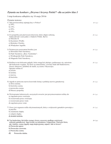 Pytania na konkurs „Drzewa i krzewy Polski”- dla uczniów klas I I etap konkursu odbędzie się 18 maja 2016r Pytania testowe 1. Jaką powierzchnię zajmują lasy w Polsce? a) 59%. b) 19%. c) 29%. d) 39%. (0–1 p.) 2. Cis pospolity jest pierwszym drzewem, które objęto ochroną. (0–1 p.) 3. Światowym rezerwatem biosfery jest (0–1 p.) Zadecydował o tym jeden z władców Polski. Był to a) Mieszko II. b) Kazimierz Wielki. c) Bolesław Chrobry. d) Władysław Jagiełło. a) Słowiński Park Narodowy. b) Park Narodowy „Bory Tucholskie”. c) Wielkopolski Park Narodowy. d) Magurski Park Narodowy. 4. Roślina ta ma kolczaste gałązki, które mogą być płożące, podnoszące się, uniesione lub łuskowato wygięte. Jej liście są zimozielone, a kwiaty białe lub bladoróżowe. Owoce zbiorowe, podobne do malin, są czarne i błyszczące. Opisana roślina to a) jeżyna. b) tarnina. c) morwa. d) borówka. (0–1 p.) 5. Jagoda to potoczna nazwa krzewinki leśnej o polskiej nazwie gatunkowej a) śliwa tarnina. b) borówka czarna. c) porzeczka czarna. d) bluszcz pospolity. (0–1 p.) 6. Wytwarzanie kolorowych, soczystych owoców jest przystosowaniem rośliny do a) zapylania przez zwierzęta. b) rozsiewania przez zwierzęta. c) rozsiewania przez wiatr. d) zapylania przez wiatr. (0–1 p.) 7. Owoc jest organem roślin okrytonasiennych, który u większości gatunków powstaje z a) pręcika. b) znamienia słupka. c) zalążni słupka. d) działek kielicha. (0–1 p.) 8. Ten hodowlany lub dziko rosnący krzew owocowy podlega częściowej ochronie gatunkowej. Jego kwiaty są zielonkawe i niepozorne. Zarówno liście, jak i kuliste, czarne jagody mają nieprzyjemny zapach. Jaki to krzew? a) Porzeczka agrest. b) Porzeczka czerwona. c) Porzeczka czarna. (0–1 p.) d) Porzeczka skalna. 9. Dopasuj nazwę gatunkową do nazwy rodzajowej drzewa. (0–6 p.) drobnolistna, czarna, iwa, szerokolistna, osika, płacząca Lipa Wierzba Topola 10. Podkreśl gatunki roślin o zimozielonych liściach. dziki bez czarny, jemioła pospolita, malina zwyczajna, bluszcz pospolity, trzmielina zwyczajna, wrzos pospolity, wierzba biała, bagno zwyczajne, porzeczka agrest (0–4 p.) 11. Dopasuj roślinę do typu owocu. (0–5 p.) • skrzydlak porzeczka • dąb • kasztanowiec • śliwa • klon • • pestkowiec • strąk • orzech • jagoda • torebka 12. Połącz liść z odpowiednim owocem. Wpisz nazwy drzew lub krzewów, do których należą przedstawione na ilustracjach elementy budowy roślin. (0–8 p.) ........................ 13. W odpowiednie miejsca wpisz nazwy rodzajowe drzew przedstawionych na fotografiach. (0–3 p.) 14. Uzupełnij schemat podziału owoców. (0–3 p.) Owoce ................................ mięsiste zbiorowe ................................ ................................ niepękające 15. Rozpoznaj i podpisz kwiat męski i żeński sosny. kwiat kwiat ........................... ........................... 16. Dokończ zdania, wpisując rodzaj drzewa lub krzewu . (0–2 p.) (0–4 p.) Zimozielonym półpasożytem drzew jest . . . . . . . . . . . . . . . . . . . . . . . . . . . Granatowe mięsiste łuski nasienne tworzące szyszkojagody posiada . . . . . . . . . . . . . . . . . . . . . . . . . . . Dwie igły na krótkopędzie znajdziemy u . . . . . . . . . . . . . . . . . . . . . . . . . . . Szypułkowy, bezszypułkowy, czerwony to nazwy gatunkowe . . . . . . . . . . . . . . . . . . . . . . . . . . . 17. Podane gatunki roślin wpisz w odpowiednie miejsca w tabeli. cis pospolity, buk pospolity, klon zwyczajny, jałowiec pospolity, żarnowiec miotlasty, lipa drobnolistna, dziki bez czarny, wierzba iwa, malina (0–12 p.) zwyczajna, głóg jednoszyjkowy, porzeczka agrest, brzoza brodawkowata Drzewo Krzew Krzew lub drzewo 18. Na podstawie poniższych opisów rozpoznaj drzewa lub krzewy owocowe. Wpisz ich nazwy. (0–3 p.) Krzew ten osiąga do 1,5 m wysokości. Jego liście są owłosione, trój- lub pięcioklapowe, osadzone w kątach cierni. Kwiaty są zielonkawożółte. Owoc typu jagoda jest duży, jajowaty, słabo owłosiony, zwykle zielony lub żółty, czasami czerwony. .................................................. Drzewo to ma nieregularną, luźno ułożoną koronę. Może osiągać wysokość od 10 do 15 m. Kwiaty są białe lub różowe. Pestkowce są duże, kuliste lub podłużne, zabarwione zależnie od odmiany. .................................................. Krzew ten osiąga wysokość 2 m. Ma podziemne rozłogi i obłe pędy z maleńkimi kolcami. Jego liście są pierzaste, złożone z 3 do 5 listków. Listki z wierzchu są nagie, dolne powierzchnie mają filcowato-owłosione, a ich brzegi są piłkowane. Krzew ten ma białe kwiaty i soczyste czerwone owoce zbiorowe o przyjemnym zapachu. Owoce te zbudowane są z małych pestkowców. .................................................. 19. Podpisz elementy budowy igły sosny wskazane na ilustracji. (0–4 p.) 20. Podaj trzy przykłady działań człowieka służące ochronie drzewostanu w Polsce . (0–3 p.) • ................................................................................................ ............................................................... ............................. • ............................................................... .................................................................................................. ........................... • .................................................................................................. ............................................................... ........................... 21. Korzystając z podanych wyrazów, obok zbiorowisk leśnych wpisz nazwy dominujących w nich gatunków drzew (można wpisać więcej niż jeden gatunek, gatunki mogą się również powtarzać). (0–4 p.) olsza czarna, jesion wyniosły, sosna zwyczajna, dąb szypułkowy, klon zwyczajny, lipa szerokolistna, wierzba purpurowa, topo