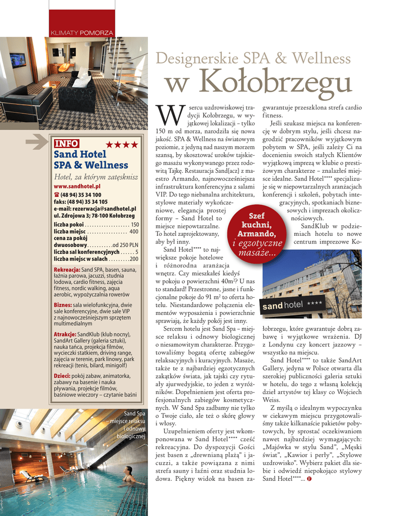 klimaty pomorza Designerskie SPA & Wellness w Kołobrzegu W INFO HHHH Sand Hotel SPA & Wellness Hotel, za którym zatęsknisz www.sandhotel.pl (48 94) 35 34 100 faks: (48 94) 35 34 105 e-mail: [email protected] ul. Zdrojowa 3; 78-100 Kołobrzeg liczba pokoi��������������������������������������150 liczba miejsc . . . . . . . . . . . . . . . . . . 400 cena za pokój dwuosobowy. . . . . . . . . . . od 250 PLN liczba sal konferencyjnych. . . . . . . 5 liczba miejsc w salach . . . . . . . . . 200 Rekreacja: Sand SPA, basen, sauna, łaźnia parowa, jacuzzi, studnia lodowa, cardio fitness, zajęcia fitness, nordic walking, aqua aerobic, wypożyczalnia rowerów Biznes: sala wielofunkcyjna, dwie sale konferencyjne, dwie sale VIP z najnowocześniejszym sprzętem multimedialnym Atrakcje: SandKlub (klub nocny), SandArt Gallery (galeria sztuki), nauka tańca, projekcja filmów, wycieczki statkiem, driving range, zajęcia w terenie, park linowy, park rekreacji (tenis, bilard, minigolf) Dzieci: pokój zabaw, animatorka, zabawy na basenie i nauka pływania, projekcje filmów, baśniowe wieczory – czytanie baśni Sand Spa – miejsce relaksu i odnowy biologicznej 2 business tr aveller sercu uzdrowiskowej tra- gwarantuje przeszklona strefa cardio dycji Kołobrzegu, w wy- fitness. jątkowej lokalizacji – tylko Jeśli szukasz miejsca na konferen150 m od morza, narodziła się nowa cję w dobrym stylu, jeśli chcesz najakość. SPA & Wellness na światowym grodzić pracowników wyjątkowym poziomie, z jedyną nad naszym morzem pobytem w SPA, jeśli zależy Ci na szansą, by skosztować uroków tajskie- docenieniu swoich stałych Klientów go masażu wykonywanego przez rodo- wyjątkową imprezą w klubie o prestiwitą Tajkę. Restauracja Sand{acz} z ma- żowym charakterze – znalazłeś miejestro Armando, najnowocześniejsza sce idealne. Sand Hotel**** specjalizuinfrastruktura konferencyjna z salami je się w niepowtarzalnych aranżacjach VIP. Do tego niebanalna architektura, konferencji i szkoleń, pobytach intestylowe materiały wykończegracyjnych, spotkaniach bizneniowe, elegancja prostej sowych i imprezach okoliczSzef formy – Sand Hotel to nościowych. kuchni, miejsce niepowtarzalne. SandKlub w podzieTo hotel zaprojektowany, miach hotelu to nowe Armando, aby był inny. centrum imprezowe KoSand Hotel**** to największe pokoje hotelowe i różnorodna aranżacja wnętrz. Czy mieszkałeś kiedyś w pokoju o powierzchni 40m²? U nas to standard! Przestronne, jasne i funkcjonalne pokoje do 91 m² to oferta hotelu. Niestandardowe połączenia elementów wyposażenia i powierzchnie sprawiają, że każdy pokój jest inny. Sercem hotelu jest Sand Spa – miej- łobrzegu, które gwarantuje dobrą zasce relaksu i odnowy biologicznej bawę i wyjątkowe wrażenia. DJ o niesamowitym charakterze. Przygo- z Londynu czy koncert jazzowy – towaliśmy bogatą ofertę zabiegów wszystko na miejscu. relaksacyjnych i kuracyjnych. Masaże, Sand Hotel**** to także SandArt także te z najbardziej egzotycznych Gallery, jedyna w Polsce otwarta dla zakątków świata, jak tajski czy rytu- szerokiej publiczności galeria sztuki ały ajurwedyjskie, to jeden z wyróż- w hotelu, do tego z własną kolekcją ników. Dopełnieniem jest oferta pro- dzieł artystów tej klasy co Wojciech fesjonalnych zabiegów kosmetycz- Weiss. nych. W Sand Spa zadbamy nie tylko Z myślą o idealnym wypoczynku o Twoje ciało, ale też o skórę głowy w ciekawym miejscu przygotowalii włosy. śmy także kilkanaście pakietów pobyUzupełnieniem oferty jest wkom- towych, by sprostać oczekiwaniom ponowana w Sand Hotel**** cześć nawet najbardziej wymagających: rekreacyjna. Do dyspozycji Gości „Majówka w stylu Sand”, „Męski jest basen z „drewnianą plażą” i ja- świat”, „Kawior i perły”, „Stylowe cuzzi, a także powiązana z nimi uzdrowisko”. Wybierz pakiet dla siestrefa sauny i łaźni oraz studnia lo- bie i odwiedź niepokojąco stylowy dowa. Piękny widok na basen za- Sand Hotel****… i egzotyczne masaże…