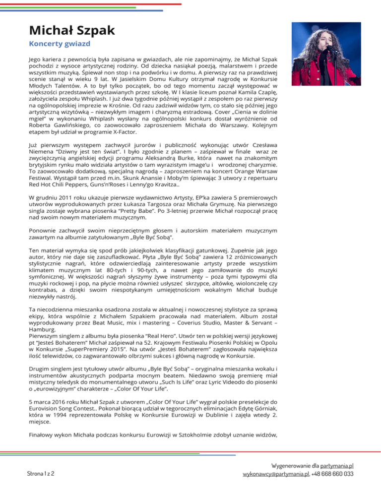 Michał Szpak Koncerty gwiazd Jego kariera z pewnością była zapisana w gwiazdach, ale nie zapominajmy, że Michał Szpak pochodzi z wysoce artystycznej rodziny. Od dziecka nasiąkał poezją, malarstwem i przede wszystkim muzyką. Śpiewał non stop i na podwórku i w domu. A pierwszy raz na prawdziwej scenie stanął w wieku 9 lat. W Jasielskim Domu Kultury otrzymał nagrodę w Konkursie Młodych Talentów. A to był tylko początek, bo od tego momentu zaczął występować w większości przedstawień wystawianych przez szkołę. W I klasie liceum poznał Kamila Czaplę, założyciela zespołu Whiplash. I już dwa tygodnie później wystąpił z zespołem po raz pierwszy na ogólnopolskiej imprezie w Krośnie. Od razu zadziwił widzów tym, co stało się później jego artystyczną wizytówką – niezwykłym imagem i charyzmą estradową. Cover „Cienia w dolinie mgieł” w wykonaniu Whiplash wysłany na ogólnopolski konkurs dostał wyróżnienie od Roberta Gawlińskiego, co zaowocowało zaproszeniem Michała do Warszawy. Kolejnym etapem był udział w programie X-Factor. Już pierwszym występem zachwycił jurorów i publiczność wykonując utwór Czesława Niemena “Dziwny jest ten świat”. I było zgodnie z planem – zaśpiewał w finale wraz ze zwyciężczynią angielskiej edycji programu Aleksandrą Burke, która nawet na znakomitym brytyjskim rynku mało widziała artystów o tam wyrazistym image’u i wrodzonej charyzmie. To zaowocowało dodatkową, specjalną nagrodą – zaproszeniem na koncert Orange Warsaw Festiwal. Wystąpił tam przed m.in. Skunk Anansie i Moby’m śpiewając 3 utwory z repertuaru Red Hot Chili Peppers, Guns’n’Roses i Lenny’go Kravitza.. W grudniu 2011 roku ukazuje pierwsze wydawnictwo Artysty, EP’ka zawiera 5 premierowych utworów wyprodukowanych przez Łukasza Targosza oraz Michała Grymuzę. Na pierwszego singla zostaje wybrana piosenka “Pretty Babe”. Po 3-letniej przerwie Michał rozpoczął pracę nad swoim nowym materiałem muzycznym. Ponownie zachwycił swoim nieprzeciętnym głosem i autorskim materiałem muzycznym zawartym na albumie zatytułowanym „Byle Być Sobą”. Ten materiał wymyka się spod prób jakiejkolwiek klasyfikacji gatunkowej. Zupełnie jak jego autor, który nie daje się zaszufladkować. Płyta „Byle Być Sobą” zawiera 12 zróżnicowanych stylistycznie nagrań, które odzwierciedlają zainteresowanie artysty przede wszystkim klimatem muzycznym lat 80-tych i 90-tych, a nawet jego zamiłowanie do muzyki symfonicznej. W większości nagrań słyszymy żywe instrumenty – poza tymi typowymi dla muzyki rockowej i pop, na płycie można również usłyszeć skrzypce, altówkę, wiolonczelę czy kontrabas, a dzięki swoim niespotykanym umiejętnościom wokalnym Michał buduje niezwykły nastrój. Ta niecodzienna mieszanka osadzona została w aktualnej i nowoczesnej stylistyce za sprawą ekipy, która wspólnie z Michałem Szpakiem pracowała nad materiałem. Album został wyprodukowany przez Beat Music, mix i mastering – Coverius Studio, Master & Servant – Hamburg. Pierwszym singlem z albumu była piosenka “Real Hero”. Utwór ten w polskiej wersji językowej pt “Jesteś Bohaterem” Michał zaśpiewał na 52. Krajowym Festiwalu Piosenki Polskiej w Opolu w Konkursie „SuperPremiery 2015”. Na utwór „Jesteś Bohaterem” zagłosowała największa ilość telewidzów, co zagwarantowało olbrzymi sukces i główną nagrodę w Konkursie. Drugim singlem jest tytułowy utwór albumu „Byle Być Sobą” – oryginalna mieszanka wokalu i instrumentów akustycznych podparta mocnym beatem. Niedawno swoją premierę miał mistyczny teledysk do monumentalnego utworu „Such Is Life” oraz Lyric Videodo do piosenki o „eurowizyjnym” charakterze – „Color Of Your Life”. 5 marca 2016 roku Michał Szpak z utworem „Color Of Your Life” wygrał polskie preselekcje do Eurovision Song Contest.. Pokonał biorącą udział w tegorocznych eliminacjach Edytę Górniak, która w 1994 reprezentowała Polskę w Konkursie Eurowizji w Dublinie i zajęła wtedy 2. miejsce. Finałowy wykon Michała podczas konkursu Eurowizji w Sztokholmie zdobył uznanie widzów, Strona 1 z 2 Wygenerowanie dla partymania.pl [email protected], +48 668 660 033 wg których artysta zasłużył na 3cie miejsce. Finalnie Michał zajął ósmą pozycje. Publika pokochała go od pierwszego momentu, dlatego też niedługo Michał odbędzie tournee po Europie. W czerwcu na prestiżowym i historycznym Krajowym Festiwalu Polskiej Piosenki w Opolu Michał Szpak zdobywa Grand Prix Publiczności – Złote Opole będące podsumowaniem 53 letniej tradycji festiwalu. Strona 2 z 2 Powered by TCPDF (www.tcpdf.org) Wygenerowanie dla partymania.pl [email protected], +48 668 660 033