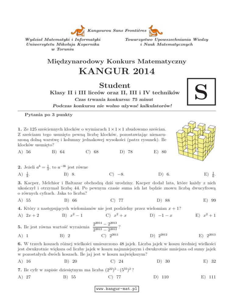 Kangourou Sans Frontières Wydział Matematyki i Informatyki Uniwersytetu Mikołaja Kopernika w Toruniu Towarzystwo Upowszechniania Wiedzy i Nauk Matematycznych Międzynarodowy Konkurs Matematyczny KANGUR 2014 Student Klasy II i III liceów oraz II, III i IV techników Czas trwania konkursu: 75 minut S Podczas konkursu nie wolno używać kalkulatorów! Pytania po 3 punkty 1. Ze 125 sześciennych klocków o wymiarach 1 × 1 × 1 zbudowano sześcian. Z sześcianu tego usunięto pewną liczbę klocków, pozostawiając nienaruszoną dolną warstwę i kolumny jednakowej wysokości (patrz rysunek). Ile klocków usunięto? A) 56 B) 64 C) 68 D) 78 E) 80 2. Jeżeli ab = 21 , to a−3b jest równe A) 1 . 8 B) 8. C) −8. D) 6. E) 1 . 6 3. Kacper, Melchior i Baltazar obchodzą dziś urodziny. Kacper dodał lata, które każdy z nich ukończył i otrzymał liczbę 44. Po pewnym czasie suma ich lat będzie znowu liczbą dwucyfrową o równych cyfrach. Jaka to liczba? A) 55 B) 66 C) 77 D) 88 E) 99 4. Który z następujących wielomianów nie jest podzielny przez wielomian x + 1? A) 2x + 2 B) x2 − 1 5. Ile jest równa wartość wyrażenia A) 1 B) 2 C) x2 + x 22014 − 22013 ? 22013 − 22012 C) 22011 D) −1 − x D) 22012 E) x2 + 1 E) 22013 6. W trzech koszach różnej wielkości umieszczono 48 jajek. Liczba jajek w koszu średniej wielkości jest dwukrotnie większa od liczby jajek w koszu najmniejszym i dwukrotnie mniejsza od sumy jajek w pozostałych dwóch koszach. Ile jaj jest w koszu największym? A) 16 B) 20 C) 24 7. Ile cyfr w zapisie dziesiętnym ma liczba (222 )5 · (555 )2 ? A) 27 B) 55 C) 77 www.kangur-mat.pl D) 30 E) 32 D) 110 E) 111 www.kangur-mat.pl 8. W liczbie 2014, wyrażającej bieżący rok, cyfry są różne i ostatnia z nich jest większa od sumy pozostałych. Ile lat temu ostatnio zdarzyła się taka sytuacja? A) 5 B) 205 C) 215 D) 305 E) 315 9. Po rozwinięciu powierzchni bocznych dwóch małych identycznych walców otrzymano dwa prostokąty, które sklejono w jeden większy prostokąt wzdłuż boku odpowiadającego wysokości tych walców. Otrzymany prostokąt pokrywa się z powierzchnią boczną dużego walca o takiej samej wysokości jak małe walce (patrz rysunek obok). Ile razy objętość dużego walca jest większa od objętości małego walca? A) 2 B) 3 C) π D) 4 E) 8 10. Pan Hilary ma w biurku cztery szuflady. Wczoraj otrzymał osiem listów i każdy z nich włożył do którejś z szuflad. Które z następujących zdań jest na pewno prawdziwe? A) B) C) D) E) W każdej szufladzie biurka są dwa listy. Wszystkie listy nie mogą być w jednej szufladzie. W każdej szufladzie jest co najmniej jeden list. W którejś z szuflad są co najmniej dwa listy. Dwie szuflady zawierają co najmniej po dwa listy. Pytania po 4 punkty 11. Dany jest prostopadłościan o wymiarach a × b × c, gdzie a < b < c, oraz liczba dodatnia d. Jeżeli jeden z wymiarów prostopadłościanu zwiększymy o d, to wzrośnie objętość prostopadłościanu. Zwiększenie którego z wymiarów spowoduje największy wzrost objętości prostopadłościanu? A) a D) Objętość zawsze wzrośnie o tyle samo. B) b C) c E) Zależy to od wartości a, b, c. 12. W meczu piłki nożnej zwycięzca otrzymuje 3 punkty, pokonany 0 punktów, a w przypadku remisu obie drużyny otrzymują po 1 punkcie. Cztery drużyny: A, B, C, D uczestniczyły w turnieju. Każda rozegrała trzy mecze, po jednym z każdą inną. Po zakończeniu turnieju drużyna A miała 7 punktów, drużyny B i C po 4 punkty. Ile punktów zdobyła drużyna D ? A) 0 B) 1 C) 2 D) 3 E) 4 13. Ile trójek liczb całkowitych (a, b, c), gdzie a > b > c > 1, spełnia nierówność A) 0 B) 1 C) 2 D) 3 B) 18 C) 21 D) 24 + 1b + 1 c > 1? E) Nieskończenie wiele. 14. Rysunek obok przedstawia dwa współśrodkowe okręgi, których promienie są w proporcji 1 : 3. Odcinek AC jest średnicą dużego okręgu, BC jego cięciwą styczną do małego okręgu, |AB| = 12. Ile jest równy promień dużego okręgu? A) 13 1 a C A E) 26 B 15. Dla jakiego n sześć tygodni to dokładnie 1 · 2 · 3 · 4 · . . . · n sekund? A) 6 B) 7 C) 8 D) 10 E) 12 www.kangur-mat.pl 16. Dane są trzy niezerowe liczby rzeczywiste a, b, c oraz dodatnia liczba całkowita n. Wiadomo, że liczby (−2)2n+3 a2n+2 b2n−1 c3n+2 oraz (−3)2n+2 a4n+1 b2n+5 c3n−4 mają ten sam znak. Która z następujących nierówności jest na pewno prawdziwa? A) a > 0 B) b > 0 C) c > 0 D) a < 0 E) b < 0 X 17. Wierzchołki sześcianu ponumerowano liczbami od 1 do 8 w taki sposób, że suma liczb w czterech wierzchołkach każdej ściany jest taka sama. Liczby 1, 4 i 6 zostały zaznaczone na rysunku obok. Jaka liczba jest w wierzchołku zaznaczonym literą X ? A) 2 B) 3 C) 5 D) 7 6 E) 8 1 4 18. Opakowanie serka zawiera następujące informacje: zawartość tłuszczu w produkcie 24%, zawartość tłuszczu w suchej masie 64%. Jaki procent wody zawiera ten serek? A) 88% B) 62,5% C) 49% D) 42% 19. Dany jest prostokąt P QRS (rysunek obok) i środek T jego boku RS. Ile jest równy stosunek |P Q| : |QR|, jeżeli odcinek QT jest prostopadły do odcinka P R ? √ √ B) 3 : 1 C) 3 : 2 D) 2 : 1 E) 5 : 4 A) 2 : 1 E) 37,5% S T R Q P 20. Funkcja f (x) = ax + b spełnia równości: f (f (f (1))) = 29, f (f (f (0))) = 2. Ile jest równe a ? A) 1 B) 2 C) 3 D) 4 E) 5 Pytania po 5 punktów 21. Danych jest 10 różnych dodatnich liczb całkowitych. Dokładnie 5 z nich jest podzielnych przez 5 i dokładnie 7 podzielnych przez 7. Niech M będzie największą z tych 10 liczb. Ile jest równa najmniejsza możliwa wartość M ? A) 105 B) 77 C) 75 D) 63 22. Dany jest prostokąt ABCD, w którym |AB| = 2|AD| (rysunek obok). Prosta l przechodząca przez wierzchołek A ma tę własność, że jej odległości od punktów B i C są odpowiednio równe 6 i 2. Ile jest równa długość boku AB ? √ A) 10 B) 12 C) 14 D) 16 E) 4 3 E) Inna liczba. l D C A B 23. Na płaszczyźnie wybrano 9 punktów, z których żadne 3 nie leżą na jednej prostej. 