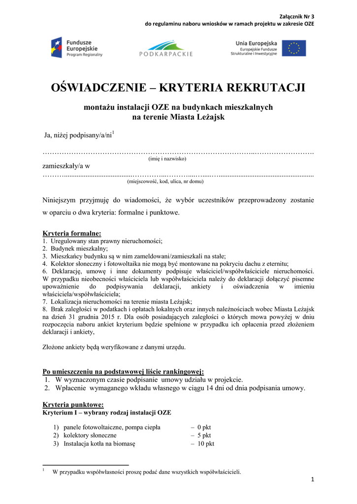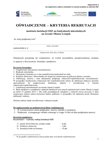 Załącznik Nr 3 do regulaminu naboru wniosków w ramach projektu w zakresie OZE OŚWIADCZENIE – KRYTERIA REKRUTACJI montażu instalacji OZE na budynkach mieszkalnych na terenie Miasta Leżajsk Ja, niżej podpisany/a/ni1 ……………………………………………………………………………..……………………. (imię i nazwisko) zamieszkały/a w ………......................................…………...………....….....…..................................................... (miejscowość, kod, ulica, nr domu) Niniejszym przyjmuję do wiadomości, że wybór uczestników przeprowadzony zostanie w oparciu o dwa kryteria: formalne i punktowe. Kryteria formalne: 1. Uregulowany stan prawny nieruchomości; 2. Budynek mieszkalny; 3. Mieszkańcy budynku są w nim zameldowani/zamieszkali na stałe; 4. Kolektor słoneczny i fotowoltaika nie mogą być montowane na pokryciu dachu z eternitu; 6. Deklarację, umowę i inne dokumenty podpisuje właściciel/współwłaściciele nieruchomości. W przypadku nieobecności właściciela lub współwłaściciela należy do deklaracji dołączyć pisemne upoważnienie do podpisywania deklaracji, ankiety i oświadczenia w imieniu właściciela/współwłaściciela; 7. Lokalizacja nieruchomości na terenie miasta Leżajsk; 8. Brak zaległości w podatkach i opłatach lokalnych oraz innych należnościach wobec Miasta Leżajsk na dzień 31 grudnia 2015 r. Dla osób posiadających zaległości o których mowa powyżej w dniu rozpoczęcia naboru ankiet kryterium będzie spełnione w przypadku ich opłacenia przed złożeniem deklaracji i ankiety, Złożone ankiety będą weryfikowane z danymi urzędu. Po umieszczeniu na podstawowej liście rankingowej: 1. W wyznaczonym czasie podpisanie umowy udziału w projekcie. 2. Wpłacenie wymaganego wkładu własnego w ciągu 14 dni od dnia podpisania umowy. Kryteria punktowe: Kryterium I – wybrany rodzaj instalacji OZE 1) panele fotowoltaiczne, pompa ciepła 2) kolektory słoneczne 3) Instalacja kotła na biomasę 1 – 0 pkt – 5 pkt – 10 pkt W przypadku współwłasności proszę podać dane wszystkich współwłaścicieli. 1 Załącznik Nr 3 do regulaminu naboru wniosków w ramach projektu w zakresie OZE Kryterium IIa – sposób ogrzewania budynku (dla instalacji kotła na biomasę) 1) Węglowe 2) Inne – 10 pkt – 0 pkt Kryterium IIb – sposób ogrzewania ciepłej wody użytkowej – c.w.u. (dla kolektorów słonecznych + pomp ciepła) 1) Węglowe 2) Inne – 10 pkt – 0 pkt Kryterium III – wielkość projektowanej instalacji (max liczba punktów -10 pkt): im mniejsza instalacja na obiekcie tym większa ilość punktów Liczba pkt wyliczana będzie wg wzoru: P = Mmin / Mw * 10 Gdzie: P – liczba przyznanych punktów Mmin – instalacja o najniższej mocy Mw – moc instalacji Wnioskodawcy Kryterium IV – gospodarstwa dotknięte problemem ubóstwa energetycznego W kryterium można uzyskać 2 pkt. za spełnienie co najmniej jednego z poniższych warunków: a) Posiadane prawo do dodatku mieszkaniowego lub energetycznego lub b) Otrzymana w 2015 roku pomoc rzeczowa w postaci opału lub ryczałtu na jego zakup lub c) W gospodarstwie domowym zameldowana jest osoba z orzeczeniem o niepełnosprawności2 lub d) Członkowie gospodarstwa domowego (zameldowani) posiadają prawo do świadczenia rodzinnego lub e) W gospodarstwie zameldowana jest rodzina wielodzietna (co najmniej 3 dzieci) – zgodnie z ustawą o świadczeniach rodzinnych lub zameldowana jest rodzina zastępcza Kryteria powyższe muszą pozostać spełnione również na dzień złożenia wniosku o dofinansowanie (IV kwartał br.) i będą weryfikowane. Wybór Uczestników projektu przebiegał będzie dwuetapowo: W pierwszej kolejności złożona deklaracja wraz z załącznikami sprawdzona zostanie pod względem poprawności formalnej i kompletności informacji. Każdemu Uczestnikowi projektu, który uzyska pozytywną ocenę formalną złożonych dokumentów, przypisane zostaną punkty wg. kryteriów punktowych. Na tej podstawie utworzona zostanie „lista rankingowa” począwszy od największej liczby punktów aż do wyczerpania wolnych miejsc. W przypadku, gdy liczba wolnych miejsc zostanie wyczerpana, a występować będą osoby z taką samą liczbą punktów, wówczas wśród tej grupy osób przeprowadzone zostanie losowanie, które wyłoni osoby zakwalifikowane oraz osoby rezerwowe. 2 W przypadku osób z orzeczoną niepełnosprawnością należy przedstawić oświadczenie dotyczące zamieszkania (zameldowania na stałe) osób niepełnosprawnych z orzeczoną niepełnosprawnością. 2 Załącznik Nr 3 do regulaminu naboru wniosków w ramach projektu w zakresie OZE Niniejszym oświadczam, że3: I. Rodzaj wybranej instalacji OZE: kocioł na biomasę kolektor słoneczny inne (panele fotowoltaiczne, pompa ciepła) IIa. W obiekcie, w którym mają być montowane kotły na biomasę występuje: przygotowanie c.w.u. i CO w oparciu o źródło: węgiel, inne ………….……… IIb. W obiekcie, na którym mają być montowane kolektory słoneczne występuje przygotowanie c.w.u. w oparciu o źródło: węgiel, inne ………….……… IIIb gospodarstwa dotknięte problemem ubóstwa energetycznego Proszę zaznaczyć właściwą opcję: a) Posiadane prawo do dodatku mieszkaniowego lub energetycznego b) Otrzymana w 2015 roku pomoc rzeczowa w postaci opału lub ryczałtu na jego zakup c) W gospodarstwie domowym zameldowana jest osoba z orzeczeniem o niepełnosprawności d) Członkowie gospodarstwa domowego (zameldowani) posiadają prawo do świadczenia rodzinnego e) W gospodarstwie zameldowana jest rodzina wielodzietna (co najmniej 3 dzieci) – zgodnie z ustawą o świadczeniach rodzinnych lub zameldowana jest rodzina zastępcza UWAGA: Podanie danych niezgodnych w prawdą spowoduje skreślenie z listy rankingowej. Świadomy odpowiedzialności karnej za podanie w niniejszym oświadczeniu nieprawdy, zgodnie z art. 233 Kodeks