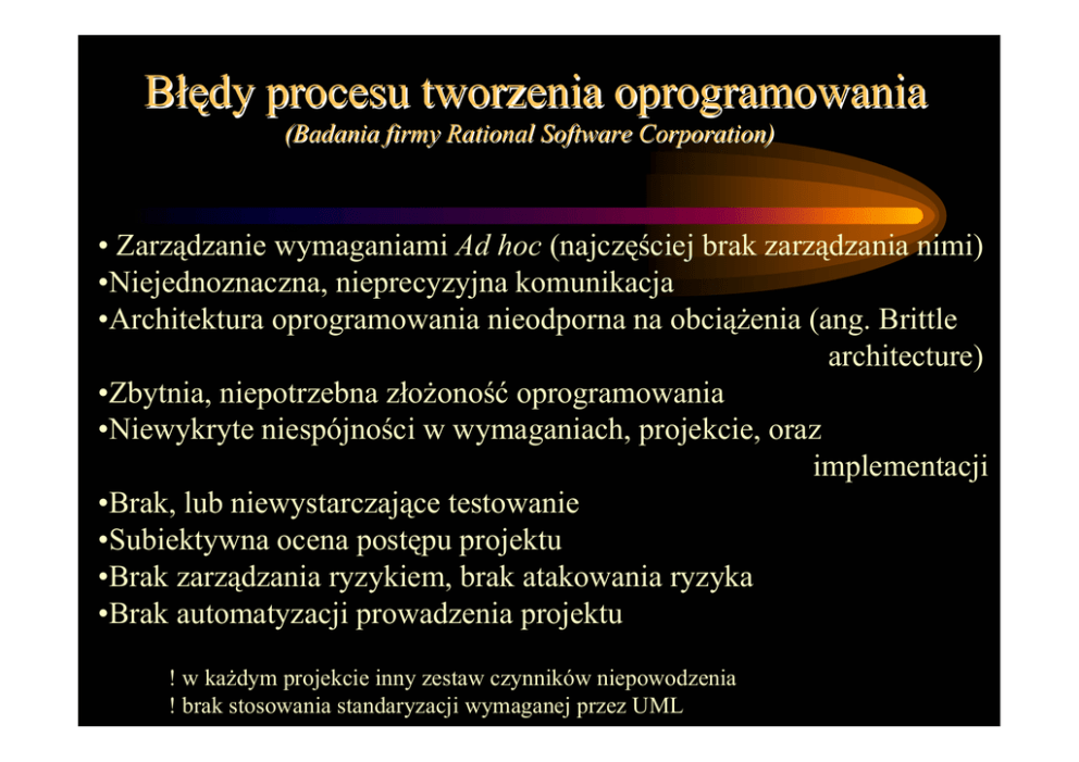 Błędy procesu tworzenia oprogramowania (Badania firmy Rational Software Corporation) • Zarządzanie wymaganiami Ad hoc (najczęściej brak zarządzania nimi) •Niejednoznaczna, nieprecyzyjna komunikacja •Architektura oprogramowania nieodporna na obciążenia (ang. Brittle architecture) •Zbytnia, niepotrzebna złożoność oprogramowania •Niewykryte niespójności w wymaganiach, projekcie, oraz implementacji •Brak, lub niewystarczające testowanie •Subiektywna ocena postępu projektu •Brak zarządzania ryzykiem, brak atakowania ryzyka •Brak automatyzacji prowadzenia projektu ! w każdym projekcie inny zestaw czynników niepowodzenia ! brak stosowania standaryzacji wymaganej przez UML FAZA STRATEGICZNA określenie wymagań Faza strategiczna specyfikowanie projektowanie Analiza kodowanie implementacja Synteza Dokumentacja testowanie produkt konserwacja Instalacja - rozmowy z klientami (przedstawicielami) - cele przedsięwzięcia z pkt. widzenia klienta - zakres i kontekst przedsięwzięcia -ogólne określenie wymagań – wykonanie wstępnej analizy i projektu systemu -propozycja kilku sposobów realizacji systemu - szacowanie kosztów oprogramowania -analiza rozwiązań -prezentacja wyników analizy klientowi – korekta -budowa wstępnego harmonogramu -określenie standardów wg których będzie realizowane przedsięwzięcie MODELE CYKLU ŻYCIA OPROGRAMOWANIA Model spiralny – model interaktywny (Boehma – 1988) – cztery główne fazy cyklu życia oprogramowania wykonywane cyklicznie: analiza ryzyka, konstrukcja, atestowanie, planowanie. Analiza ryzyka (identyfikacja Analiza ryzyka w Planowanie zagrożeń wewnętrznych – z możliwością oparciu o wymagania Wymagania począt. planowanie proj. Planowanie – wyniki kontaktu z klientem kontroli i zewnętrznych bez kontroli unique element) Analiza ryzyka w oparciu o reakcje klienta Go, no-go decision Customer evaluation Atestowanie Iteracje 1,2 Konstrukcja (model kaskadowy) Model spiralny jest raczej tzw modelem referencyjnym albo inaczej metamodelem dla innych model Model spiralny jest tak naprawdę „sposobem myślenia „ o tworzeniu oprogramowania na rynek Baza RUP (Przyczyny powstania Najczęstsze błędy) • Zarządzanie wymaganiami Ad hoc (najczęściej brak zarządzania nimi) •Niejednoznaczna, nieprecyzyjna komunikacja •Architektura oprogramowania nieodporna na obciążenia (ang. Brittle architecture) •Zbytnia, niepotrzebna złożoność oprogramowania •Niewykryte niespójności w wymaganiach, projekcie, oraz implementacji •Brak, lub niewystarczające testowanie •Subiektywna ocena postępu projektu •Brak zarządzania ryzykiem, brak atakowania ryzyka •Brak automatyzacji prowadzenia projektu Baza RUP (Zasady IO + najlepsze praktyki programistyczne) • Iteracyjnym wytwarzaniu oprogramowania (Iterative Development) •Zarządzaniu wymaganiami (Requirement Management) •Używaniu architektury bazującej na komponentach (Component-based architecture) •Graficznym projektowaniu oprogramowania •Kontroli jakości oprogramowania (Quality Assurance) •Procesu kontroli zmian w oprogramowaniu (Change Management) Iterative development (Zasady IO + najlepsze praktyki programistyczne) Przyczyny zmiany wymagań: - ograniczenia architektury - zmiany potrzeb użytkowników - lepsze zrozumienie problemu Dlatego podejście iteracyjne i przyrostowe pozwalające na • • • • • • Integracja oprogramowania robiona krok po kroku podczas wytwarzania oprogramowania, ograniczając go do mniejszej liczby elementów Integracja jest prostsza i mniej kosztowna Składowe oprogramowania są projektowane oddzielnie i łatwiej poddają się reużywalności Łatwiej wykrywać zmiany wymagań i łatwiej nimi zarządzać Ryzyka identyfikowane i atakowane są wcześnie ponieważ każda iteracja pozwala wykryć kolejne ryzyka W iteracjach ulepszana jest architektura oprogramowania MODELE CYKLU ŻYCIA OPROGRAMOWANIA Rational Unified Process (RUP-1998) (2000 – IBM) (IBM – 2003) – coś więcej niż model cyklu życia oprogramowania. Środowisko (RUP platform) dla programistów obejmujące szereg narzędzi asystujących i prowadzących twórców programowania w dwóch wymiarach Analysis and design Management Configuration Management Plan n ing trzy wspomagające: Business modeling Initial planning uat Eval st Environment Te - modelowanie biznesowe -identyfikacja wymagań -analiza i projektowanie -implementacja -testowanie -osadzenie systemu Requir ements sześć przepływów aktywności: n entatio Implem WYMIAR WERTYKALNY ion WYMIAR HORYZONTALNY (aspekt dynamiczny cyklu – upływ czasu): Inception - powstanie, rozpoczęcie (analiza wykonalności) Elaboration – szczegółowe dopracowanie (analiza dziedziny problemu) Construction – budowa, konstrukcja Transition – przejście, (przekazanie systemu) Deployment Metodyka wytwarzania oprogramowania – proces iteracyjnego wytwarzania oprogramowania
